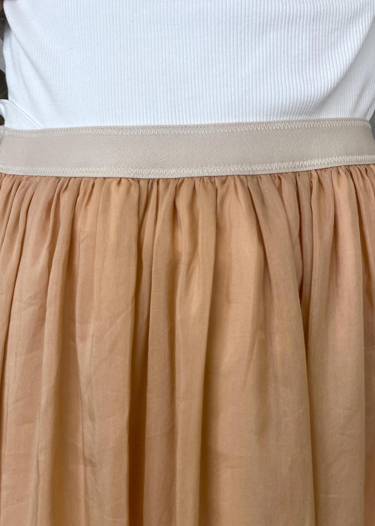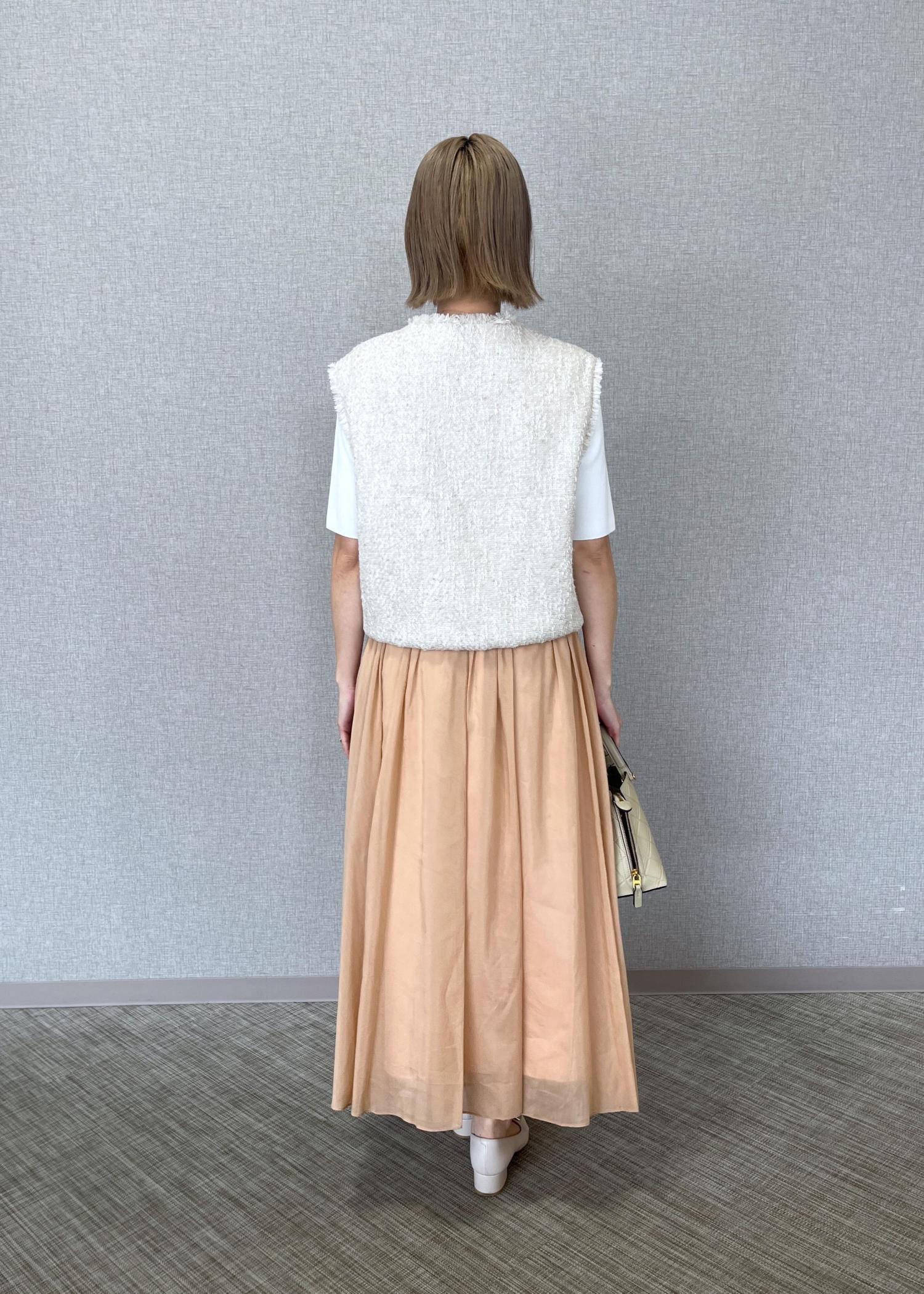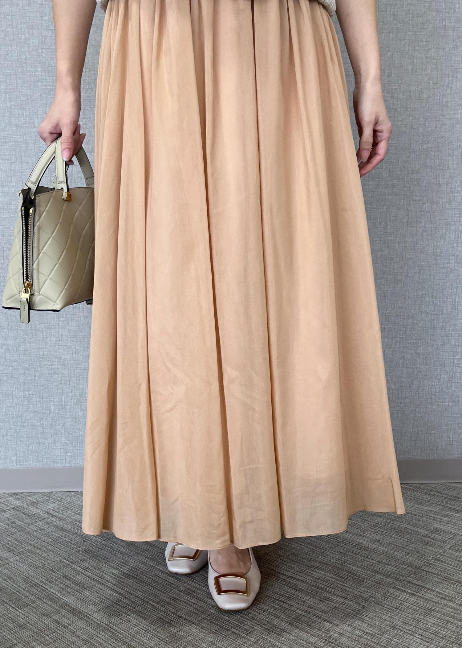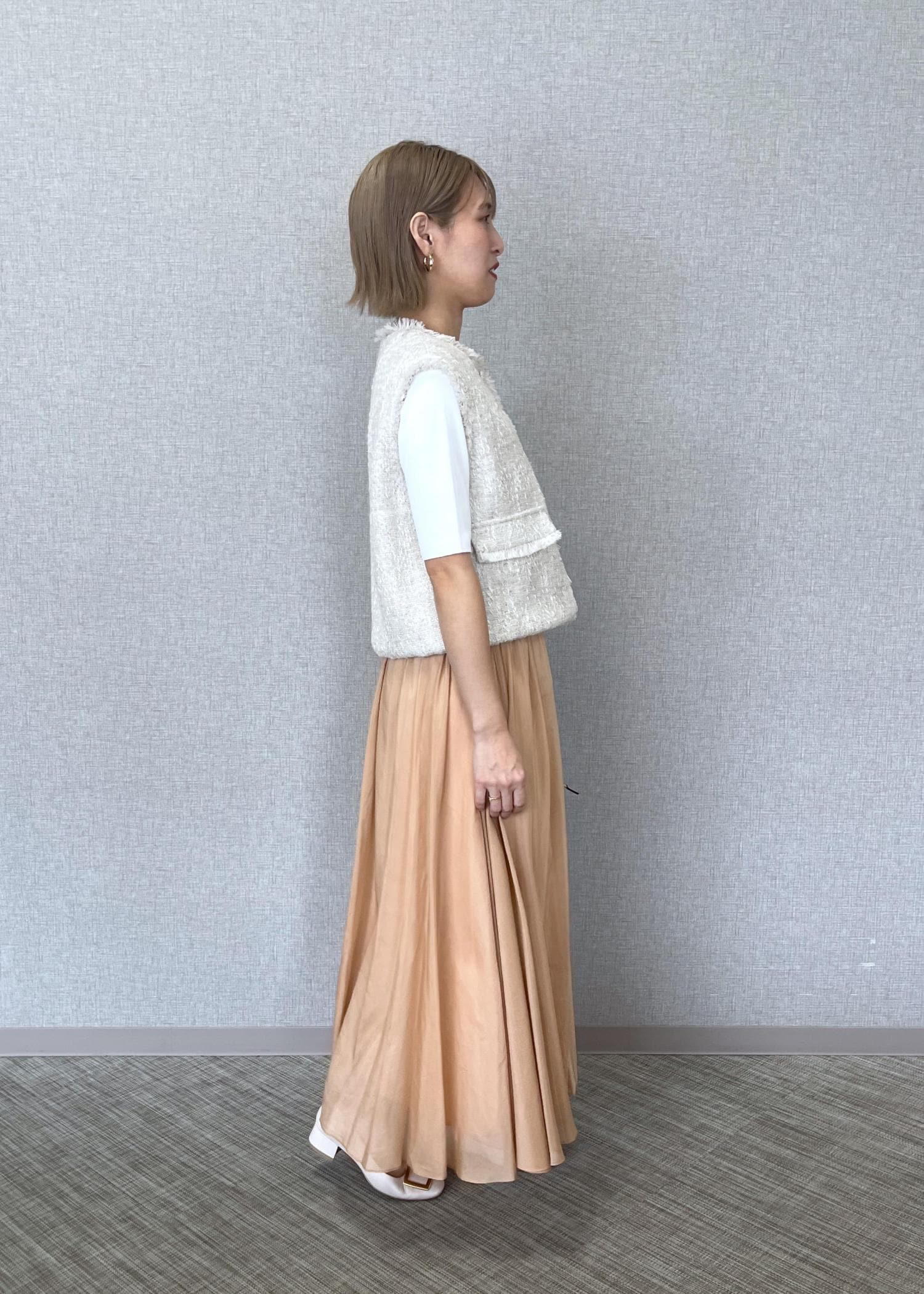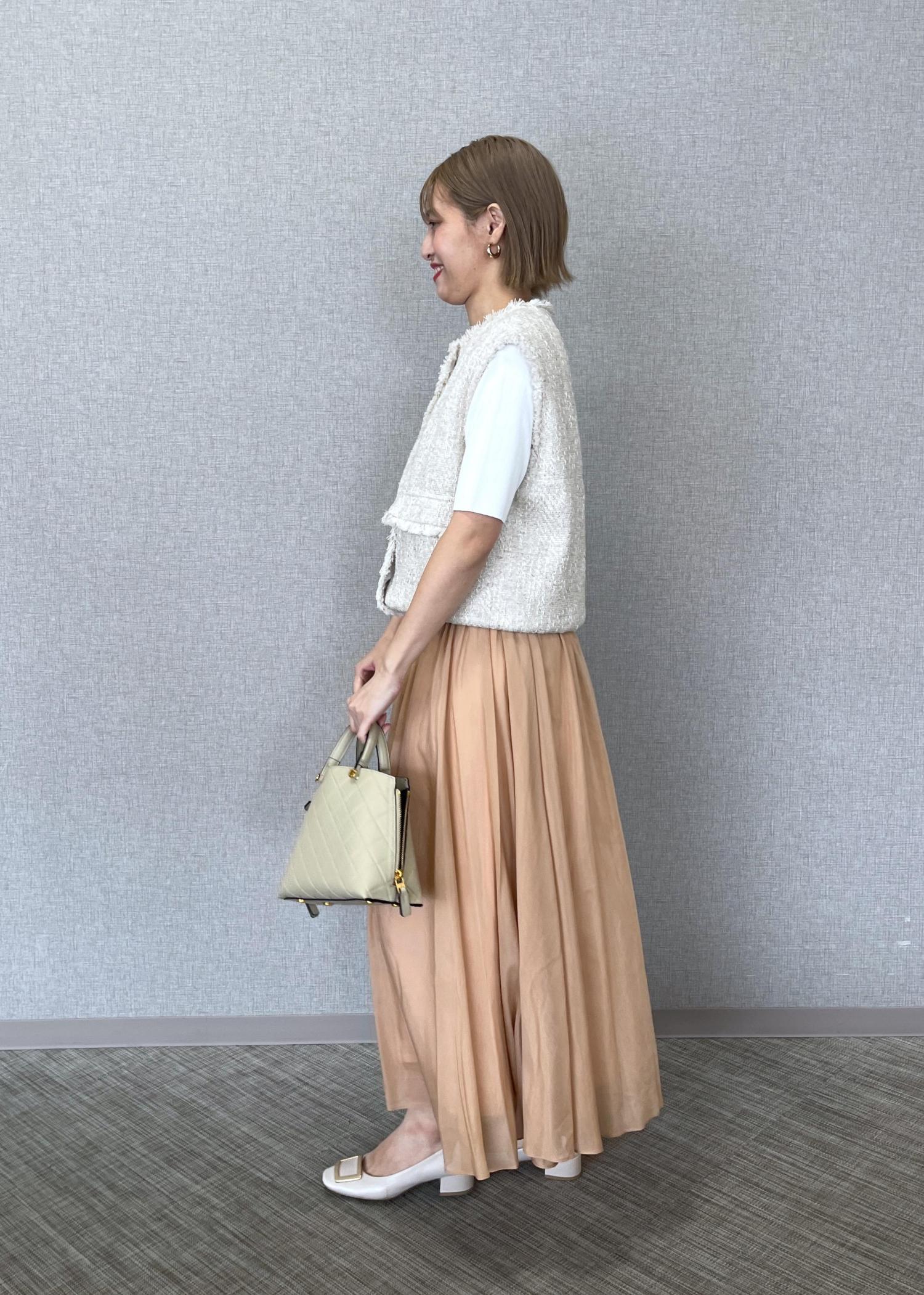 シフォンのスカートをメインにコーデを組んでみました。素材違いでのワントーンコーデはすっきりしてまとまりが出るのでおすすめです。