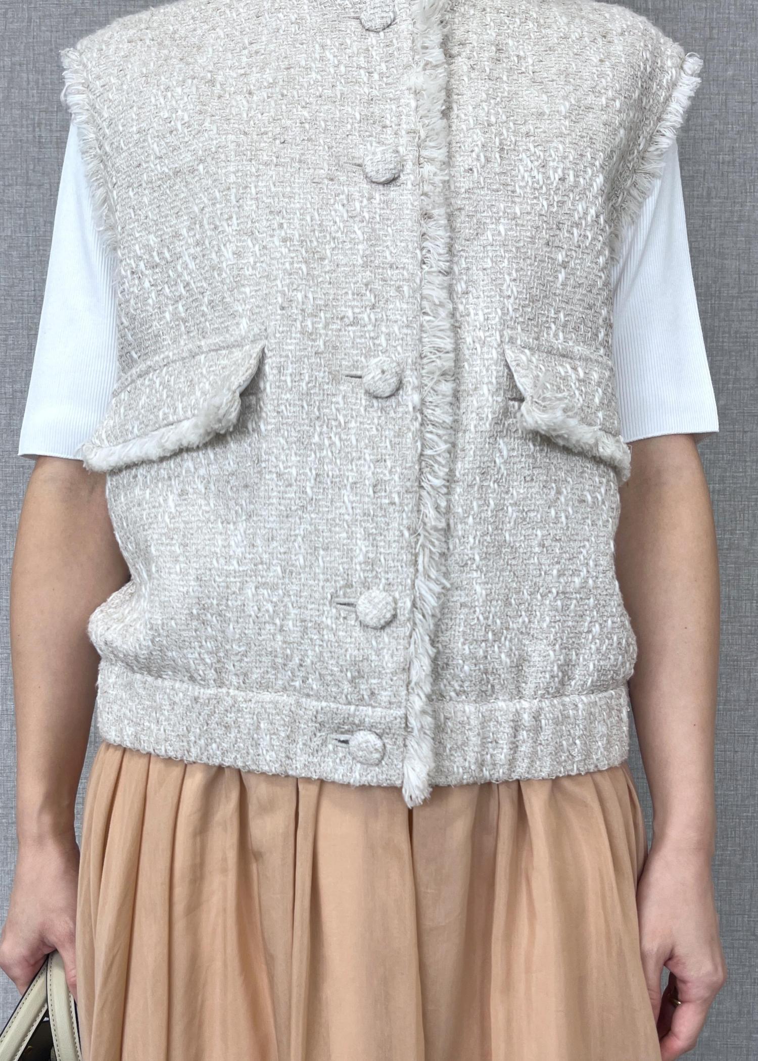 コーデのアクセントにカーディガンのようにさらっと着れる形のジレです。