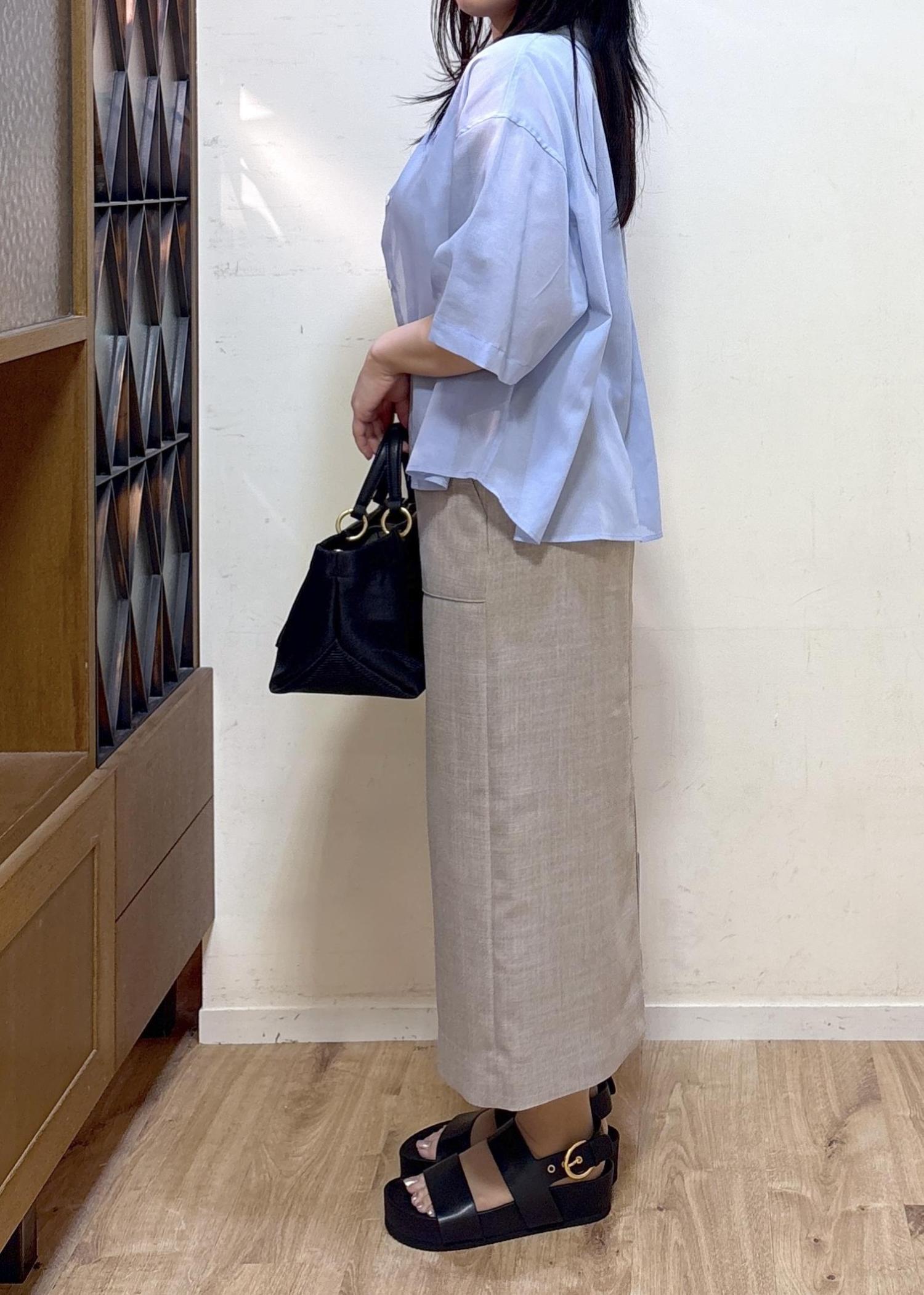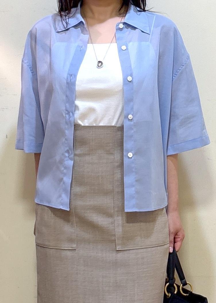 さりげないシアー感が大人の上品な印象のシャツスタイルです。