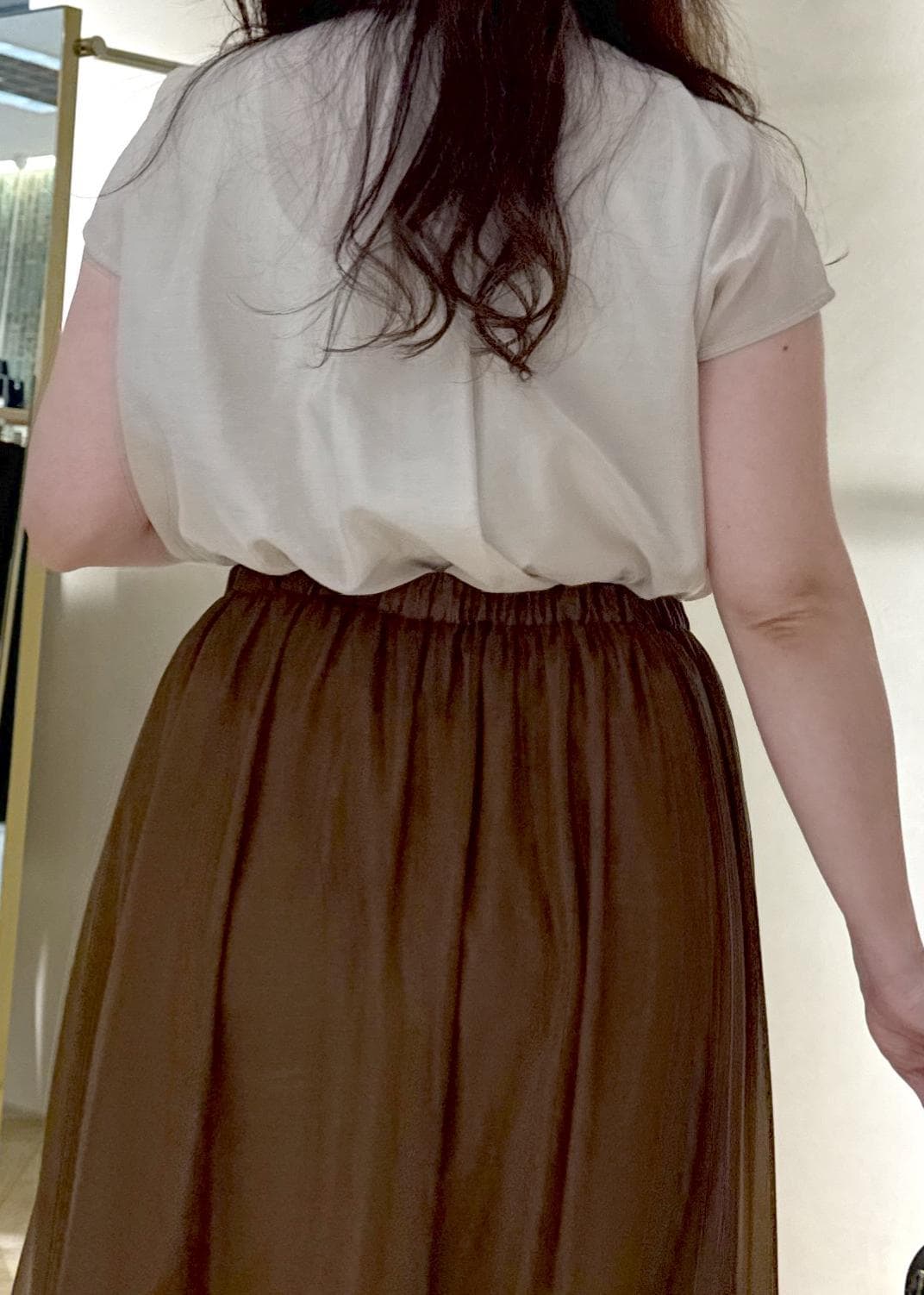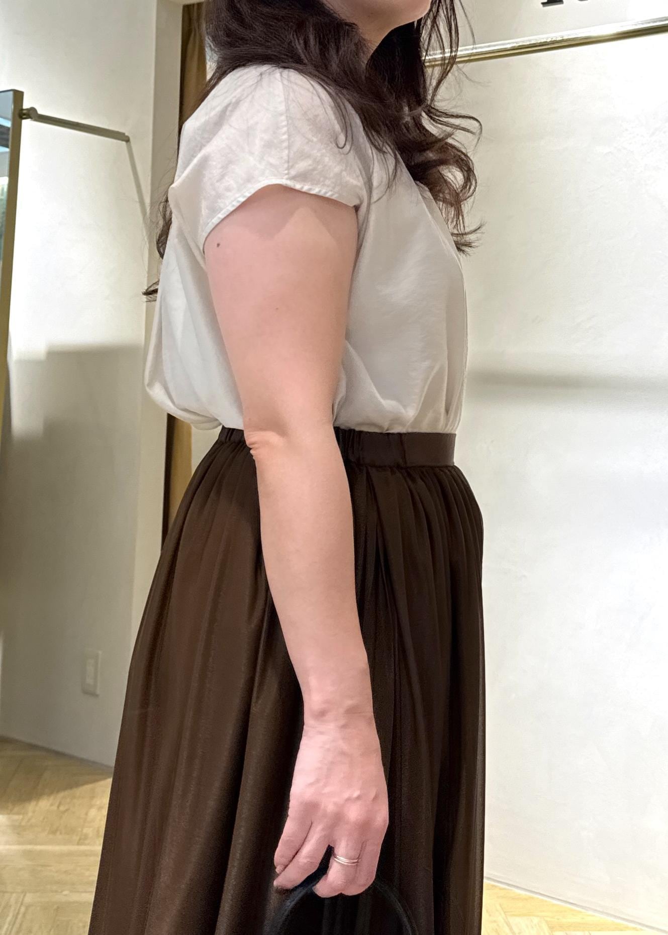 ギャザーなので広がるかなと思いましたが薄い生地なのでボリューム感が出にくいなと思いました。思ったよりお腹周りも気になりませんでした。