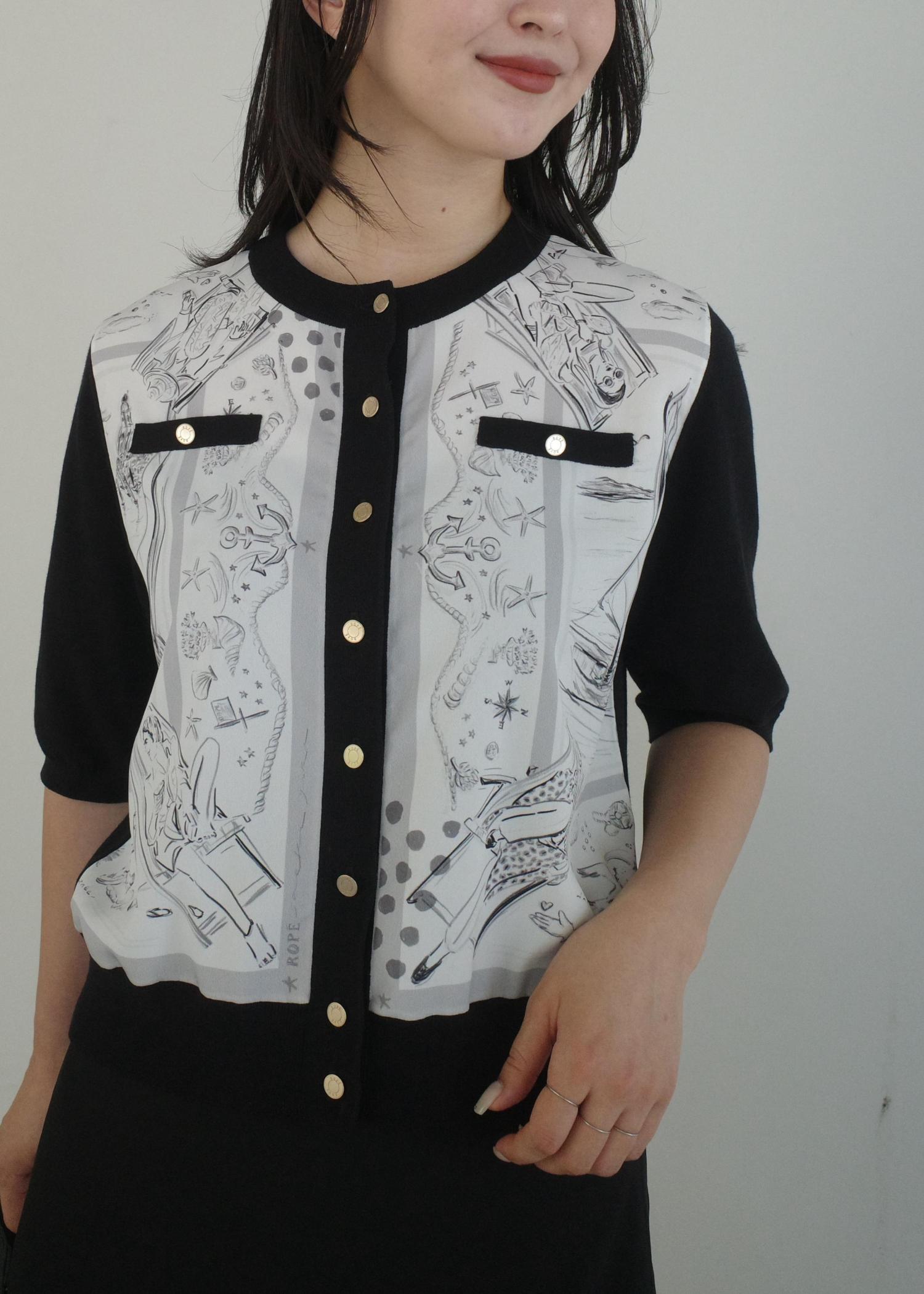 ROPÉ【洗える】【YUKO SAEKI for ROPE'・コラボ】スカーフ柄プリント カーディガンブラウスブラック / F¥27,500レビュー163cmでFサイズ着用。