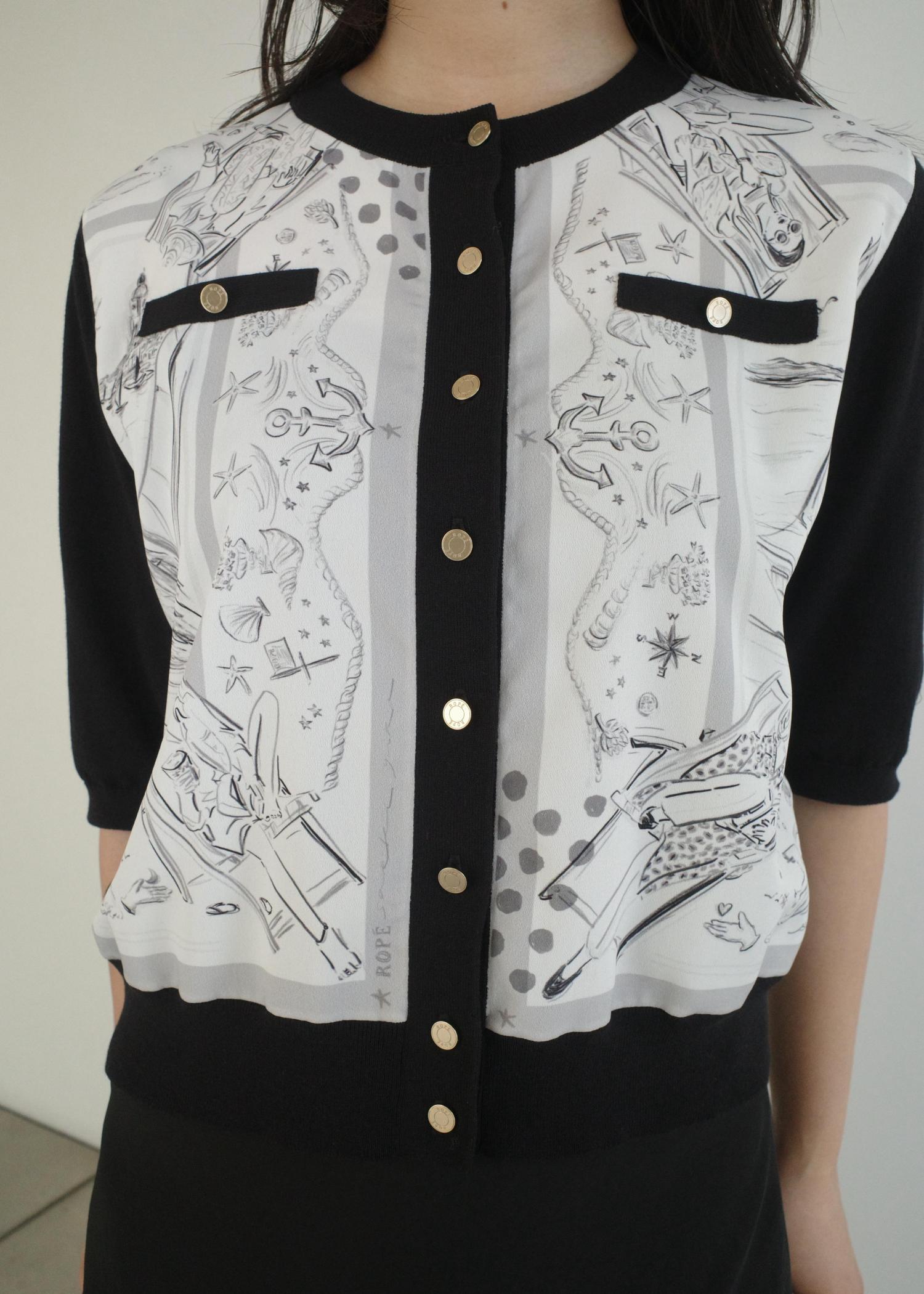 ロペで人気を博したスカーフ柄カーディガンを今季はイラストレーターの佐伯ゆうこさん書き下ろしデザインを反映。