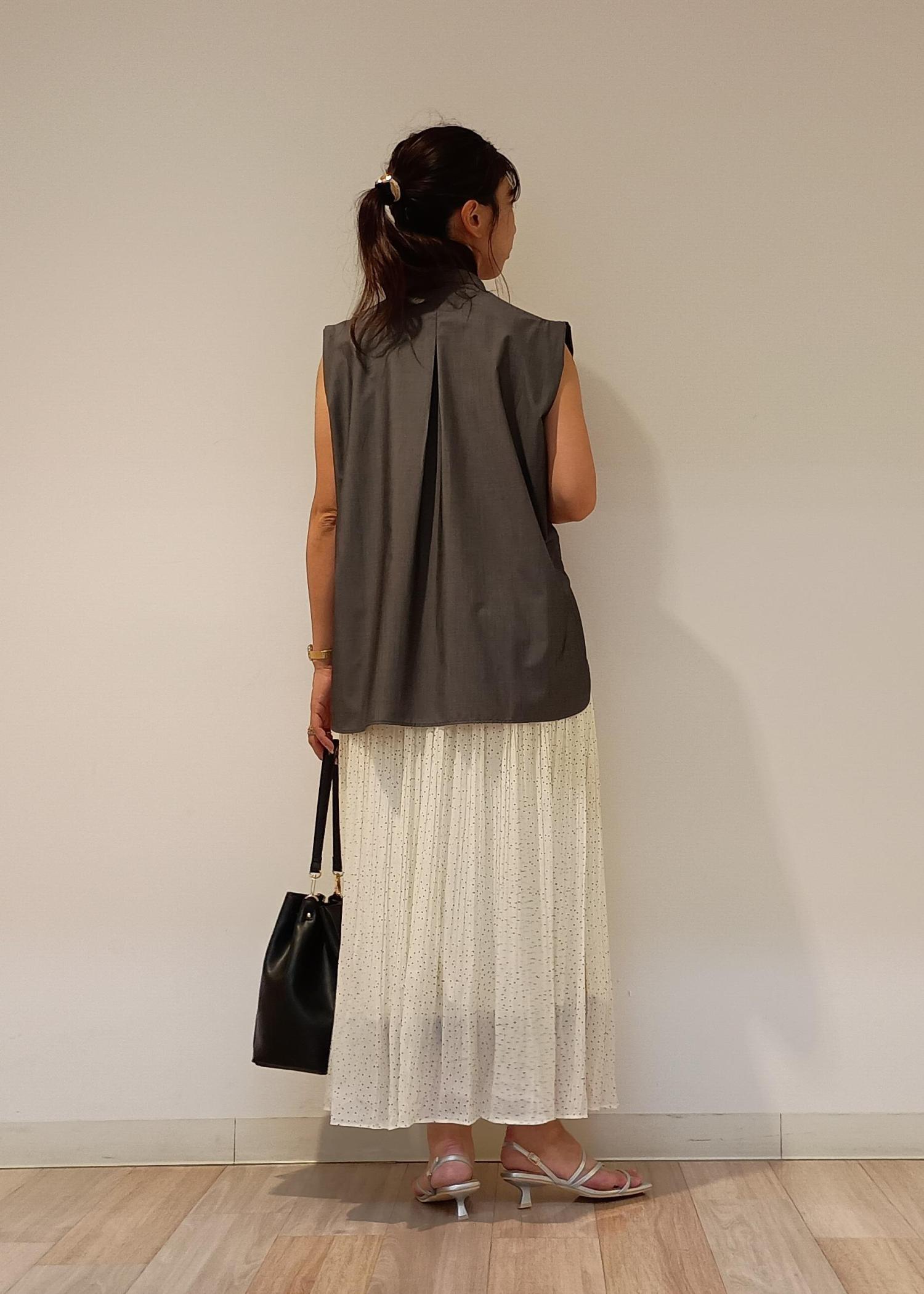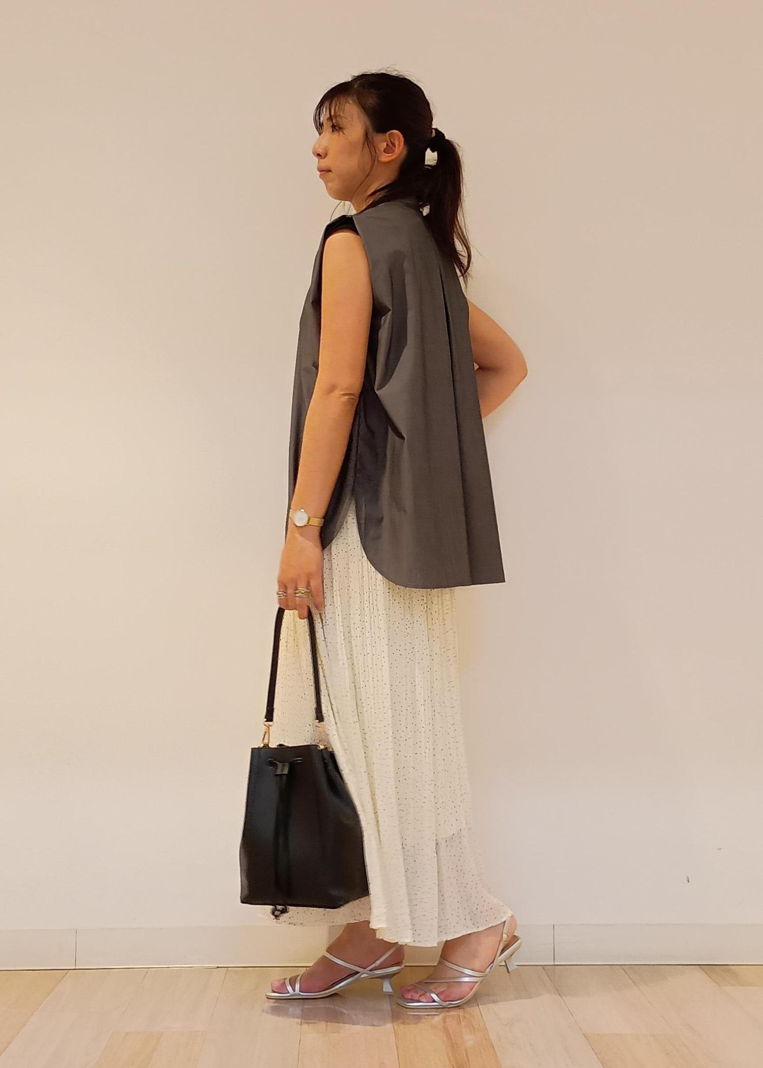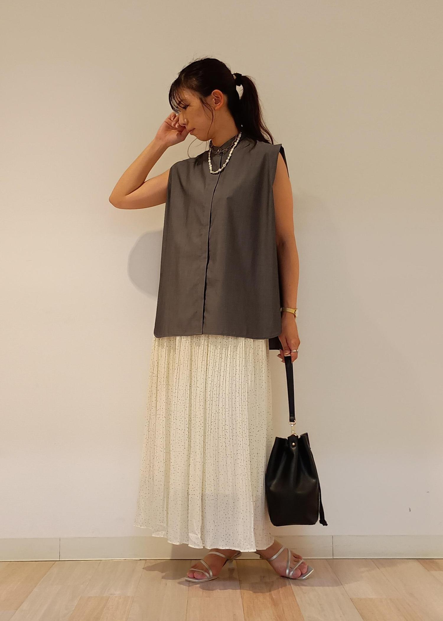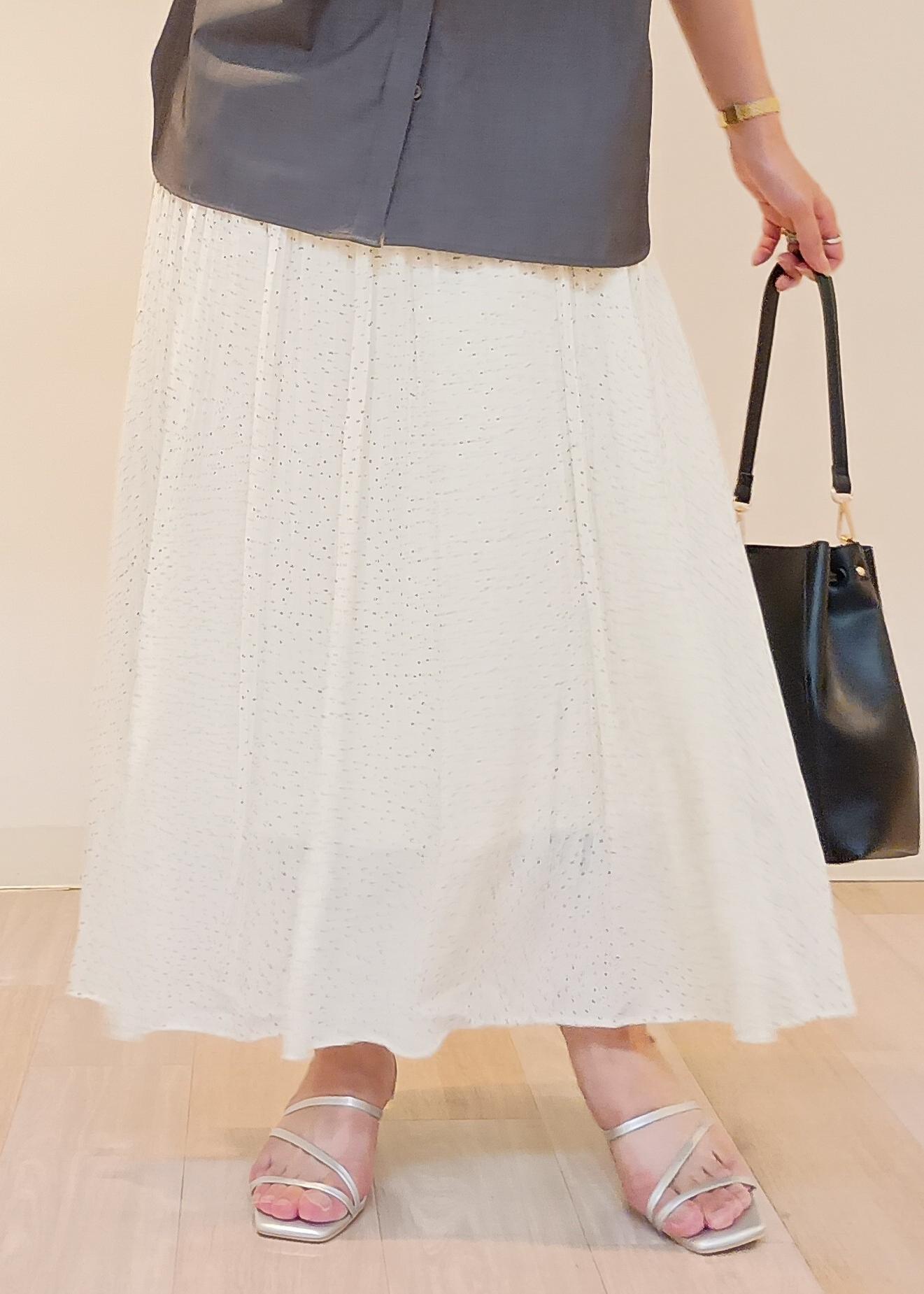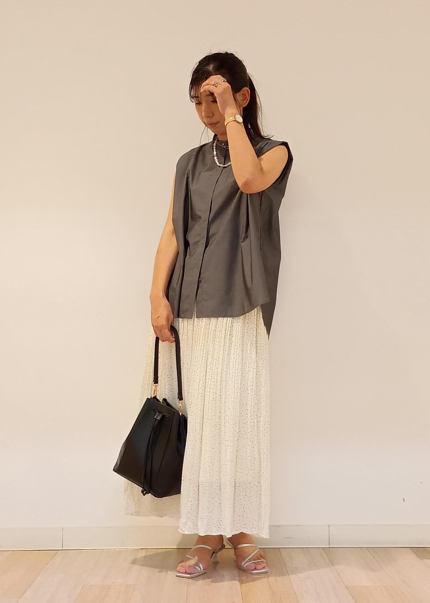 軽やかさのあるカラーで合わせた涼し気な印象のモノトーンコーデです。シルエットはゆったりとしていてリラックス感があるのに、ハリのあるシャツと柔らかさのあるスカートの、素材のコントラストでメリハリあるスタイリングになっています。