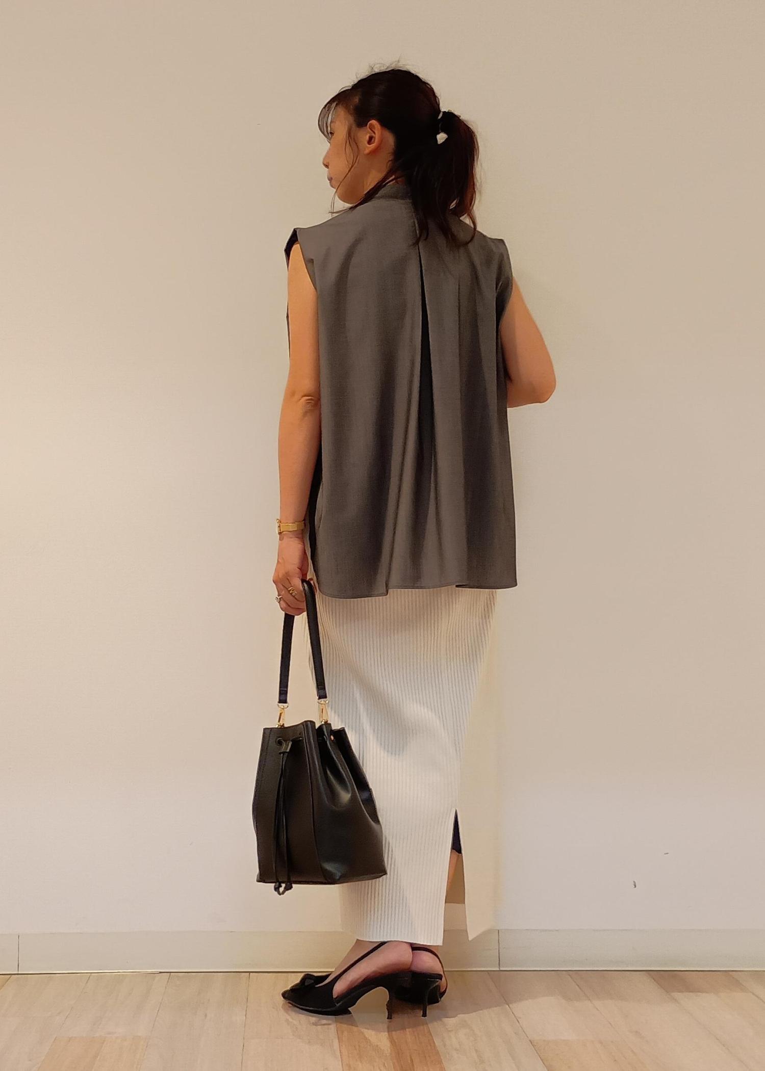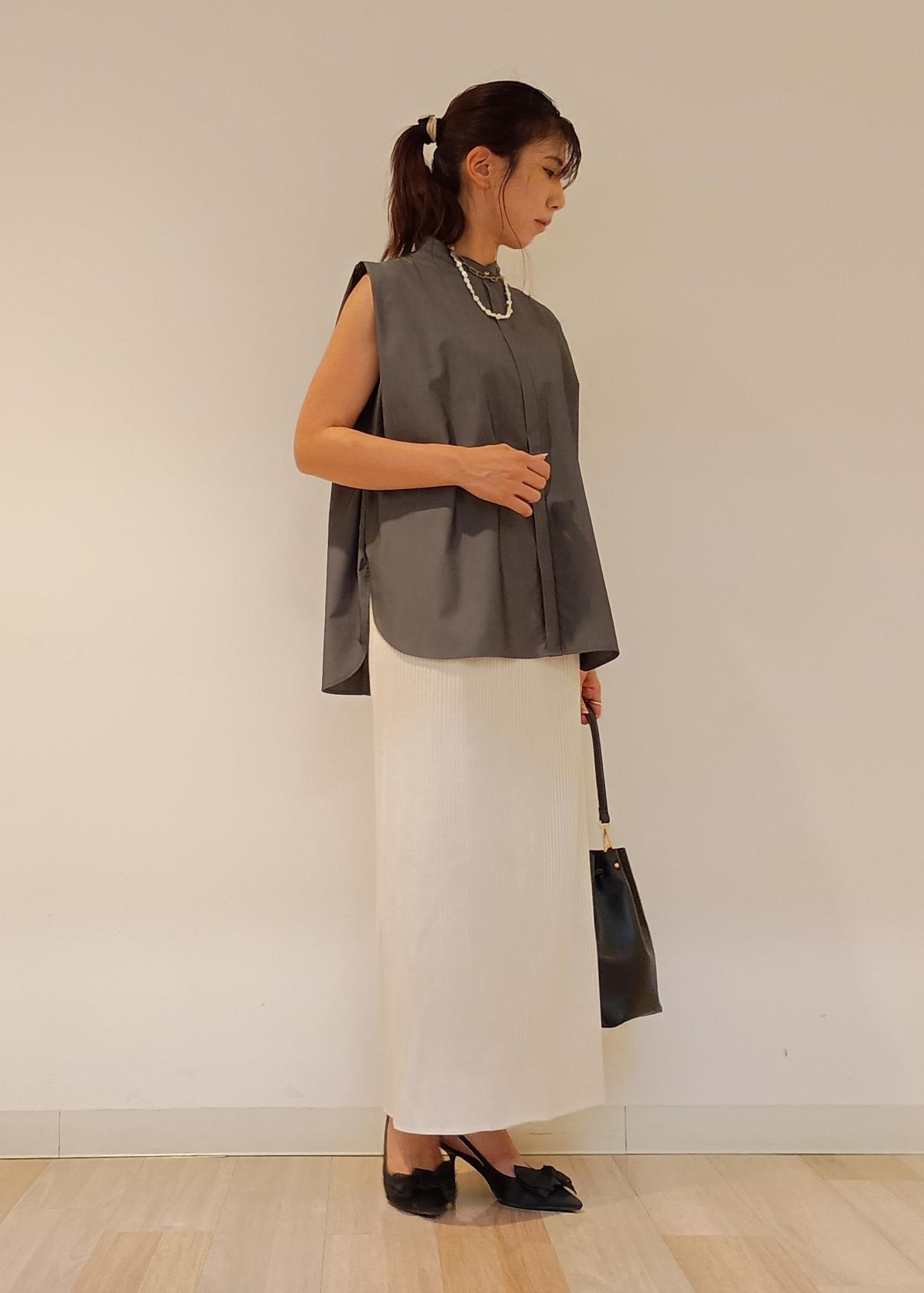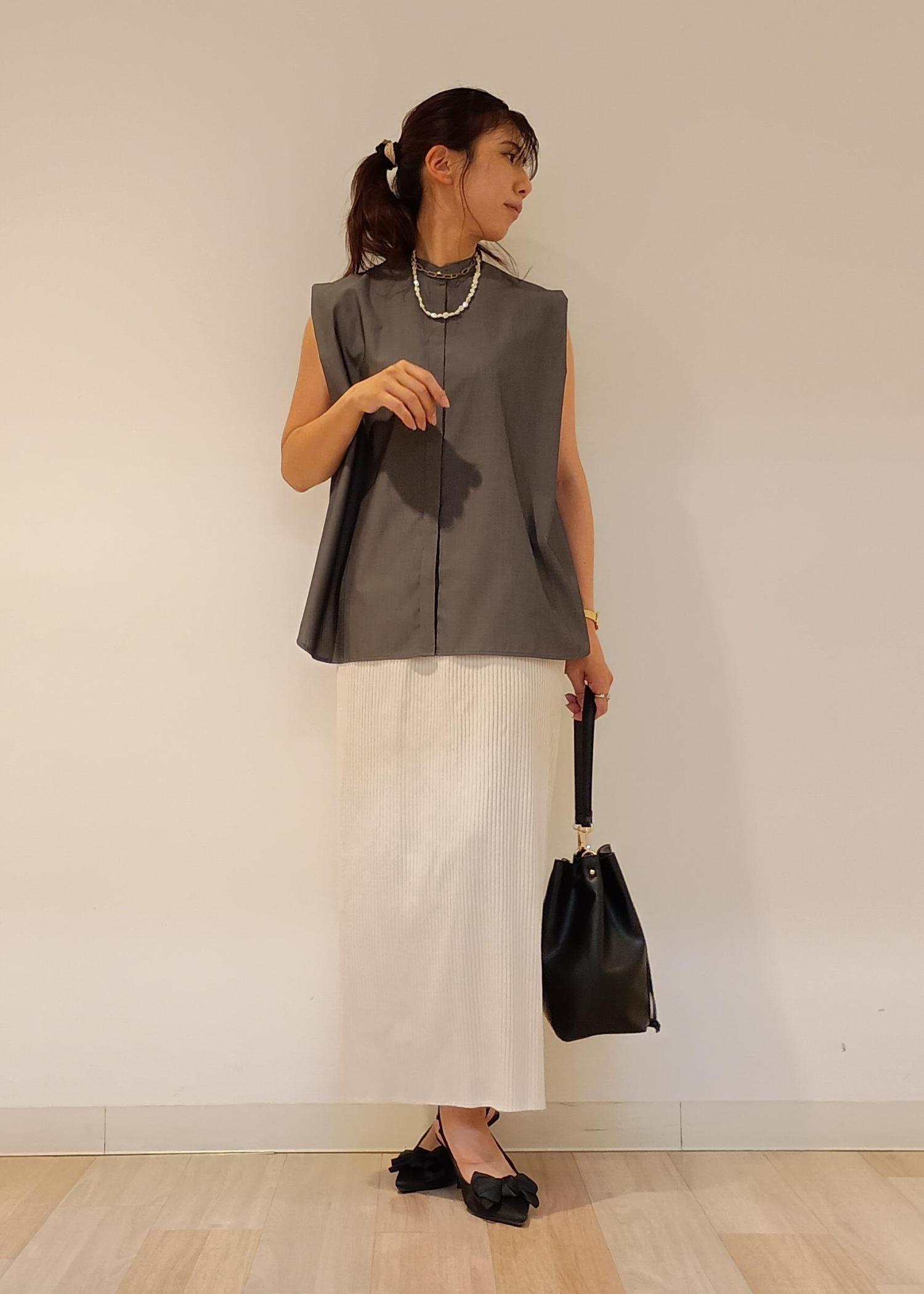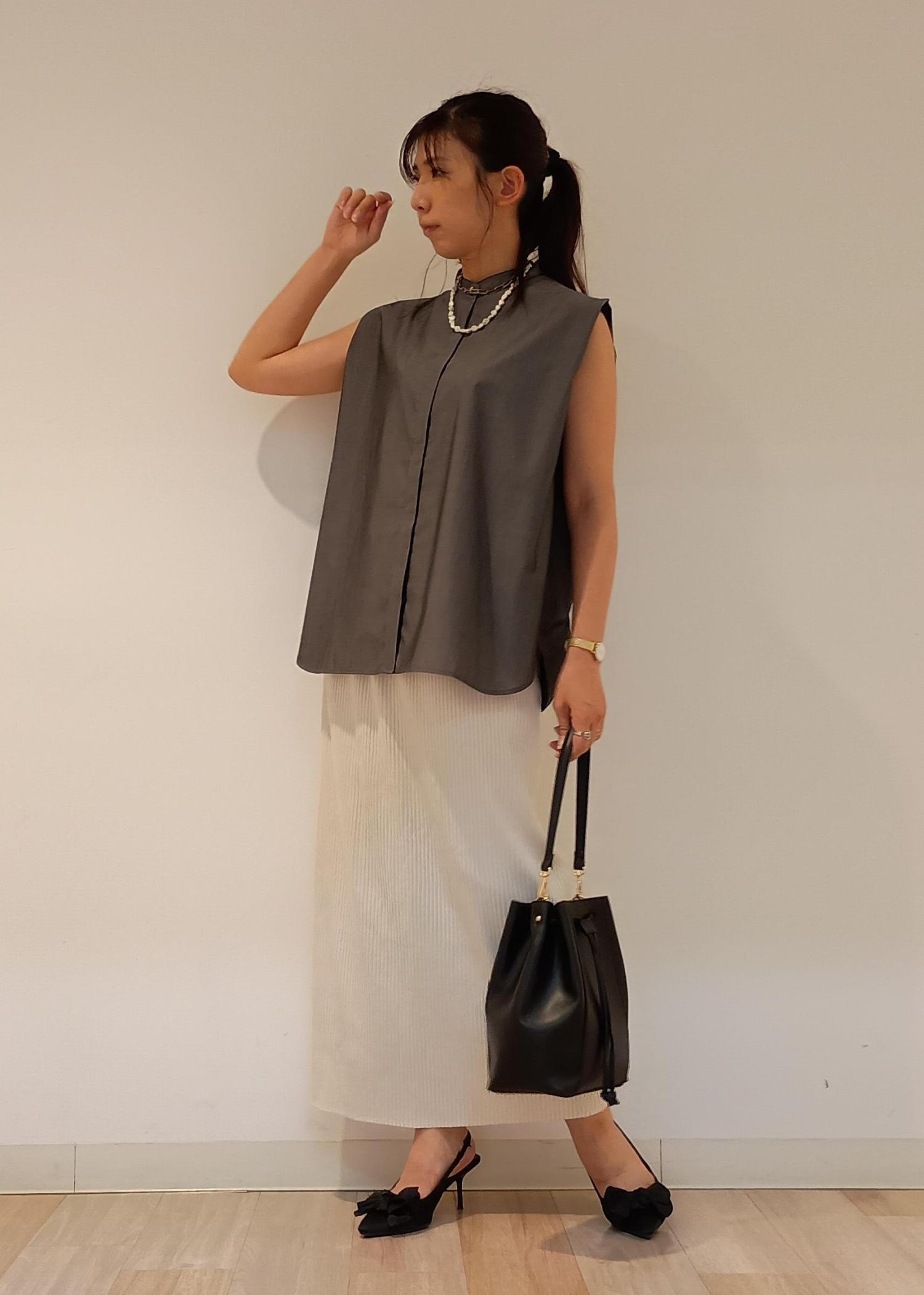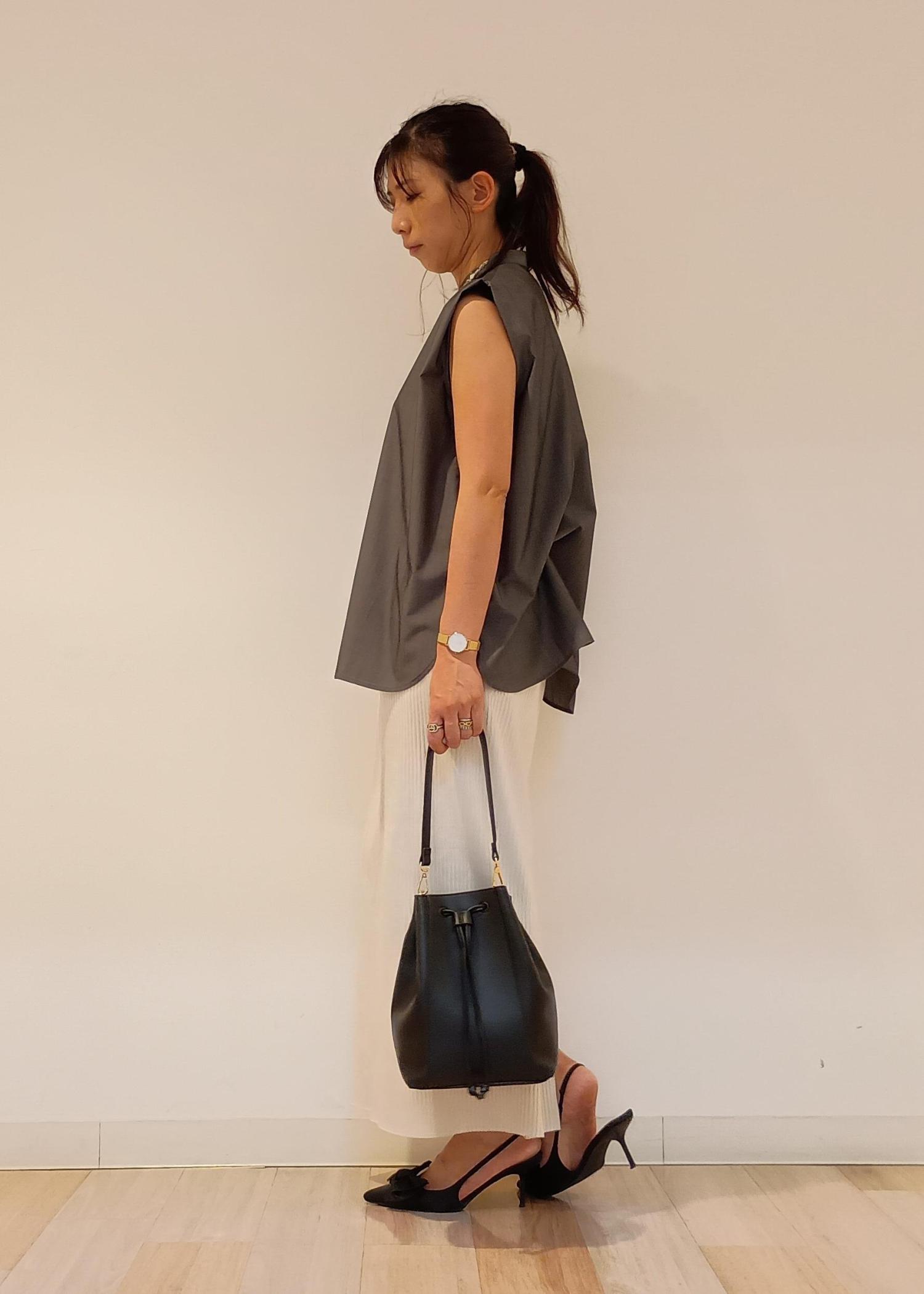 ゆったりとしたシルエットでリラックス感があるシャツを涼しげに合わせた大人カジュアルスタイル。ボトムスにタイトめなシルエットを持ってきたことで、ゆるっとしすぎないキレイめな印象に。テーパードパンツなどとの着回もオススメです。
