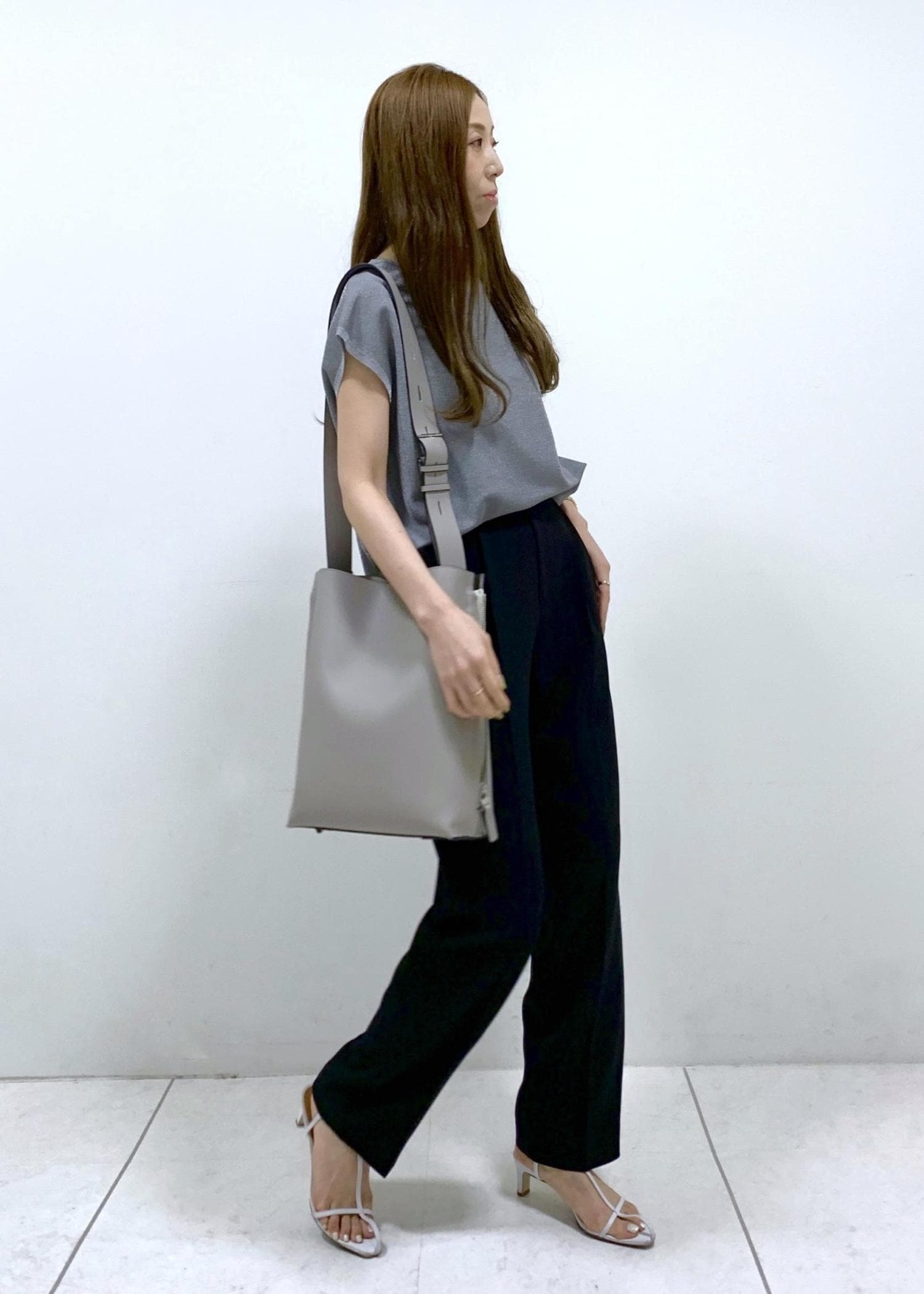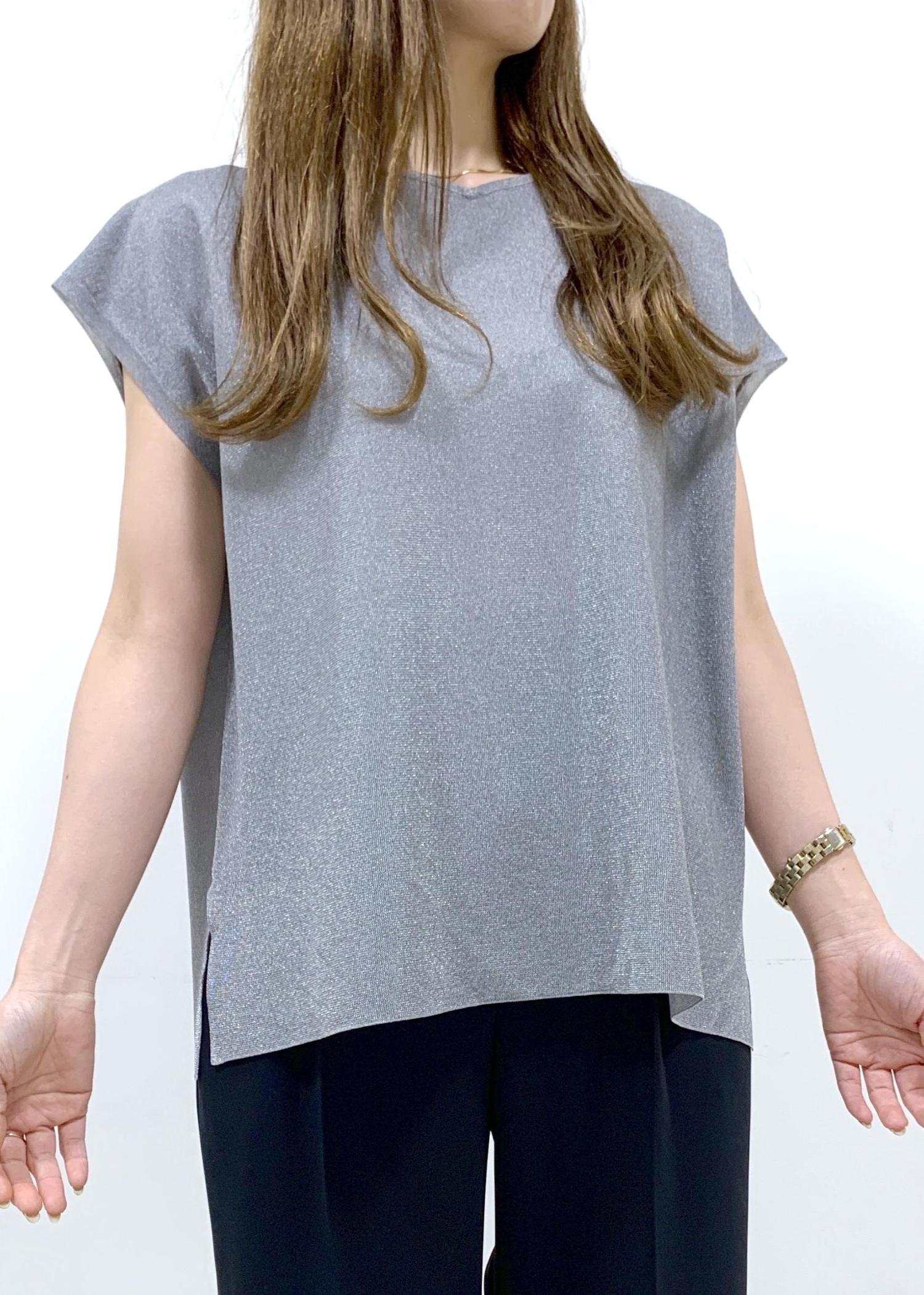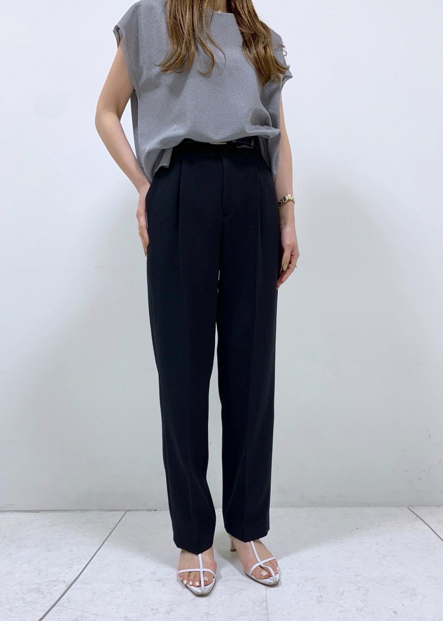 シルバーのラメが涼しげなフレンチプルオーバーに、センタープレスで綺麗な形のテーパードパンツを合わせたお仕事にもお勧めなstyleです。
