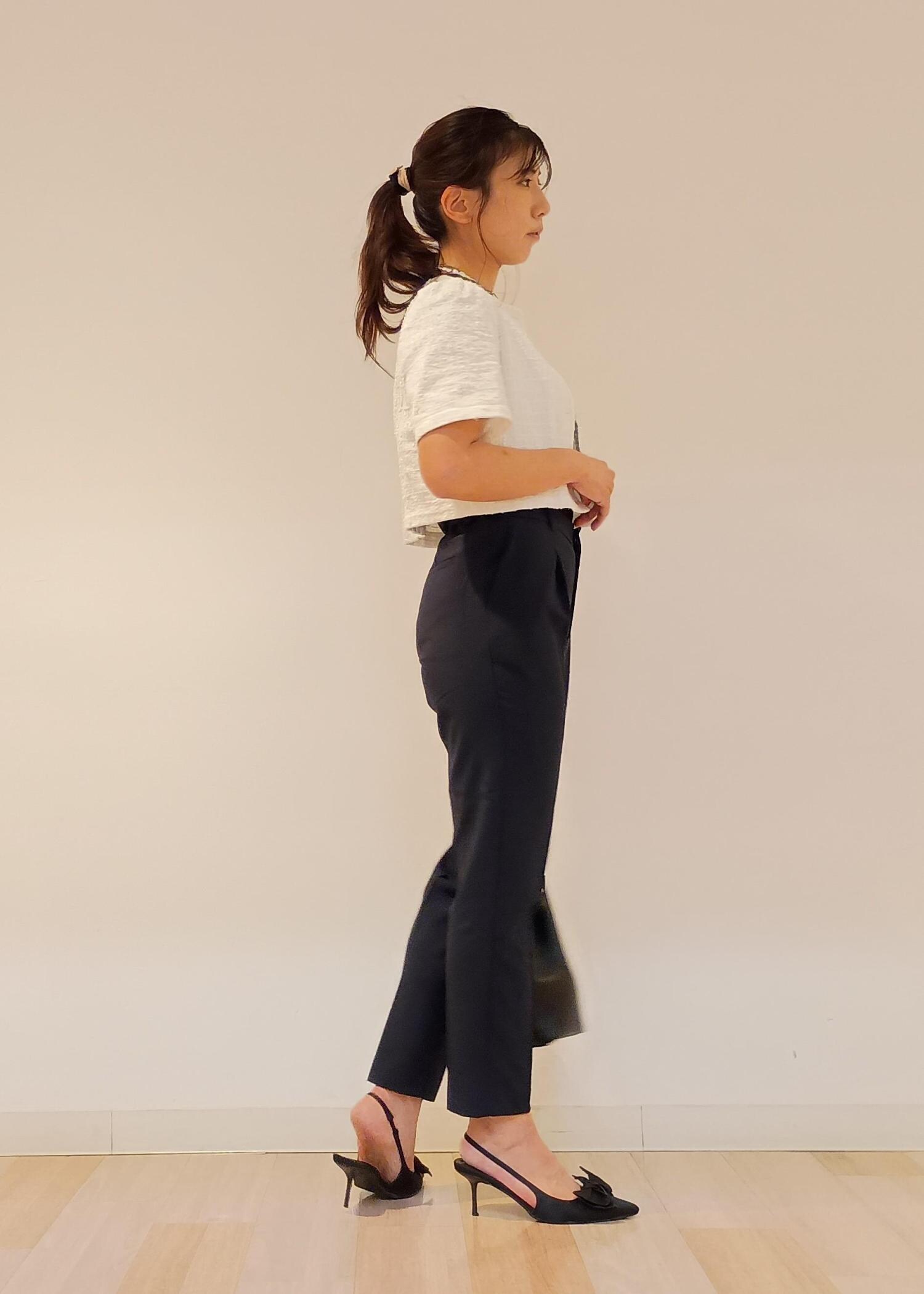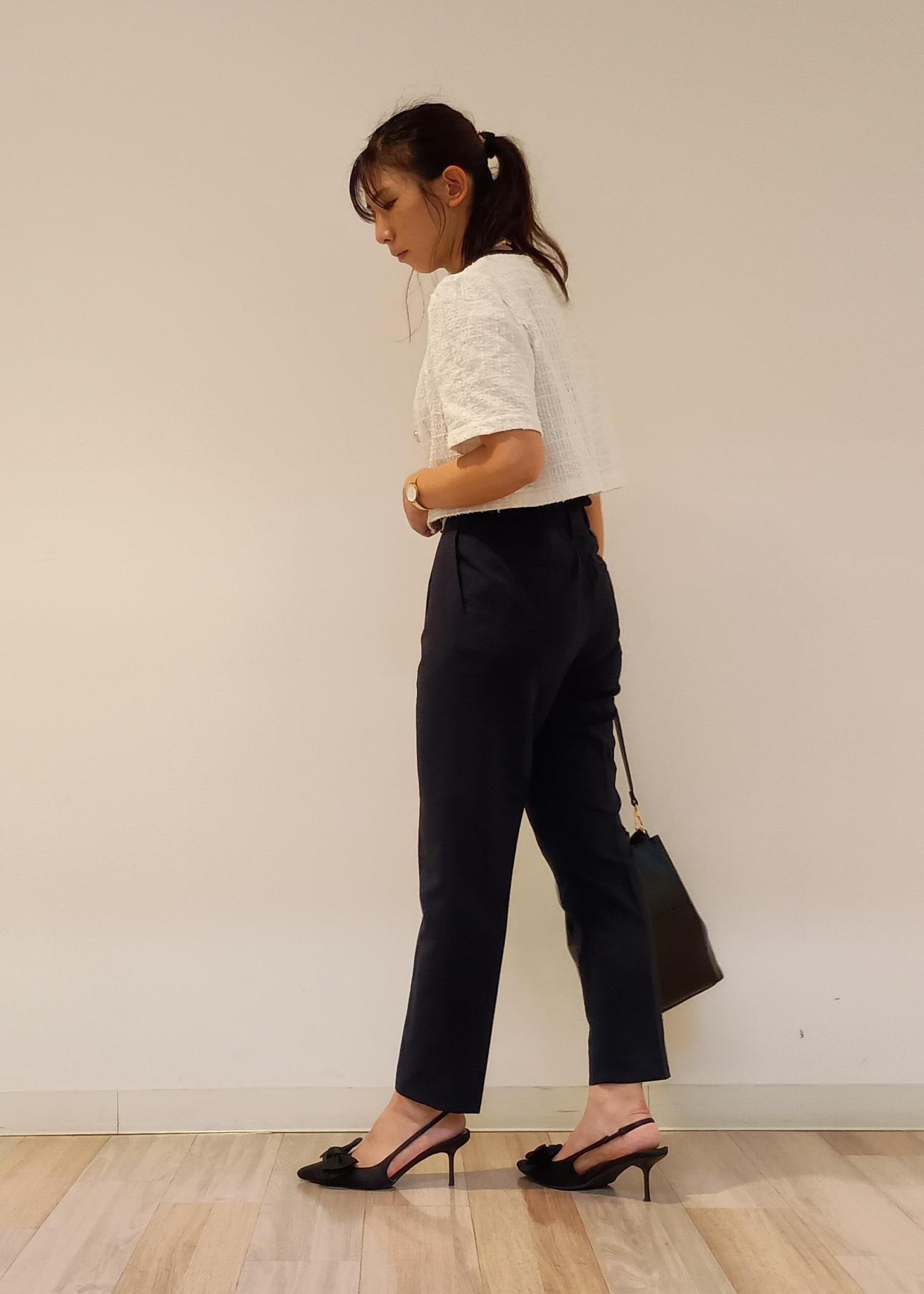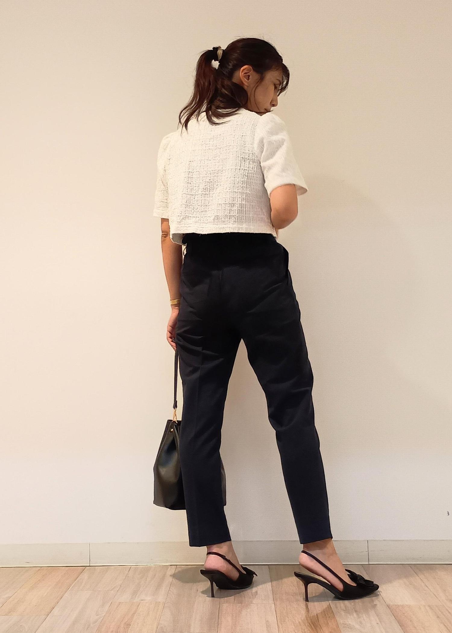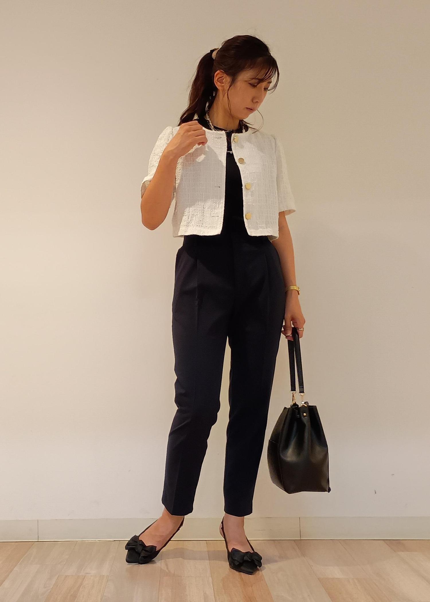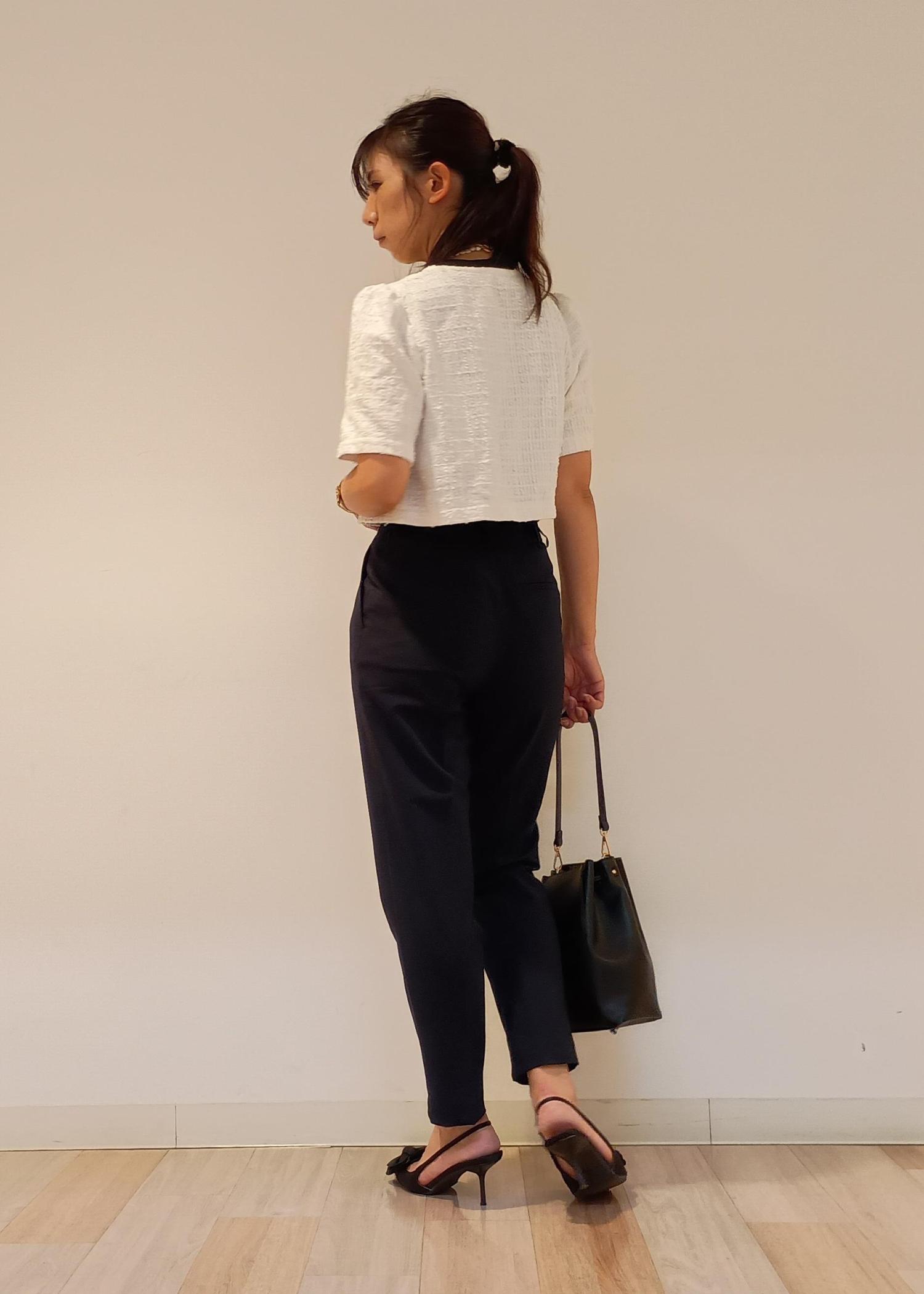 オフィスシーンにもおすすめのきれいめカジュアルコーデ。色味を抑えて大人っぽく、落ち着きのある印象に。ショートめな丈感のジャケットを細身のテーパードパンツに合わせて全体的にスッキリとしたコーディネートになっています。