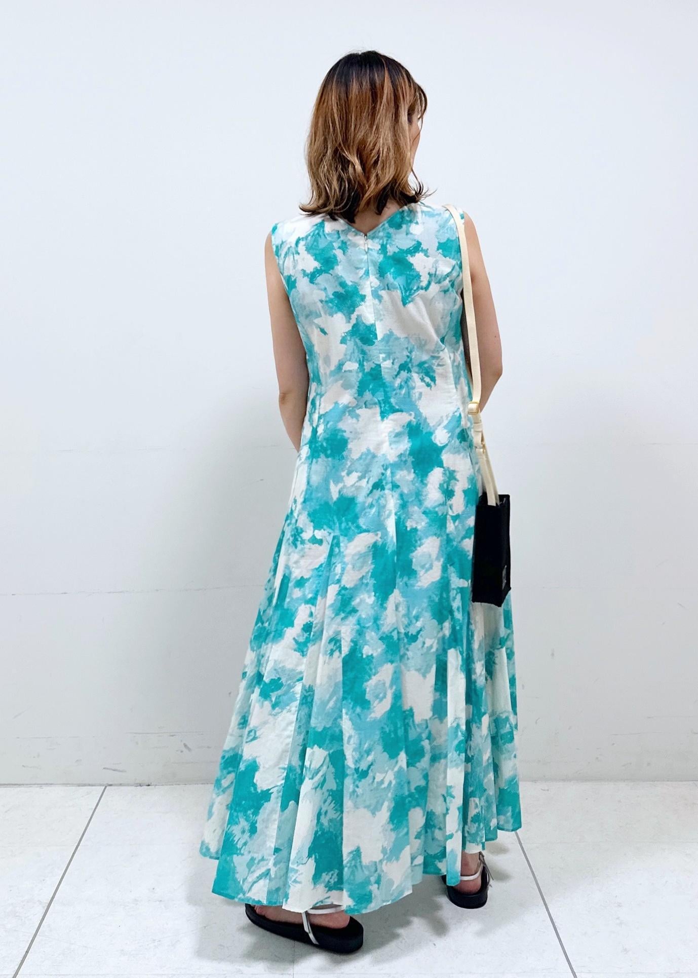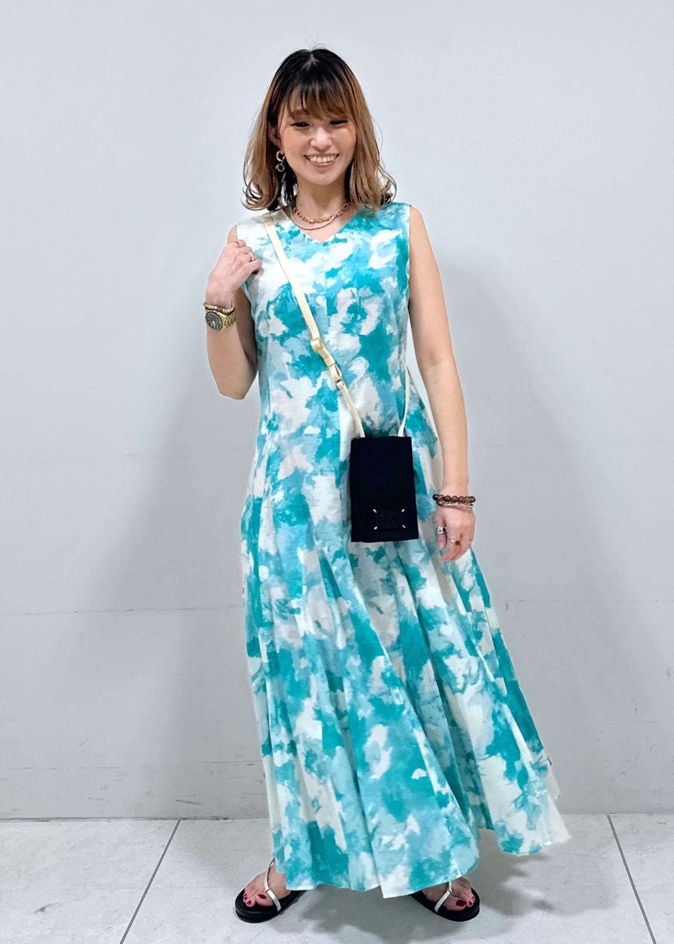 夏らしい配色の柄ワンピースを、フラットサンダルでカジュアルダウンさせました。