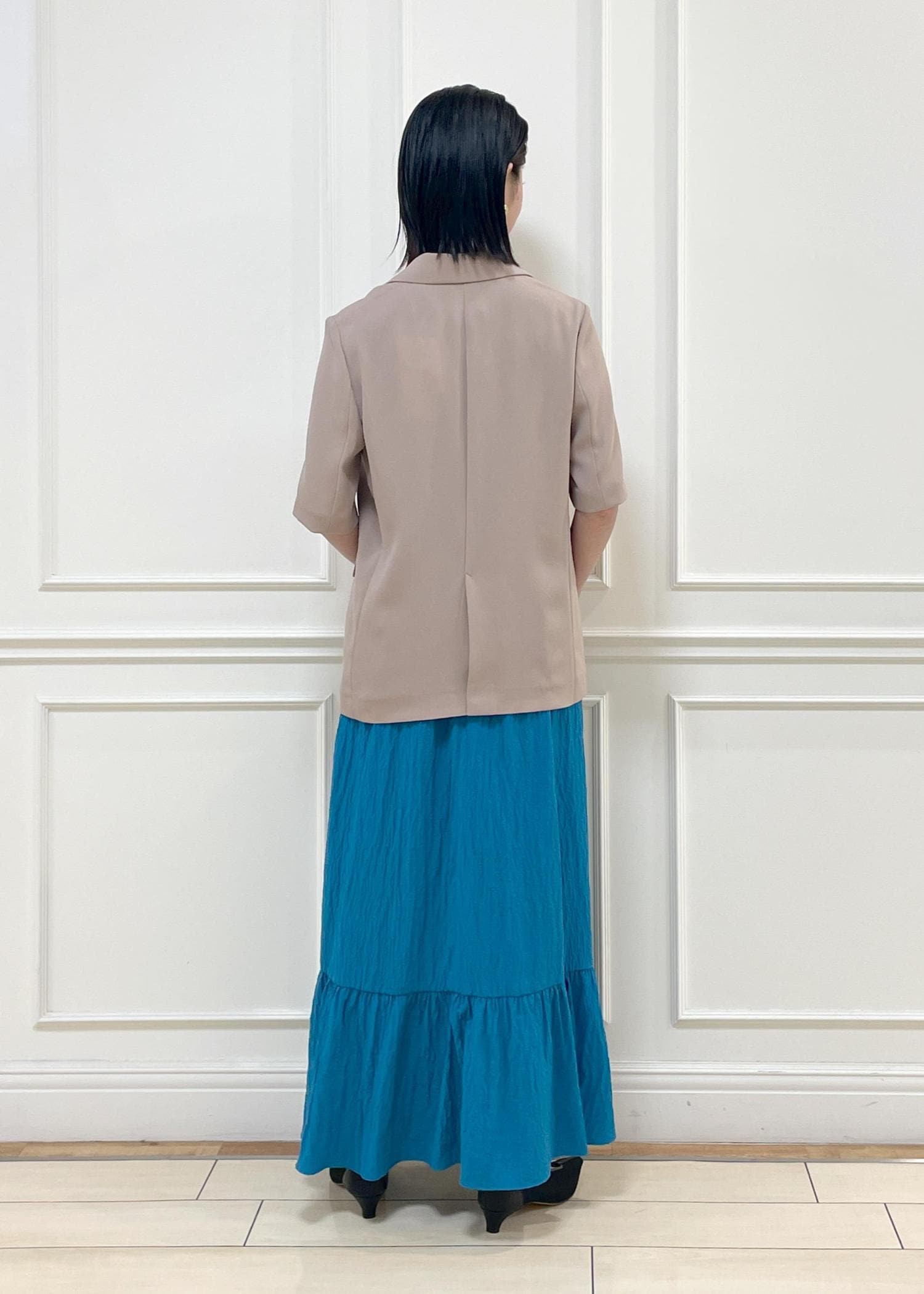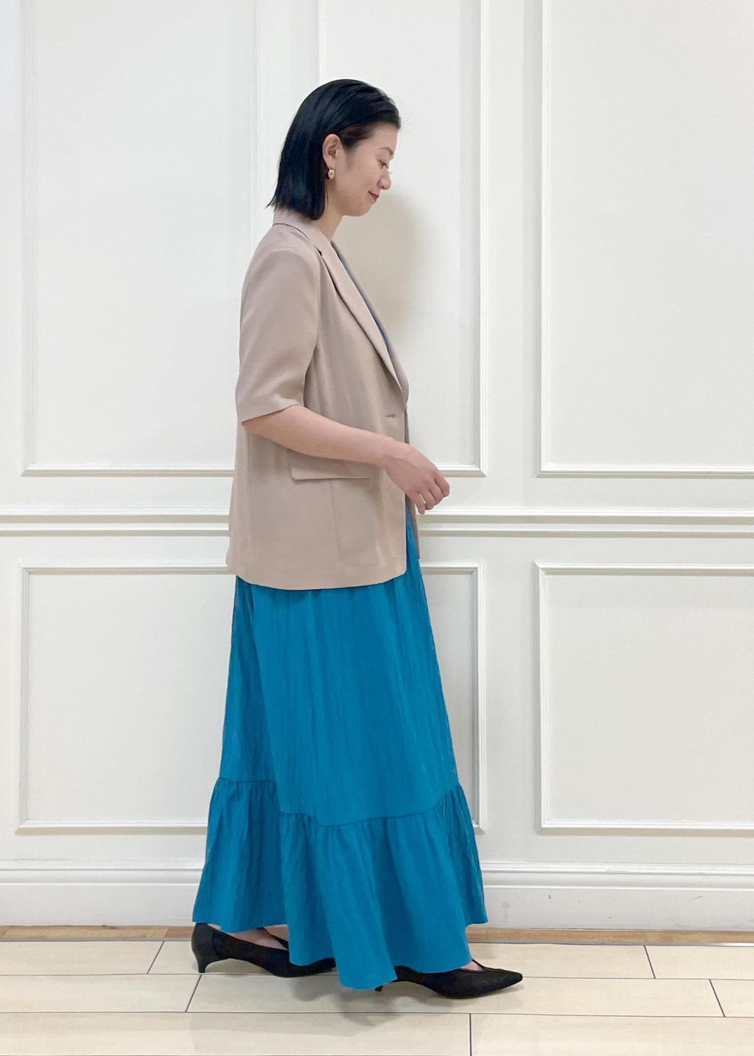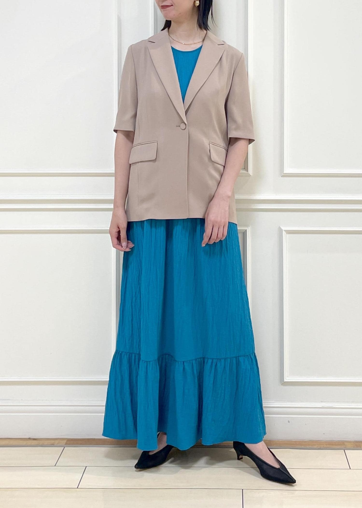 着心地の良いティアードワンピースにジャケットを合わせた、程よく力の抜けたスタイリングです。