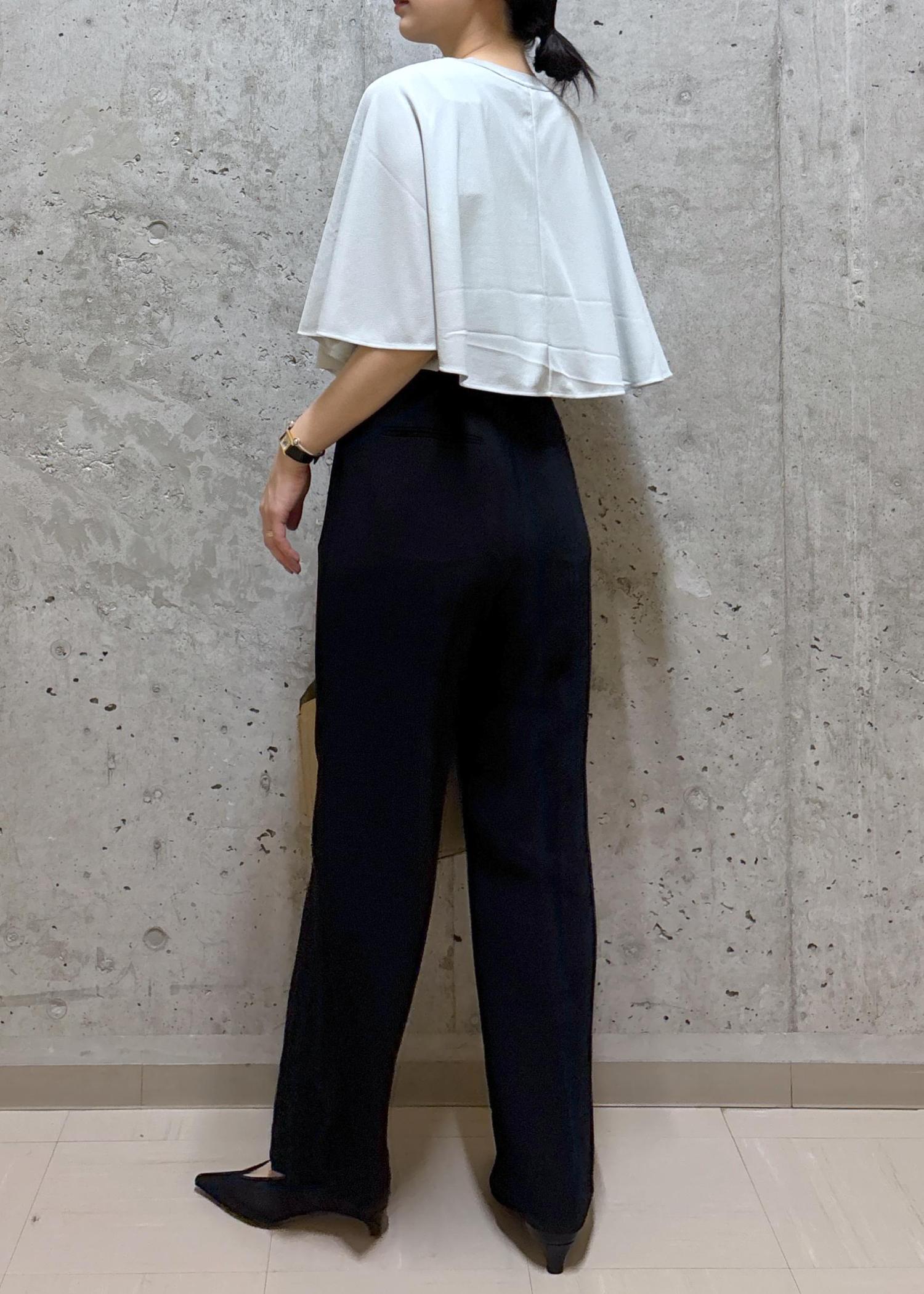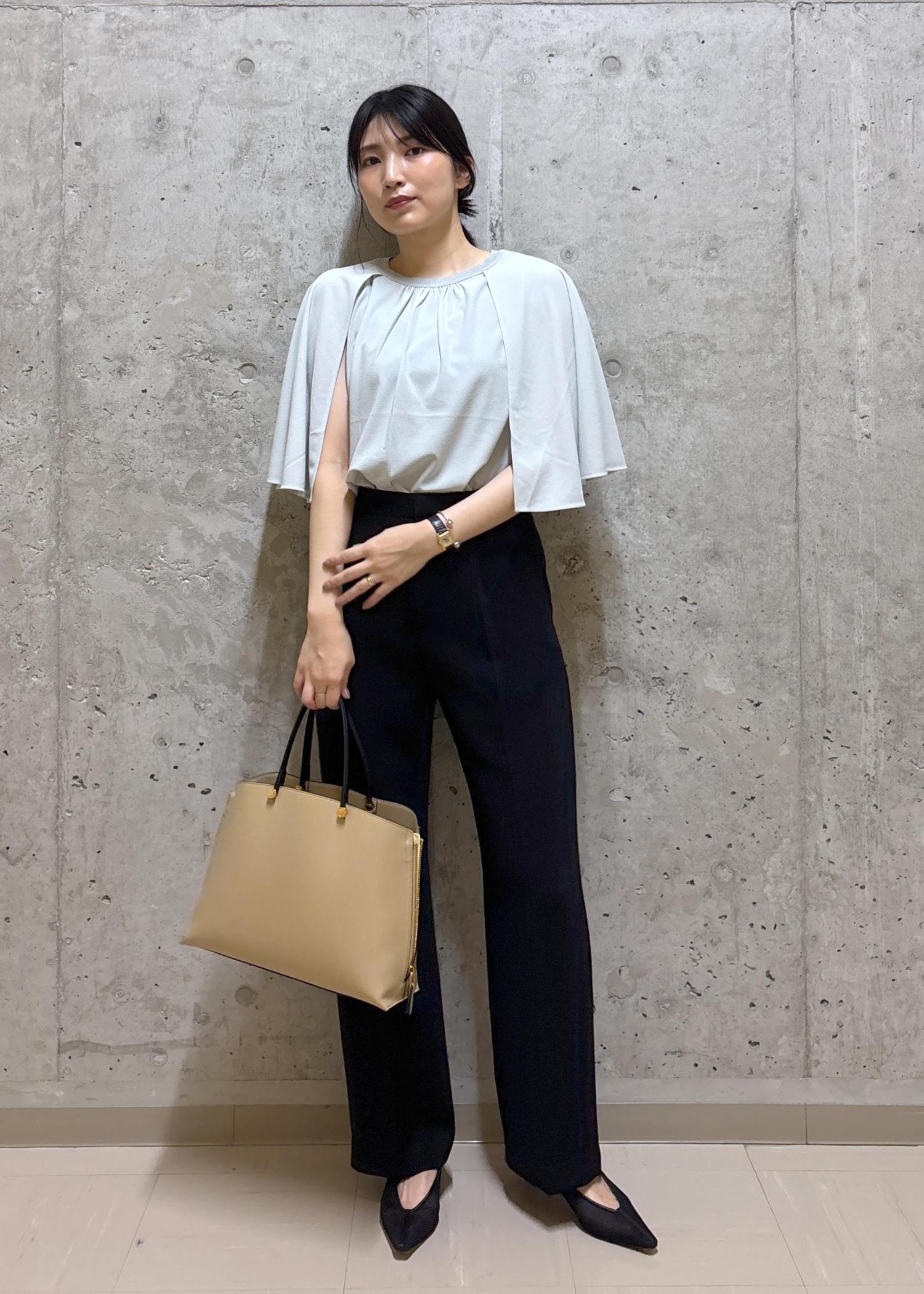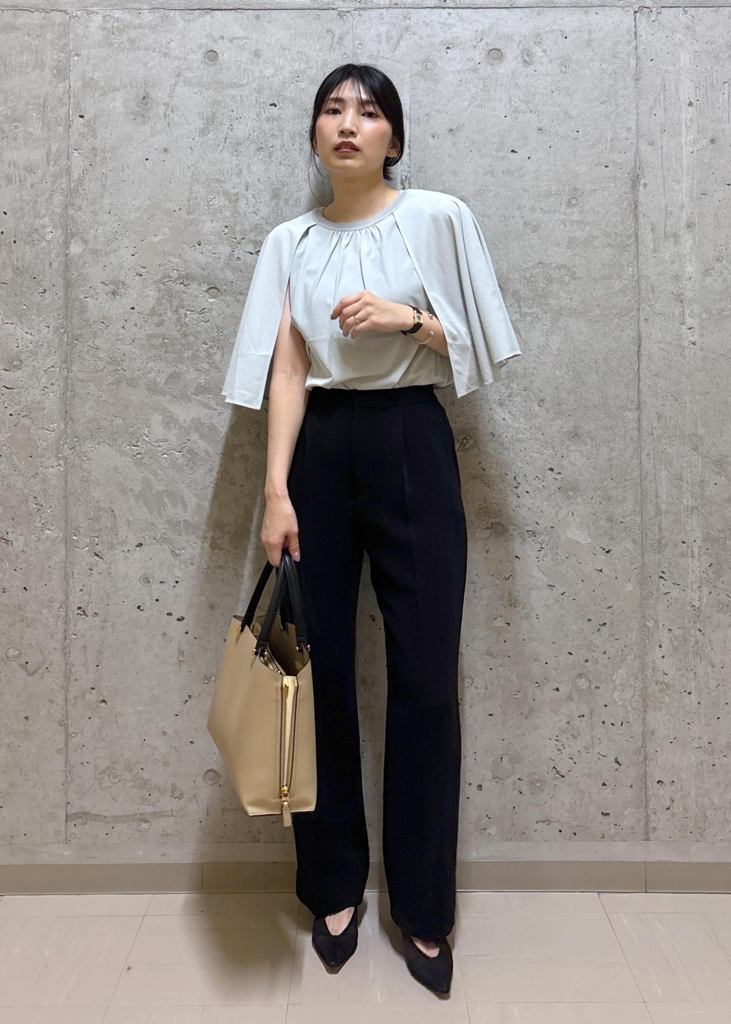 鎖骨が隠れる詰まりすぎない襟ぐりに、ケープのように見える袖が繋ぎ合わされた、ひらりとエレガントなシルエットのブラウス。
