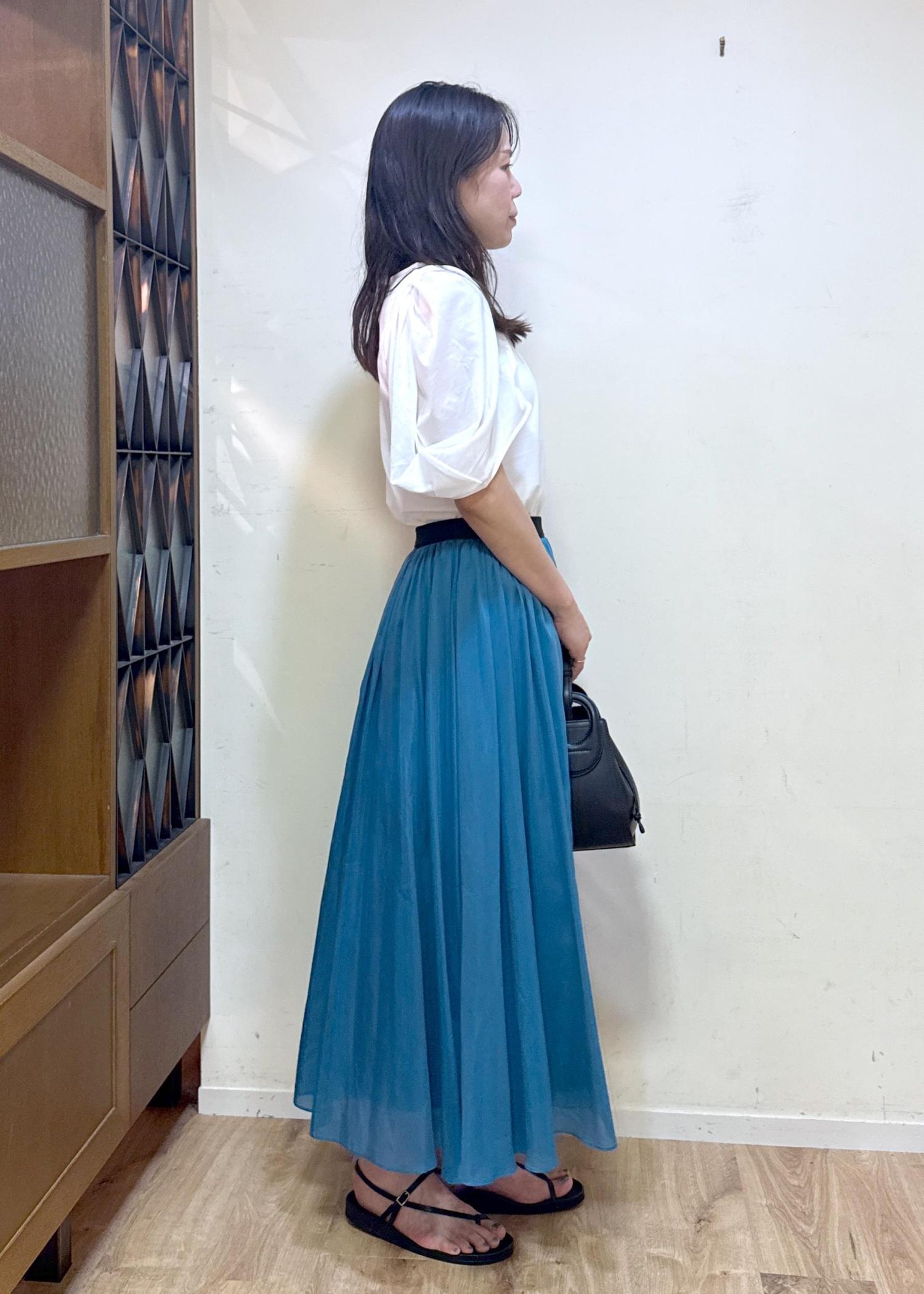 夏のお出かけに、清涼感のあるコットンシルクスカートをフェミニンなトップスでコーディネートしました。