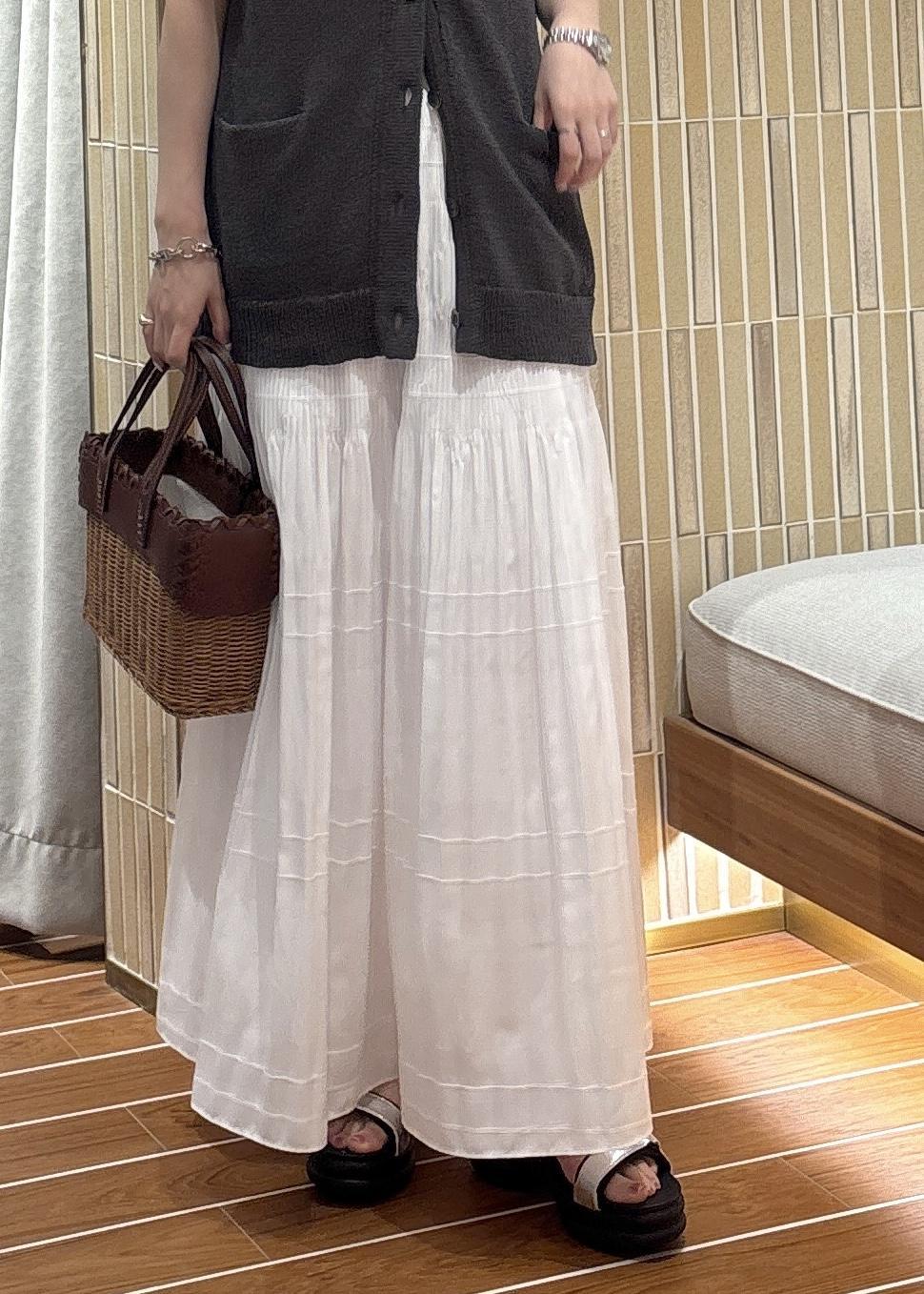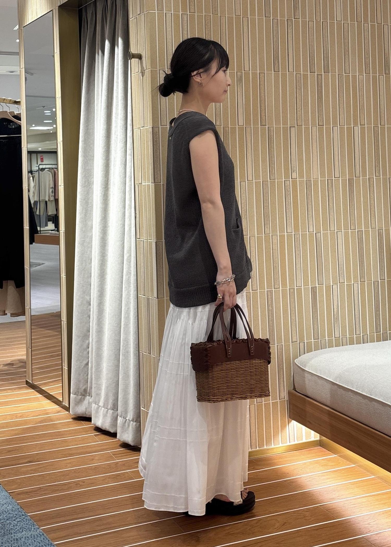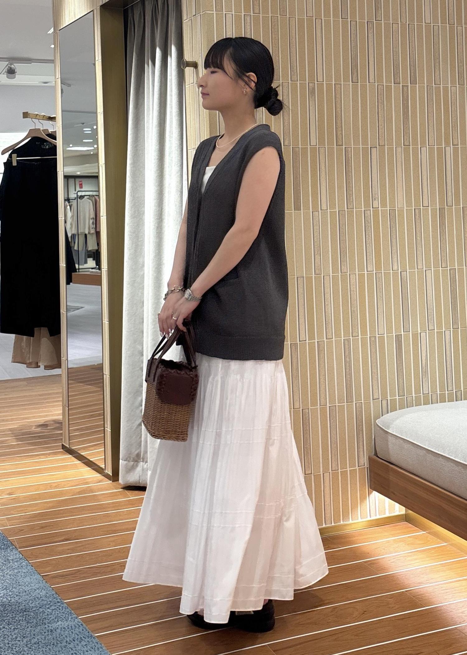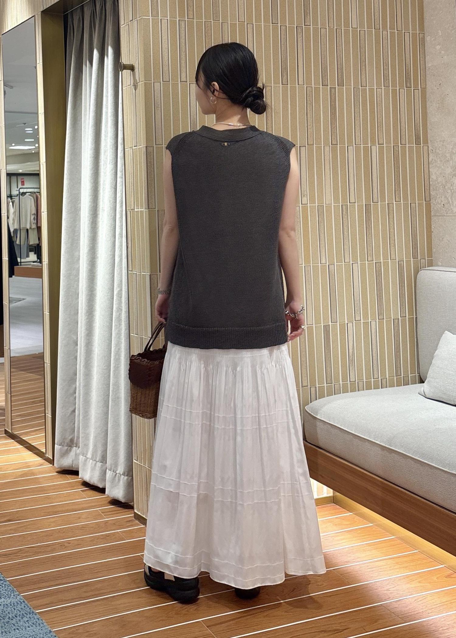 甘くなりがちな白のプリーツスカートも、チャコールグレーのカジュアルめなジレと合わせることでバランスの取れたコーディネートになります!