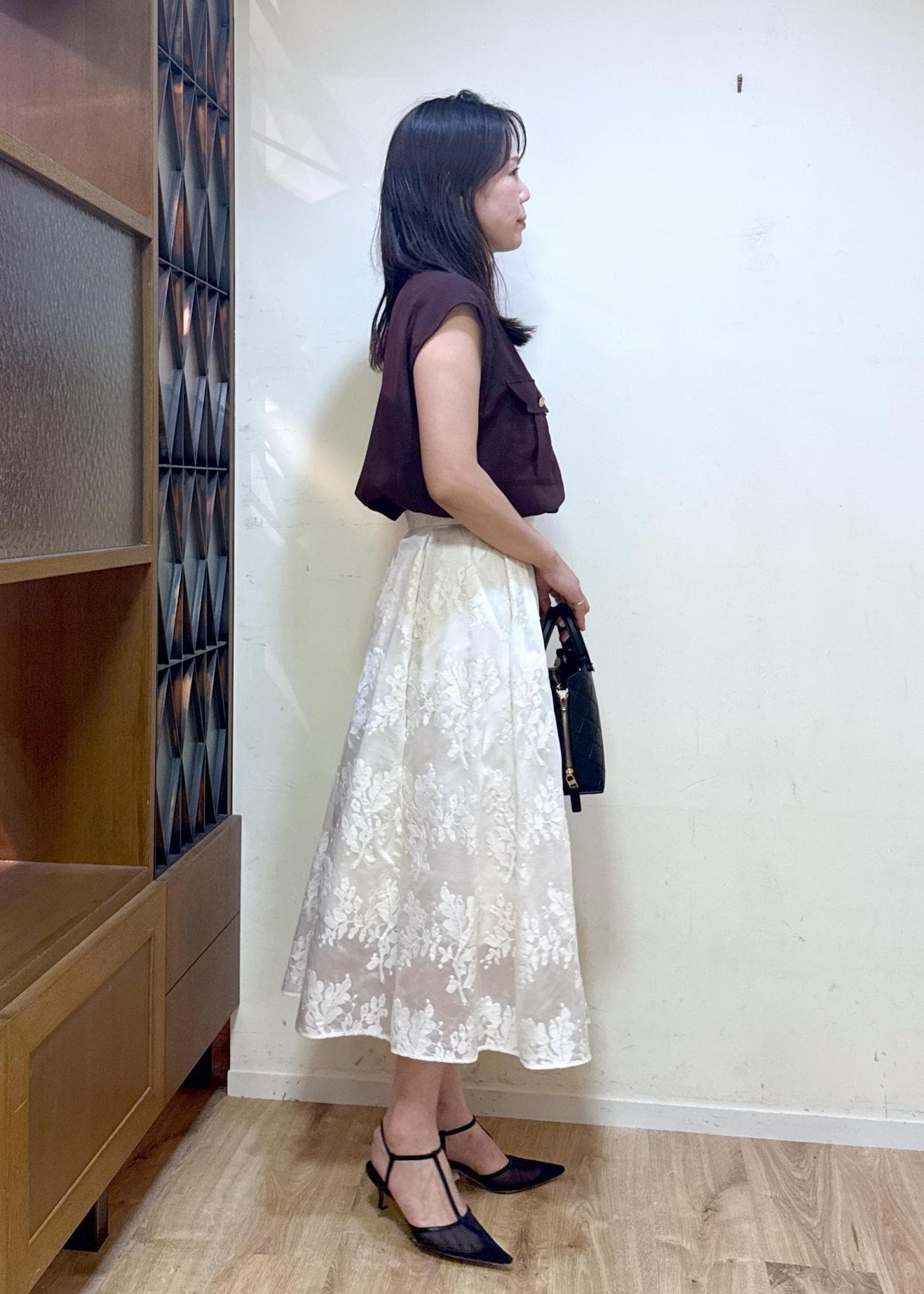 シアーな素材に刺繍を施したフェミニンなスカートにサファリブラウスをコーディネート。