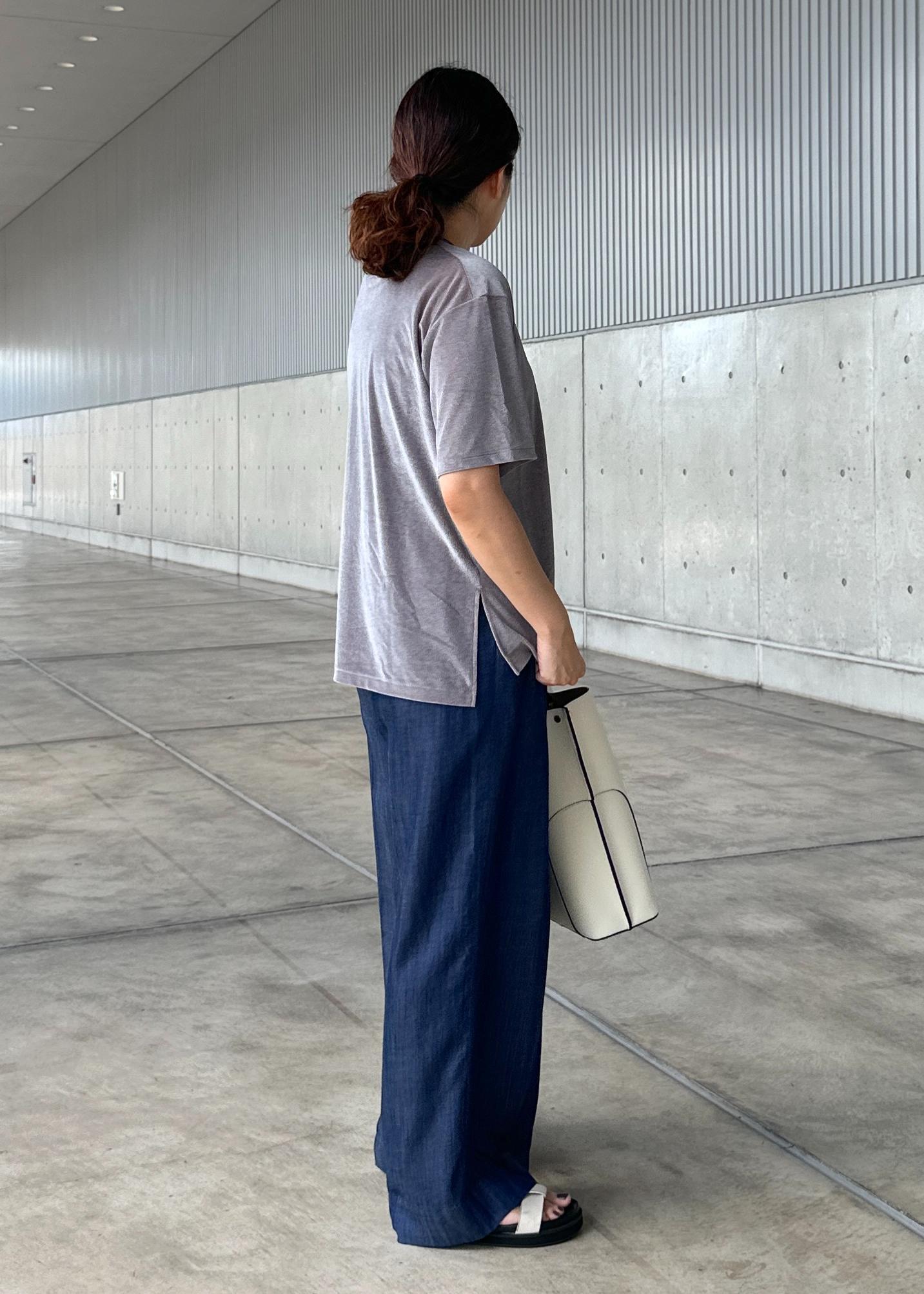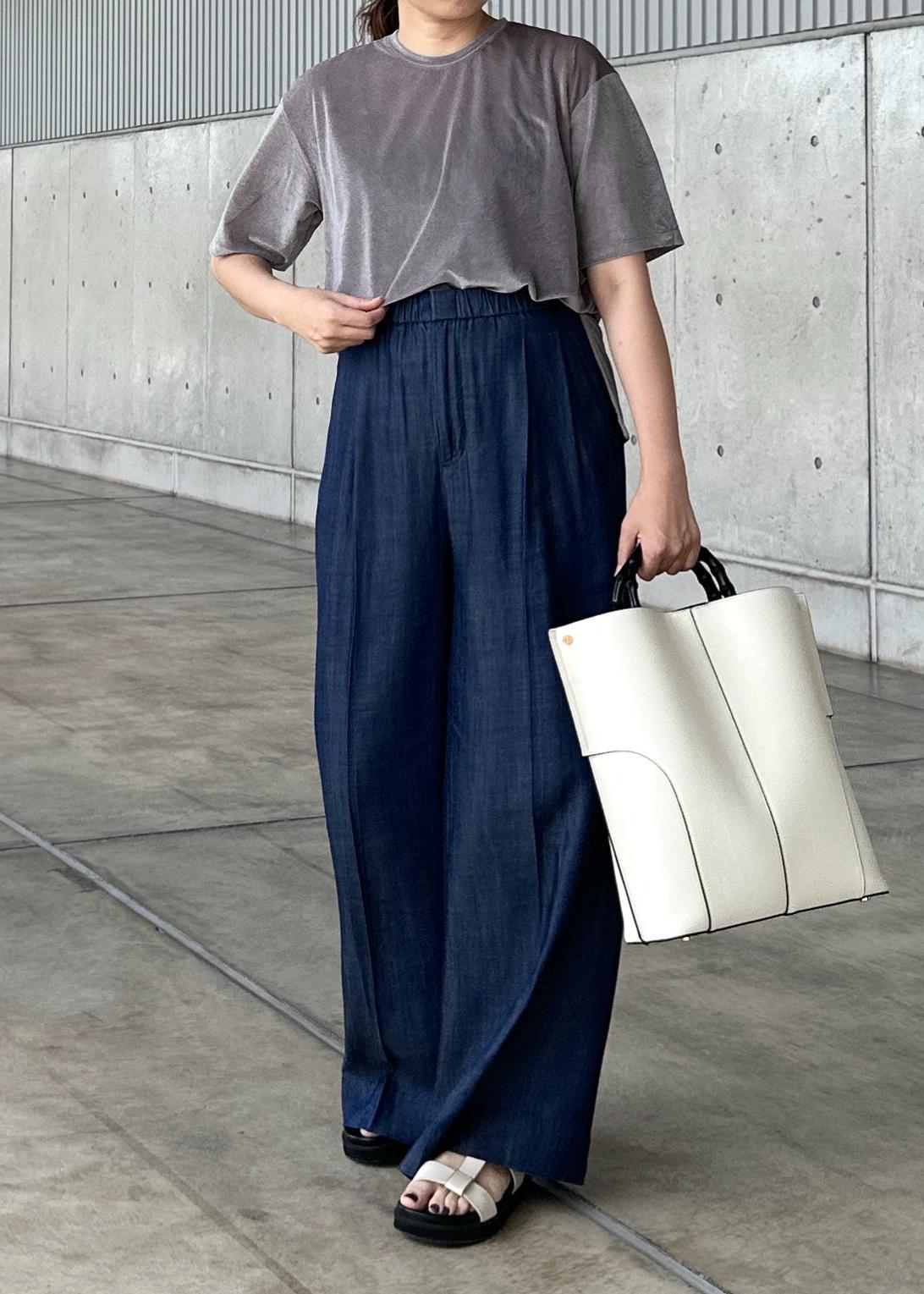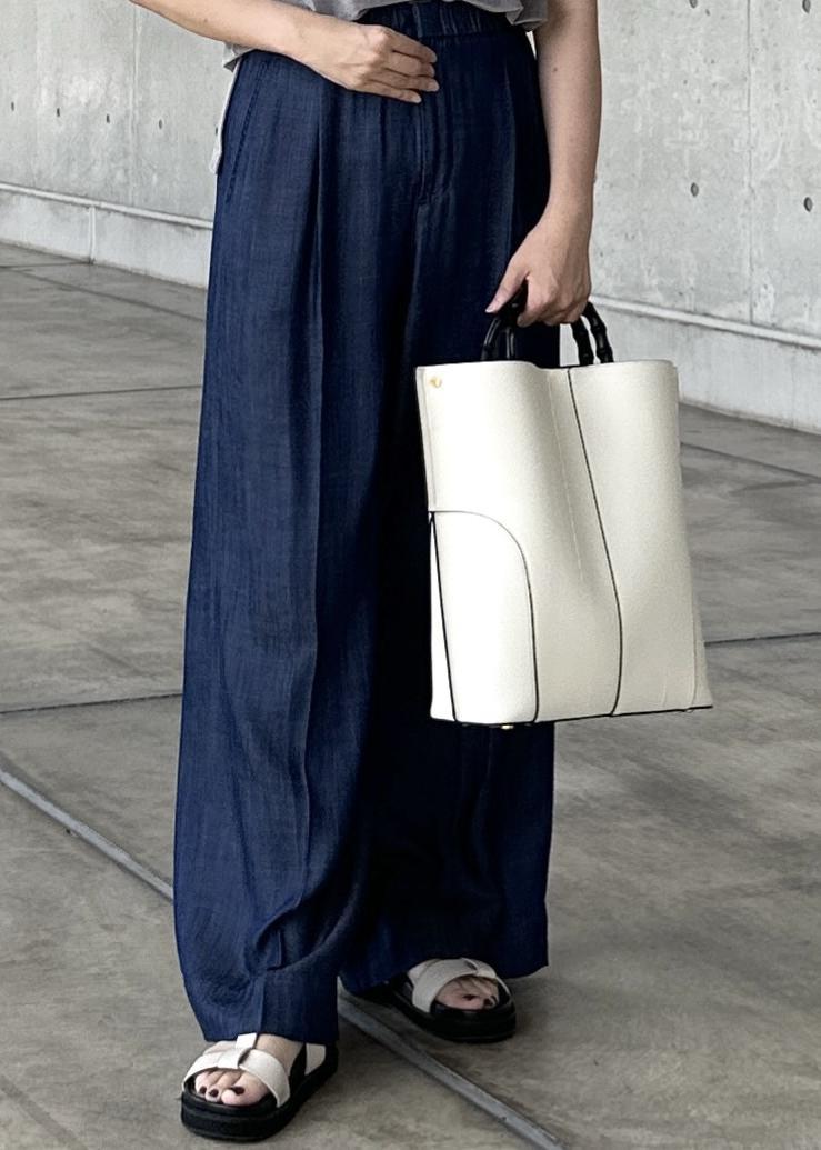 落ち感のあるテンセル100%素材のデニム。軽さと程よいツヤ感があり、カジュアルになりすぎずきれいめにも着用できます。ウエストゴムで楽してきちんと見えするので毎日履きたくなるような、ストレスフリーな1本です。 -