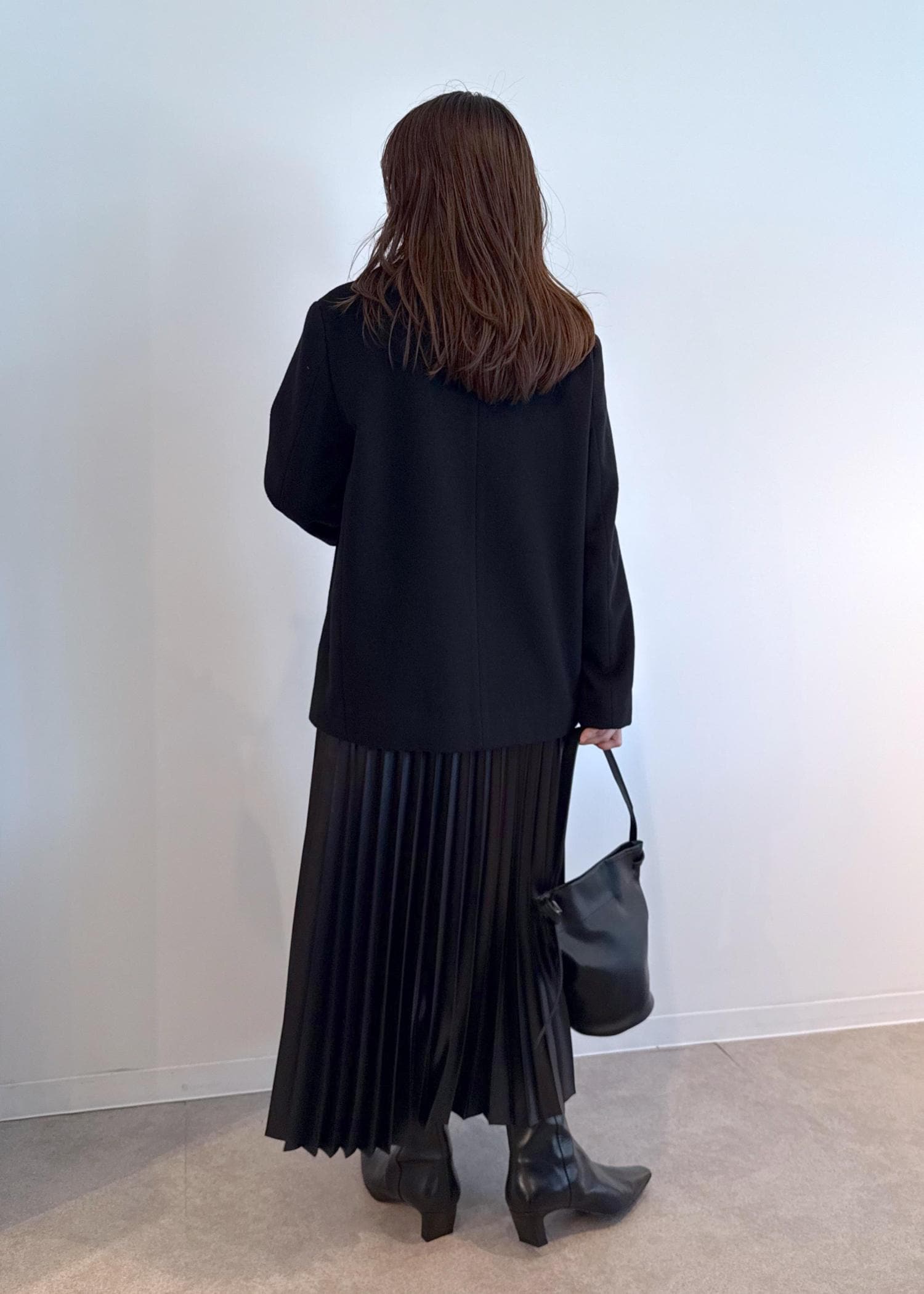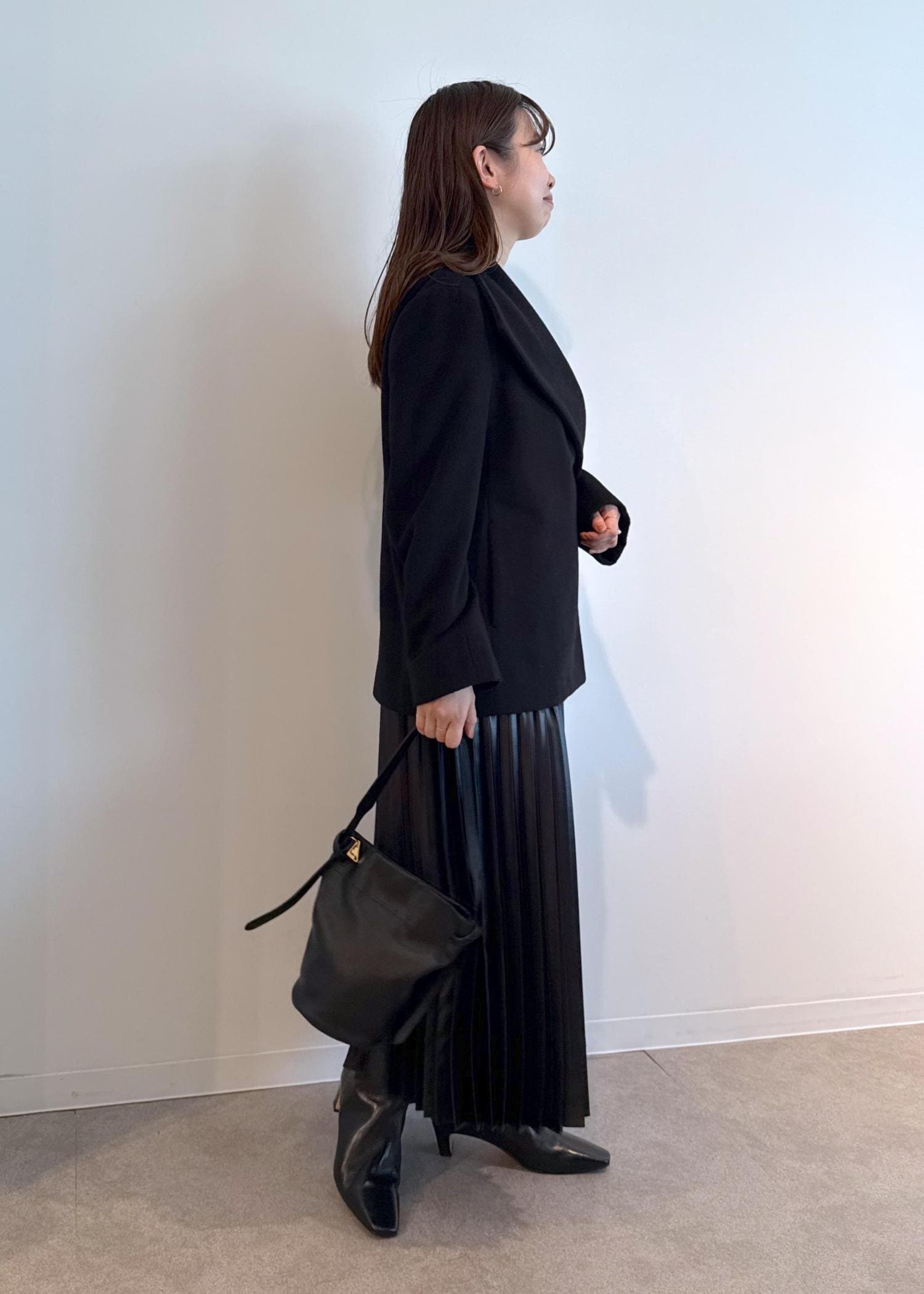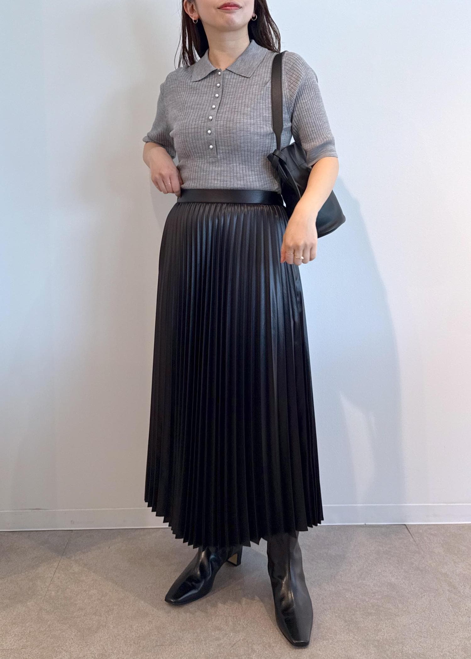 ROPÉシャイニープリーツスカート/イージーケアブラック / F¥26,400レビュー足首が見える着丈でヒール無しでもすっきり見える長さです◎