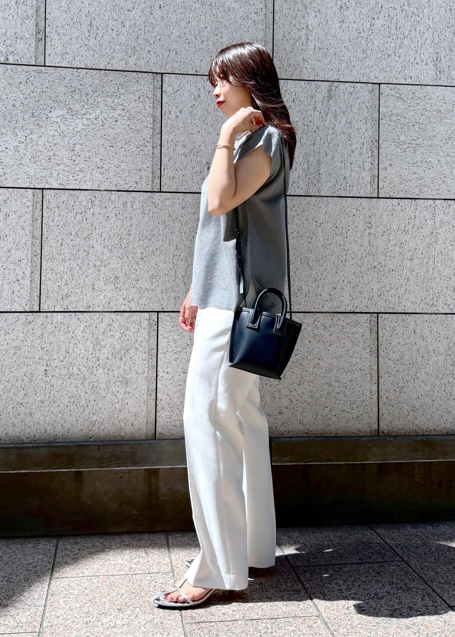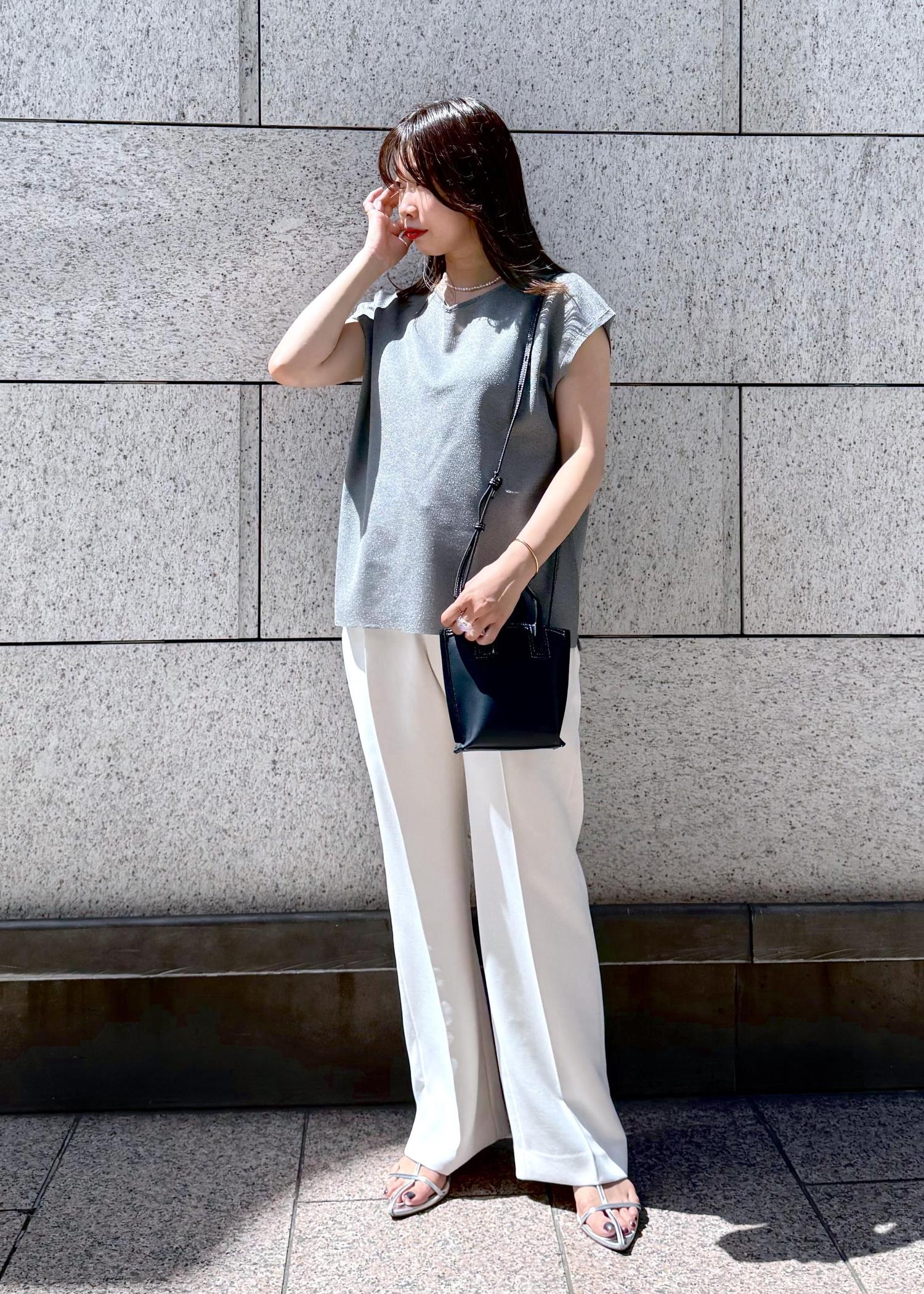 アウトレットROPÉ【洗える】シャイニーフレンチスリーブプルオーバーシルバー / F¥8,250レビュー肩先が隠れるくらいに肩幅にゆとりがあり、ゆったりめのサイズ感です。二の腕が少し隠れるのも嬉しいポイント◎