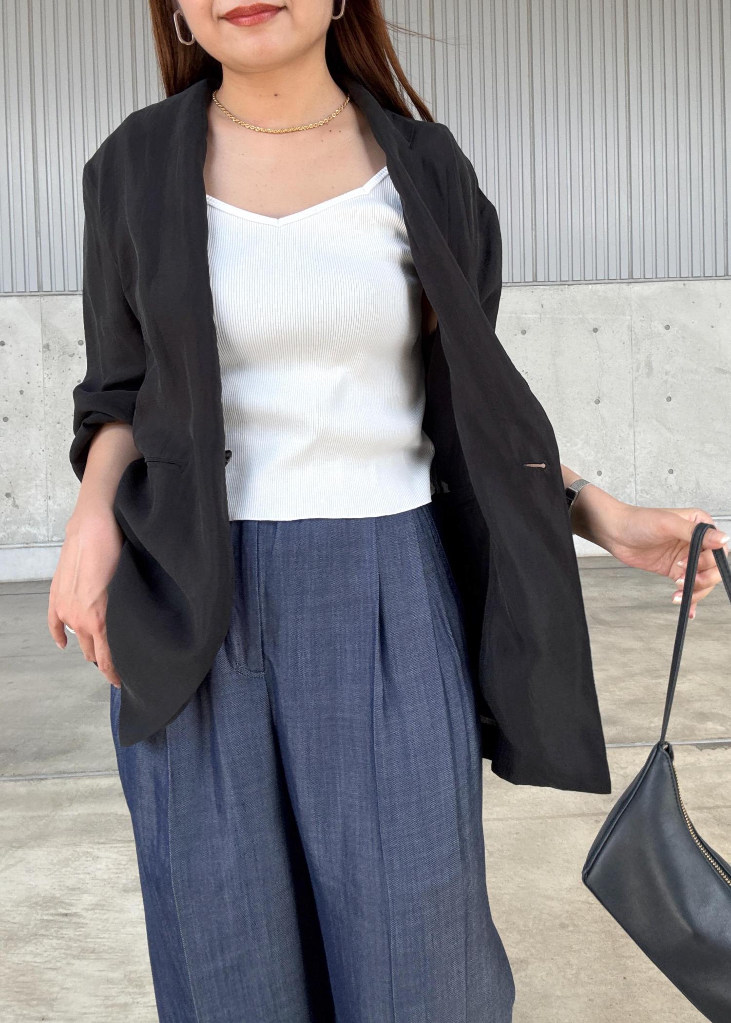 リブ仕立てですが、身体にぴったりとフィットするサイズ感ではないので着心地もよく、リネンシャツの上から、ビスチェ風にレイヤードしていただくのもおすすめです!