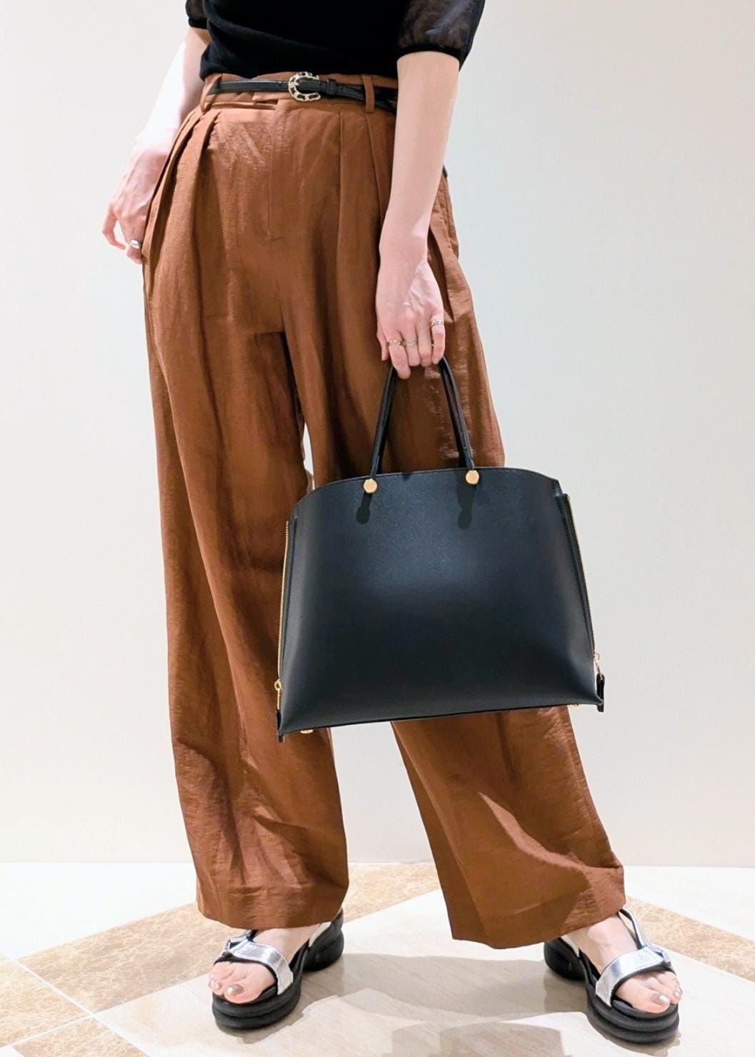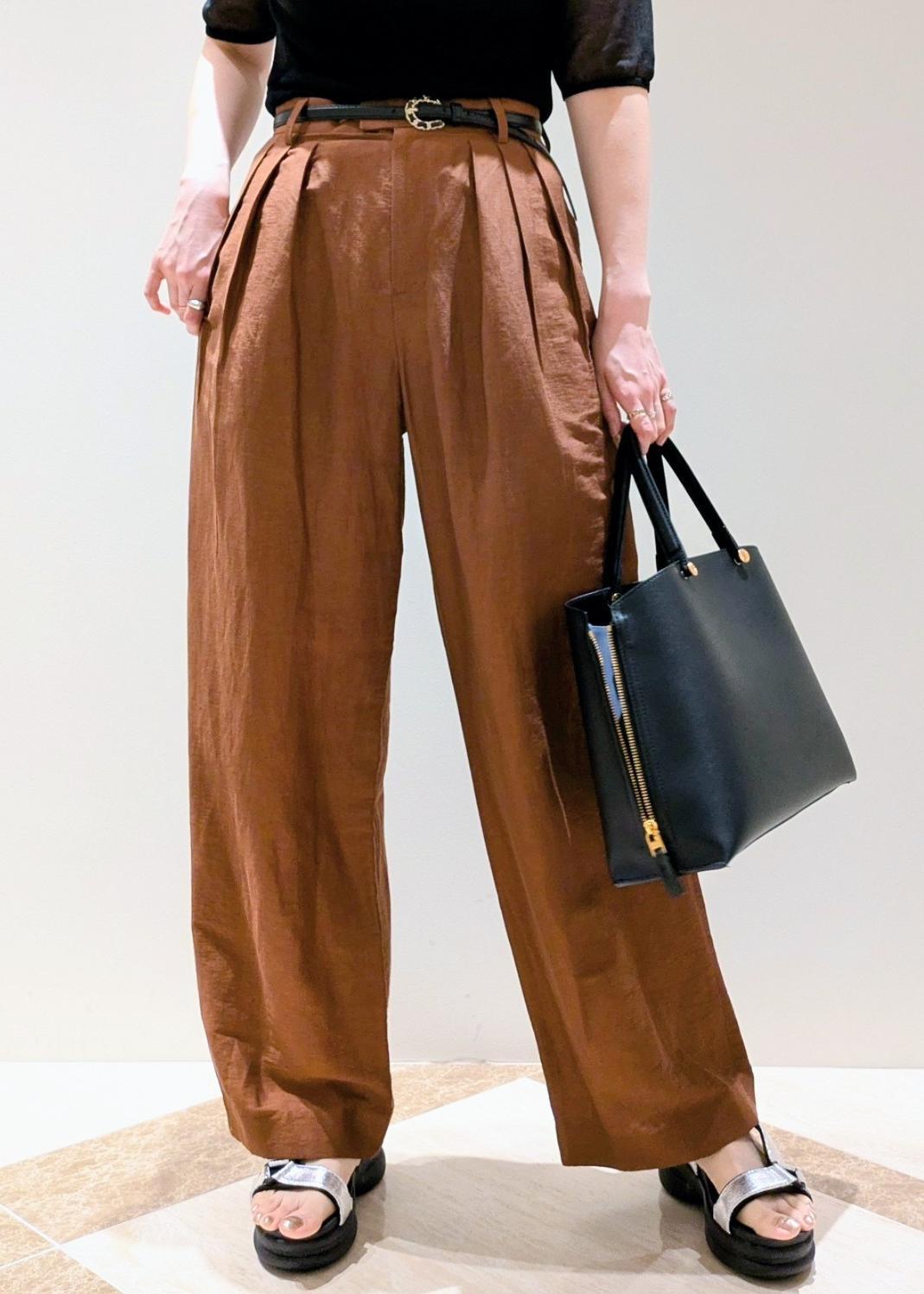 さらっとしたリネン混の素材で、とても軽く真夏にも活躍するタックパンツ。