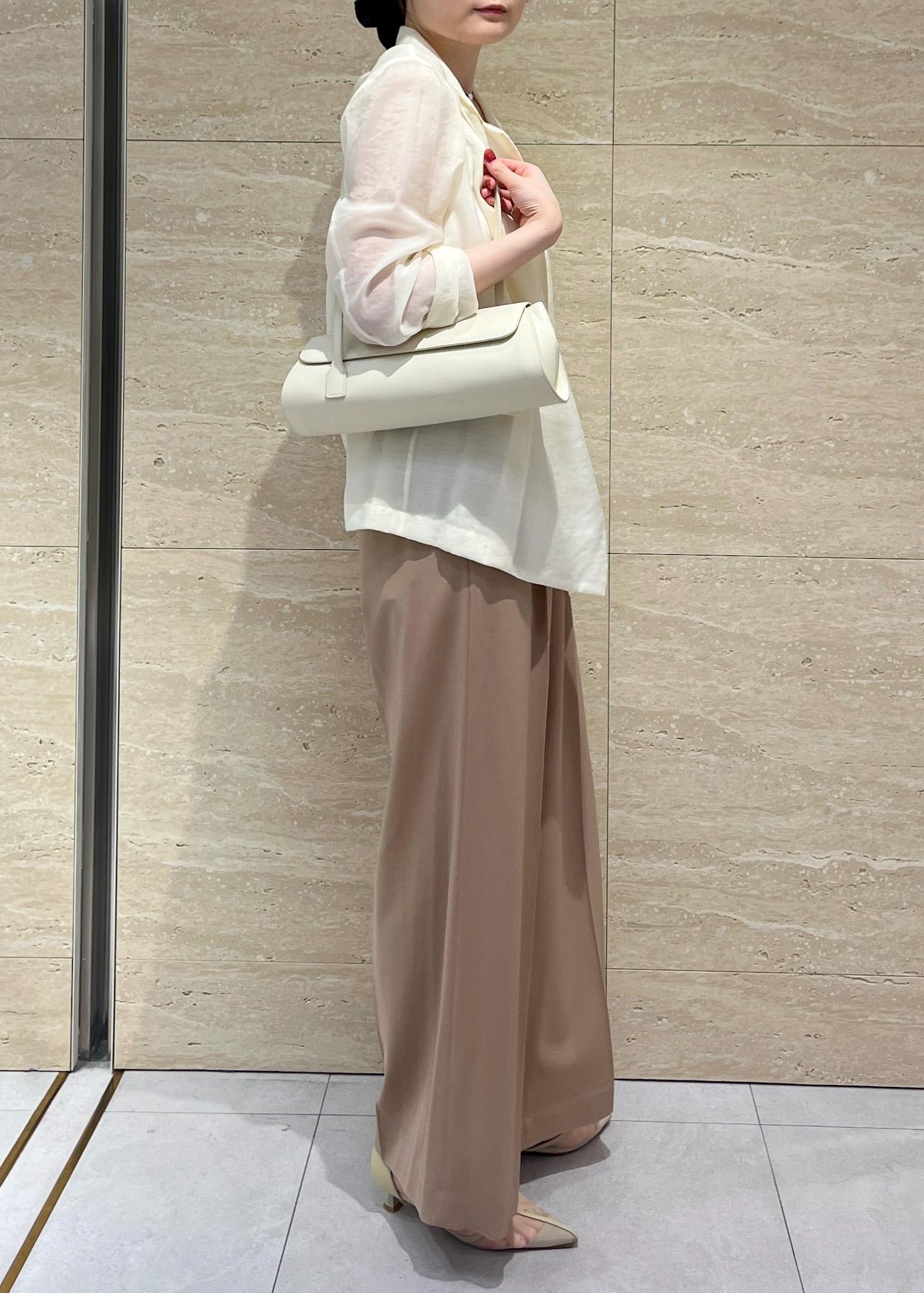 横長シェイプバッグはマニッシュな印象を残してくれるので、コーデの良いスパイスに!