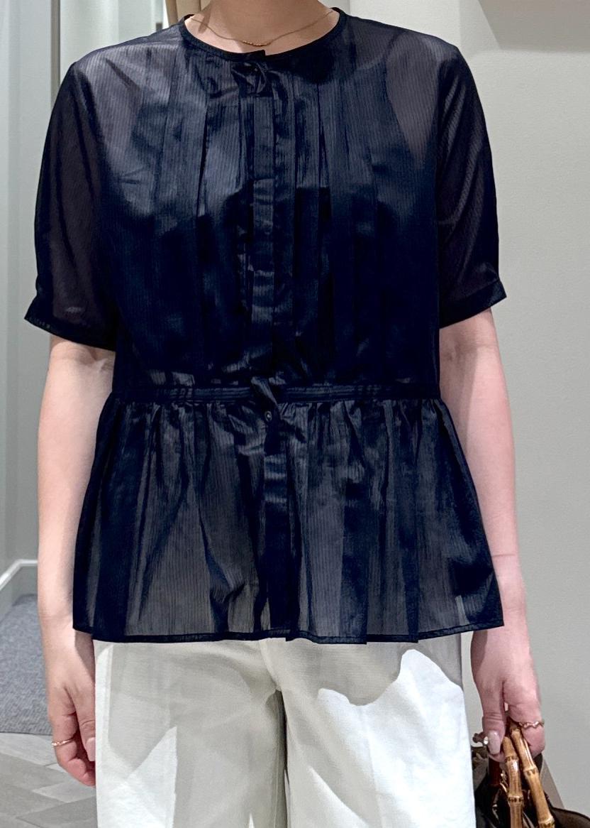 アウトレットROPÉ【洗える】ストライプペプラムブラウスネイビー / F¥8,800レビュー程よい透け感のシアーブラウス。