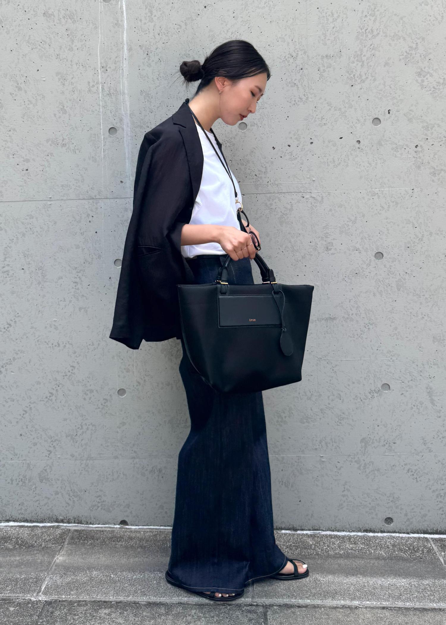 全体的にモノトーンでまとめ、晩夏や秋口にも着ていただけるコーディネイトに。
