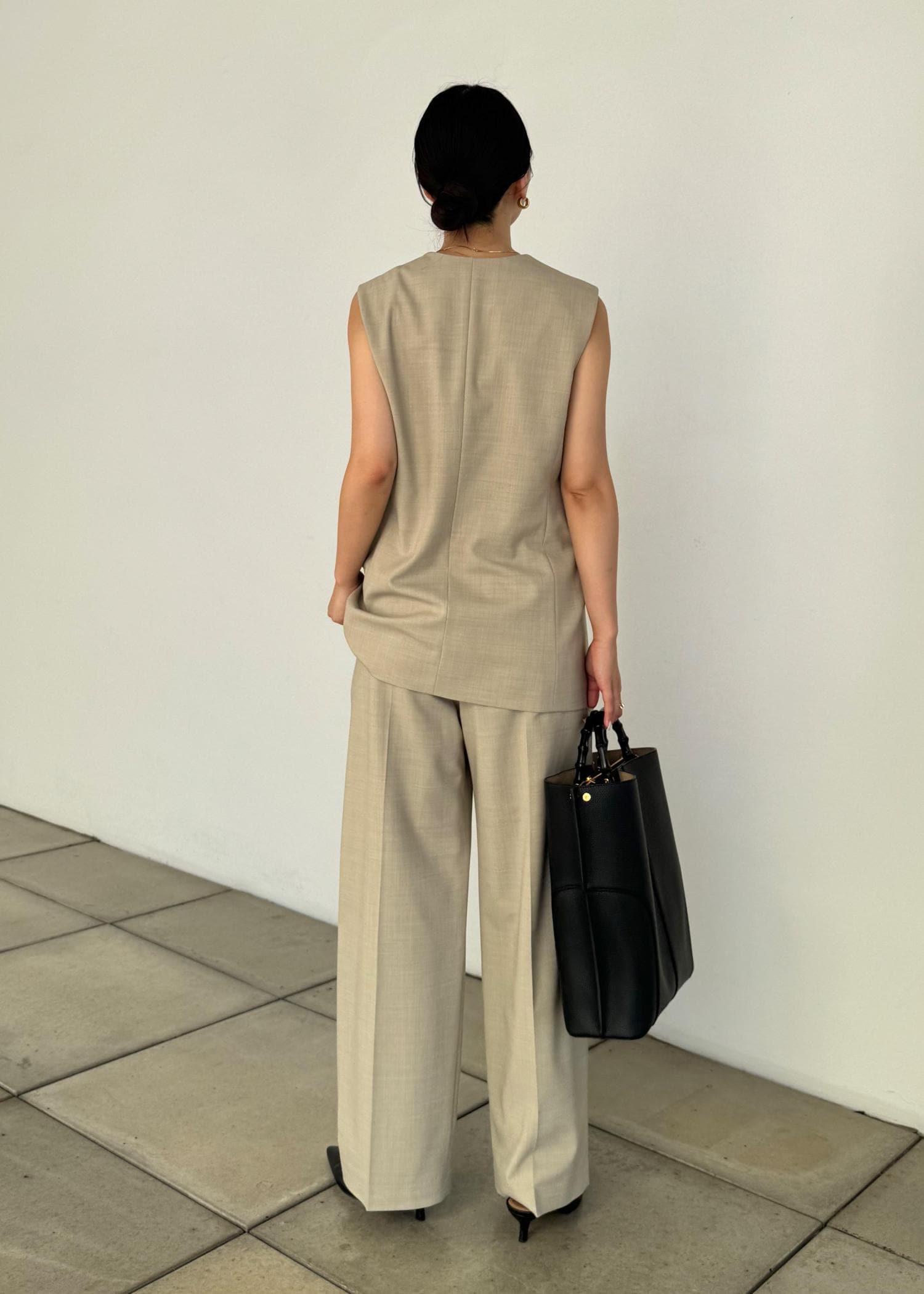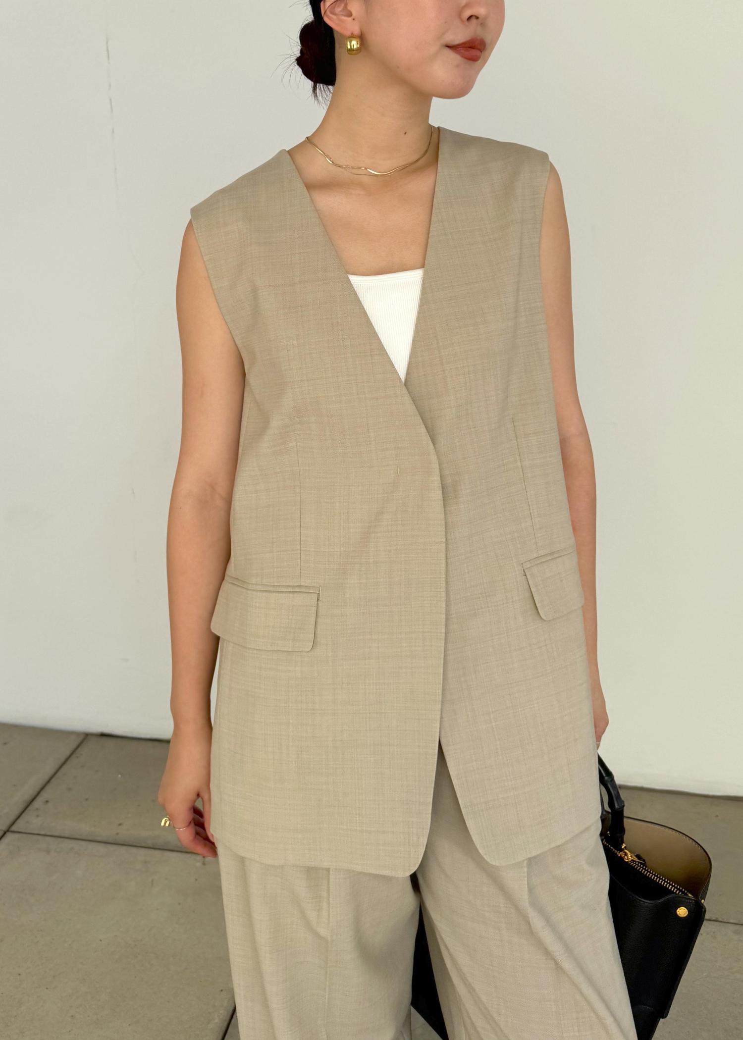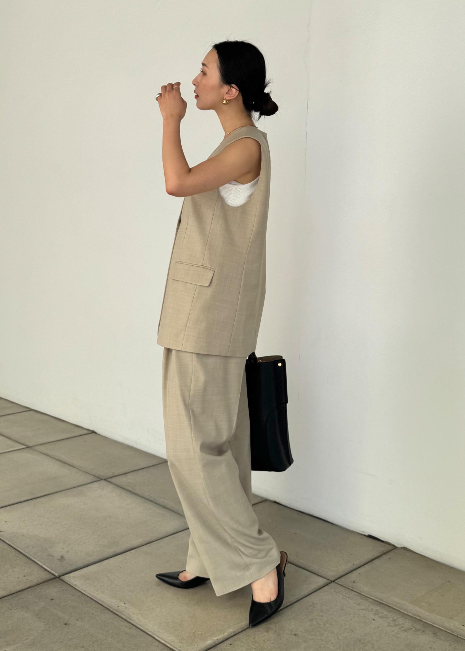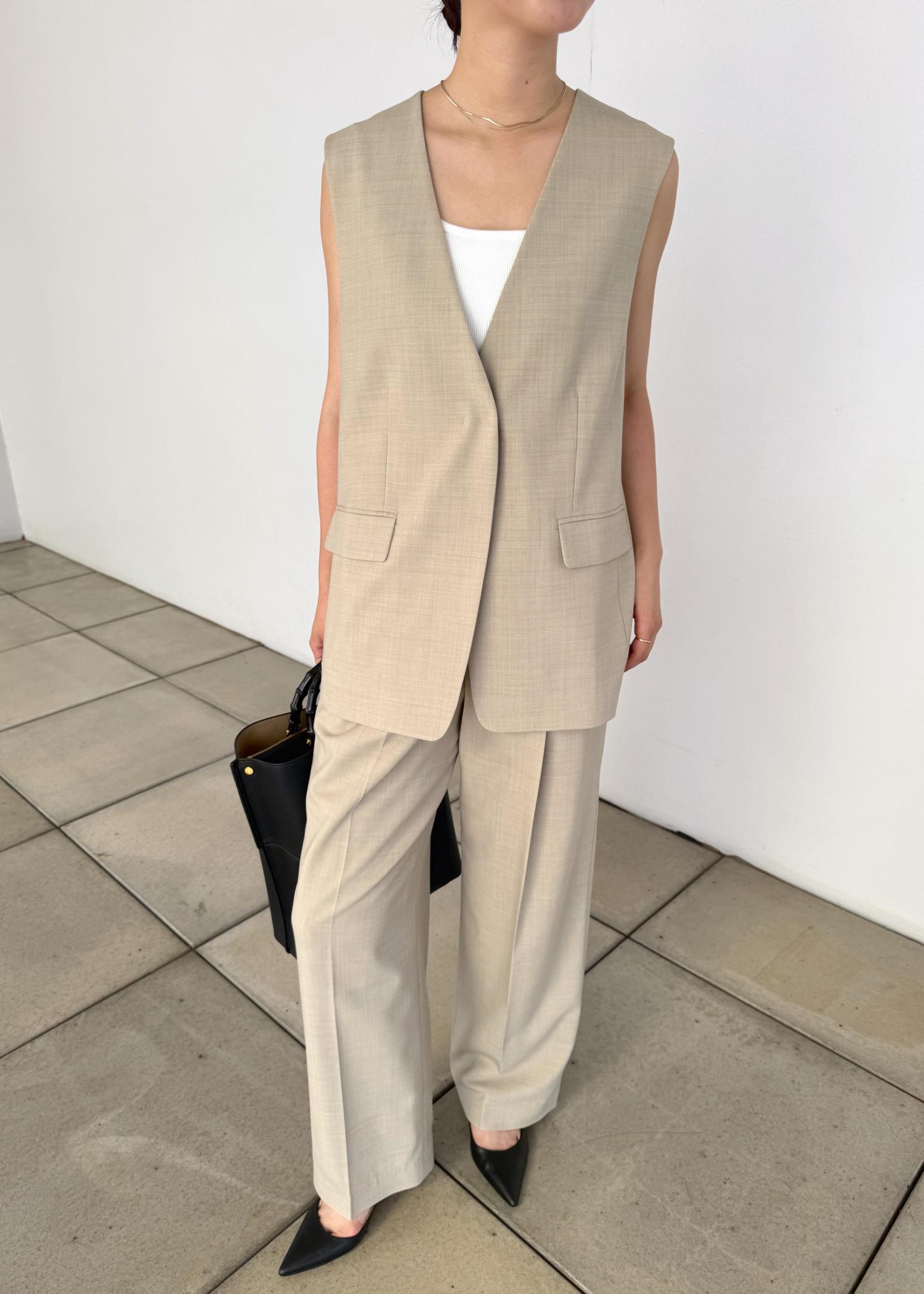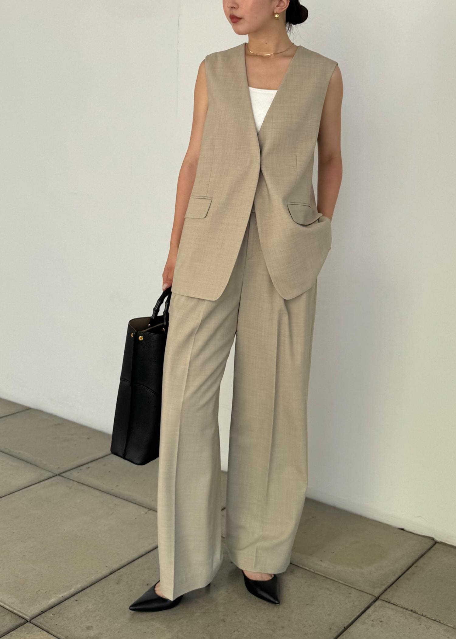 ノーカラージレがスッキリした印象のセットアップスタイル。