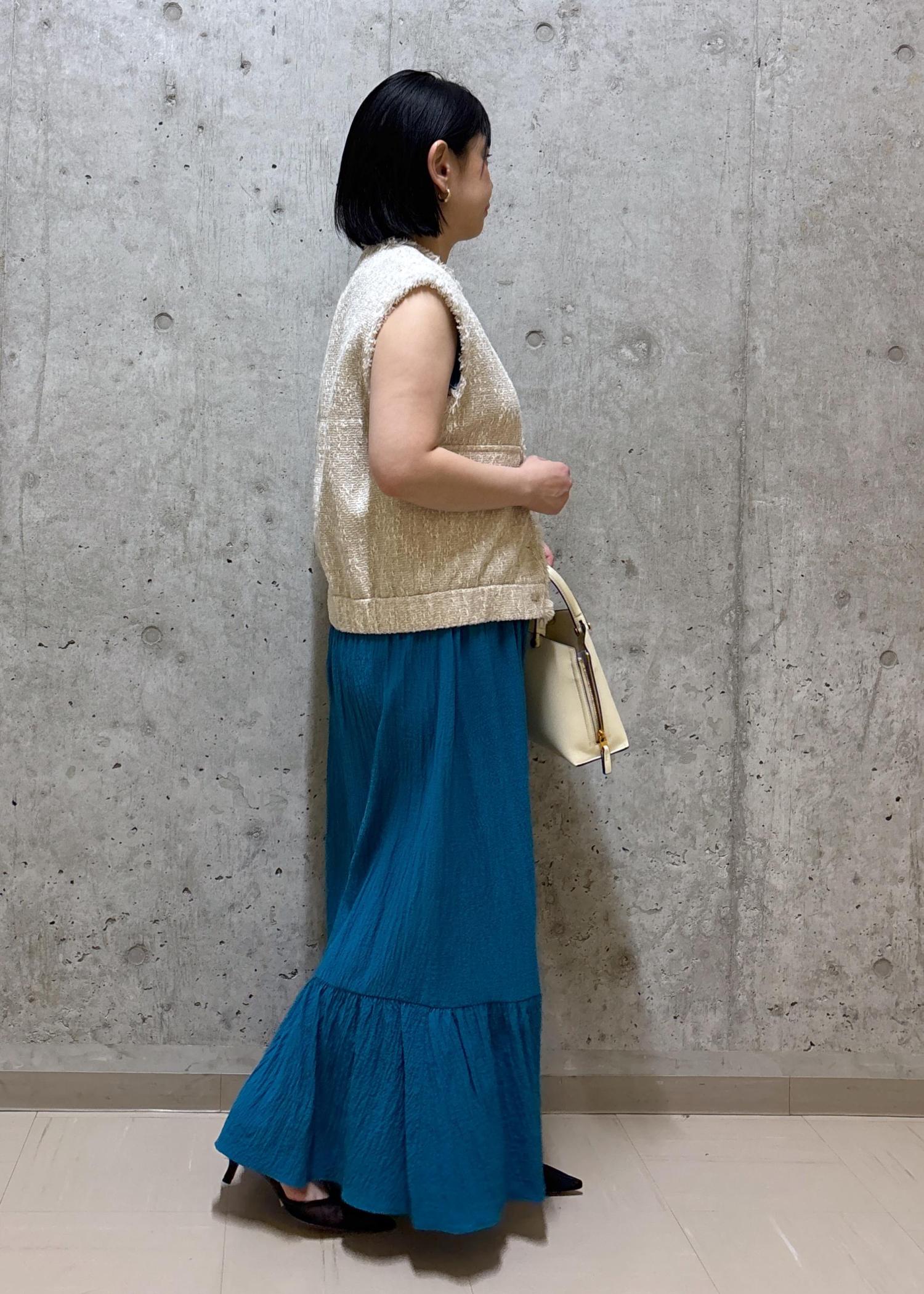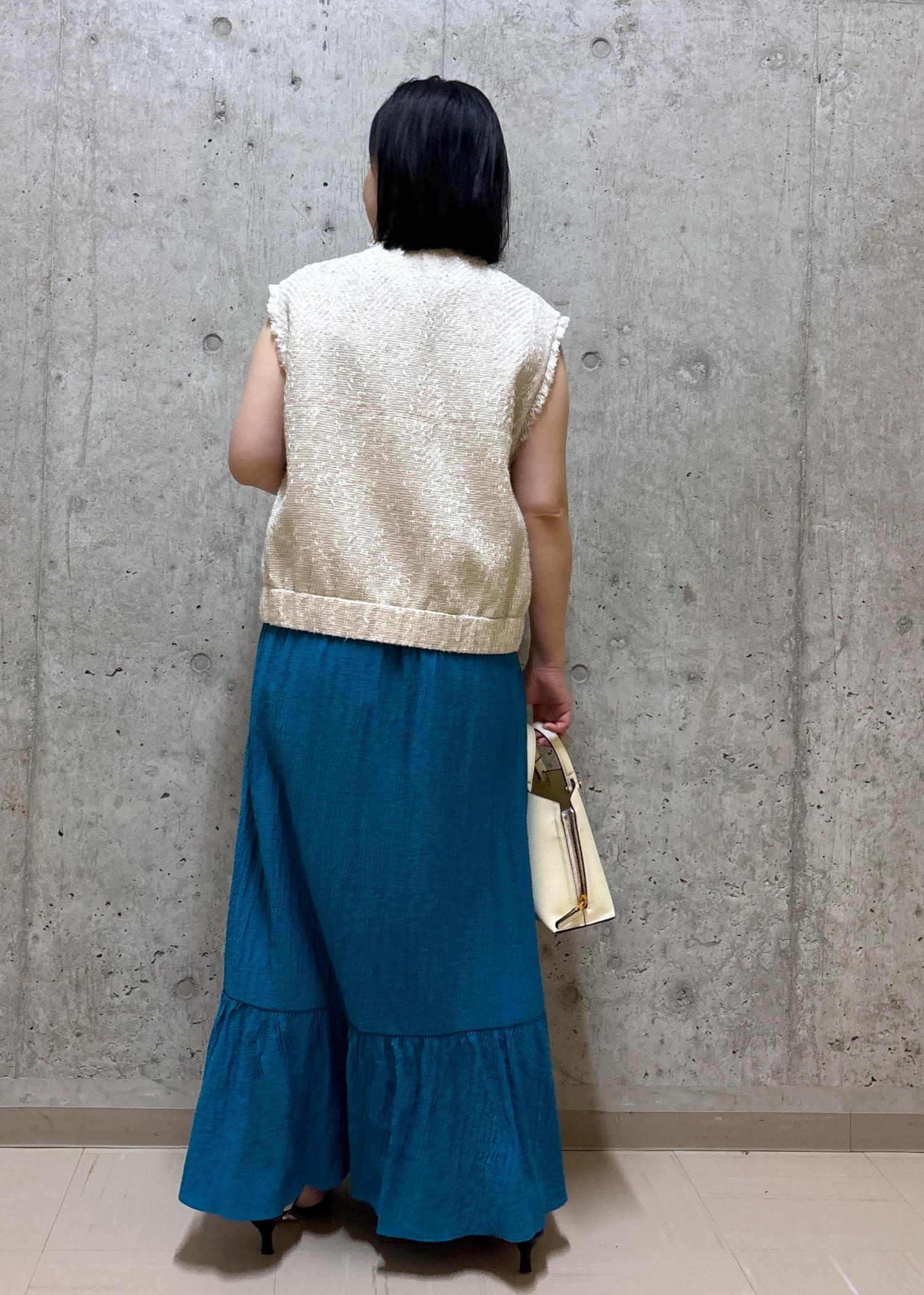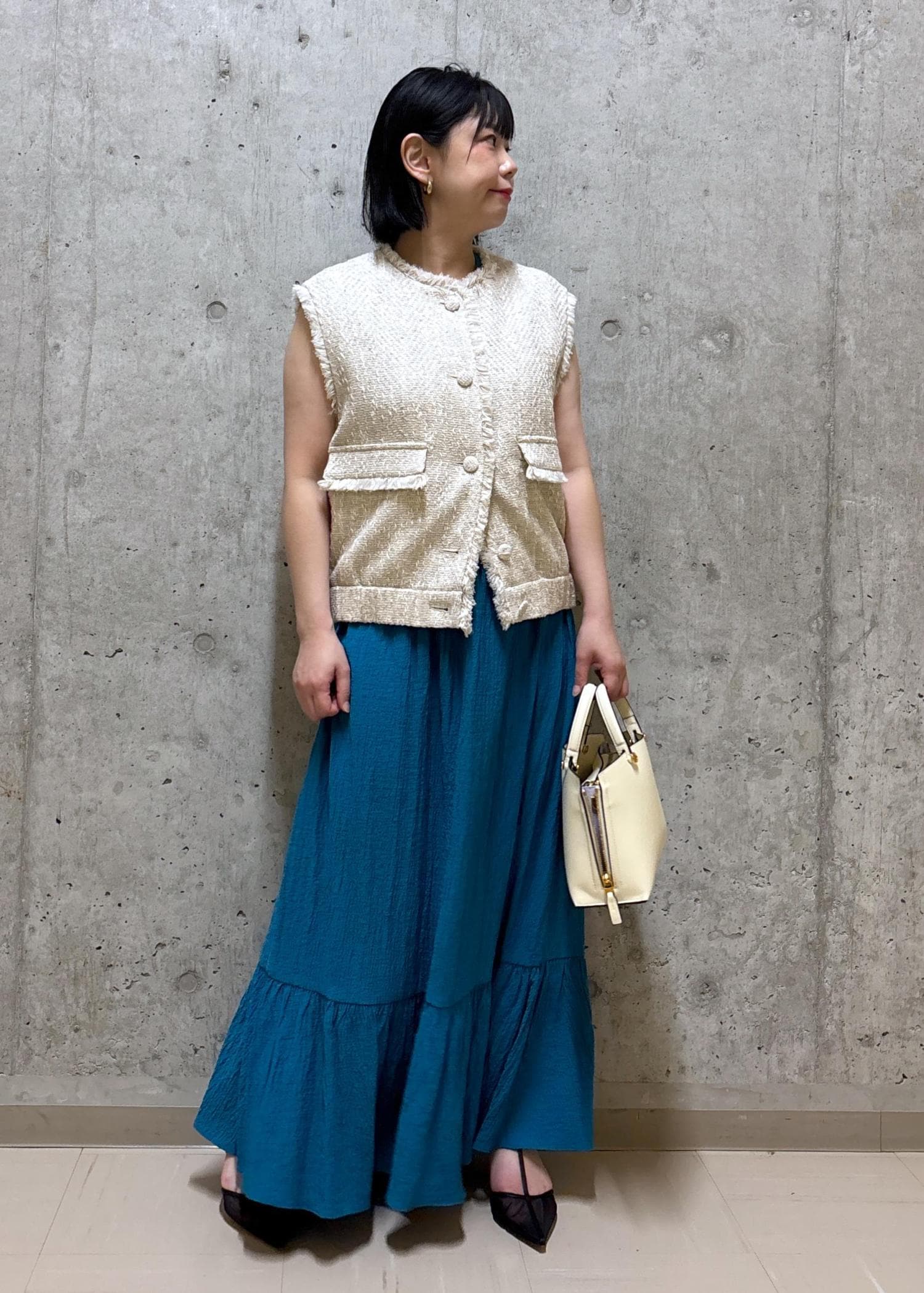 リネン混の涼しげなブルーワンピースに、ツイード素材のジレを重ねた異素材ミックスのレイヤードコーデにしました!