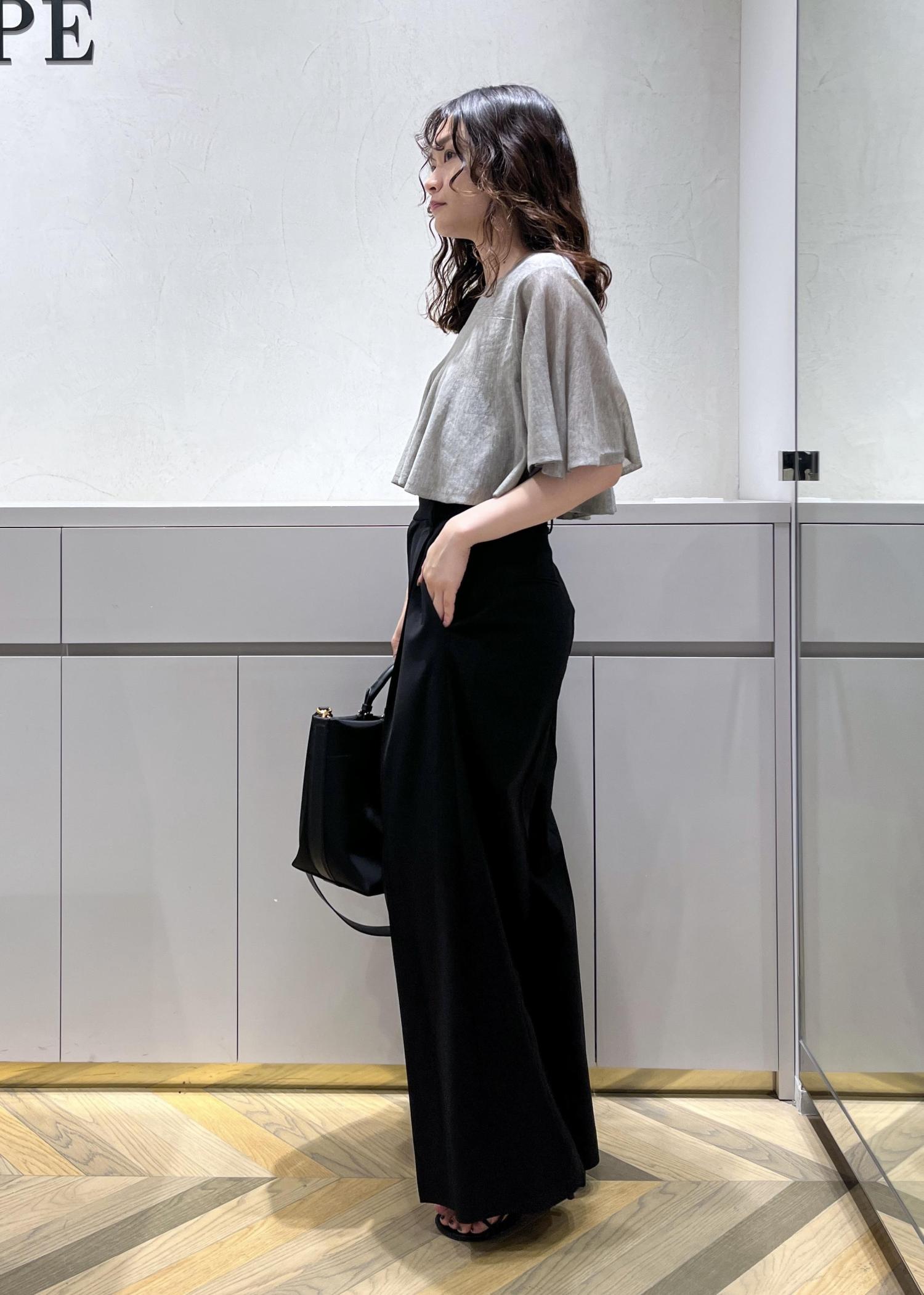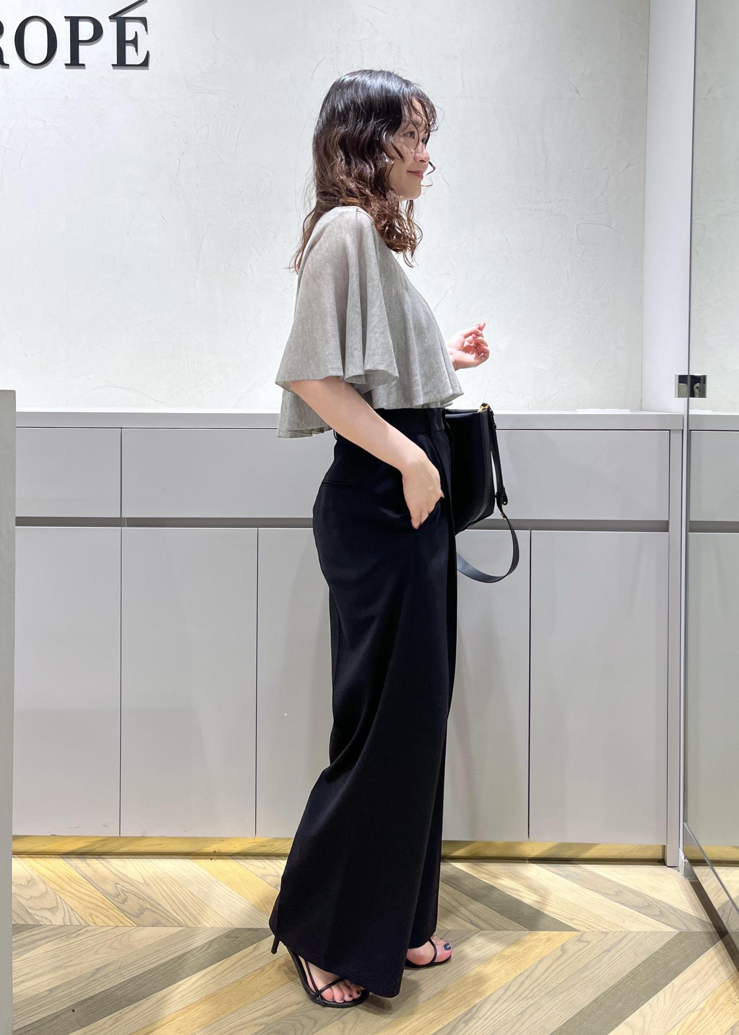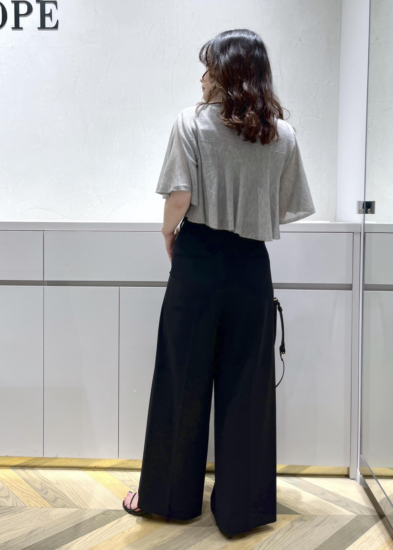 ハイウエストのワイドパンツを合わせ、