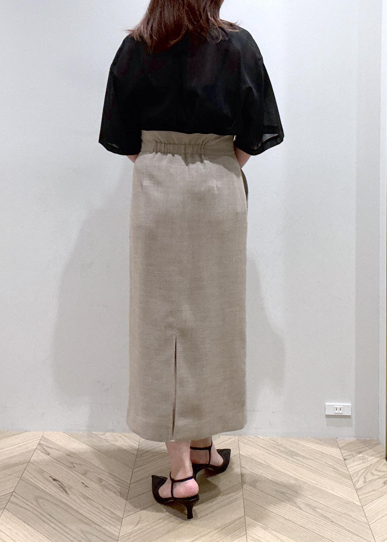 細身のシルエットですが、ウエスト後ろ部分がゴムになっているので窮屈感もなく、ハイウエストデザインでスタイルアップが叶います。