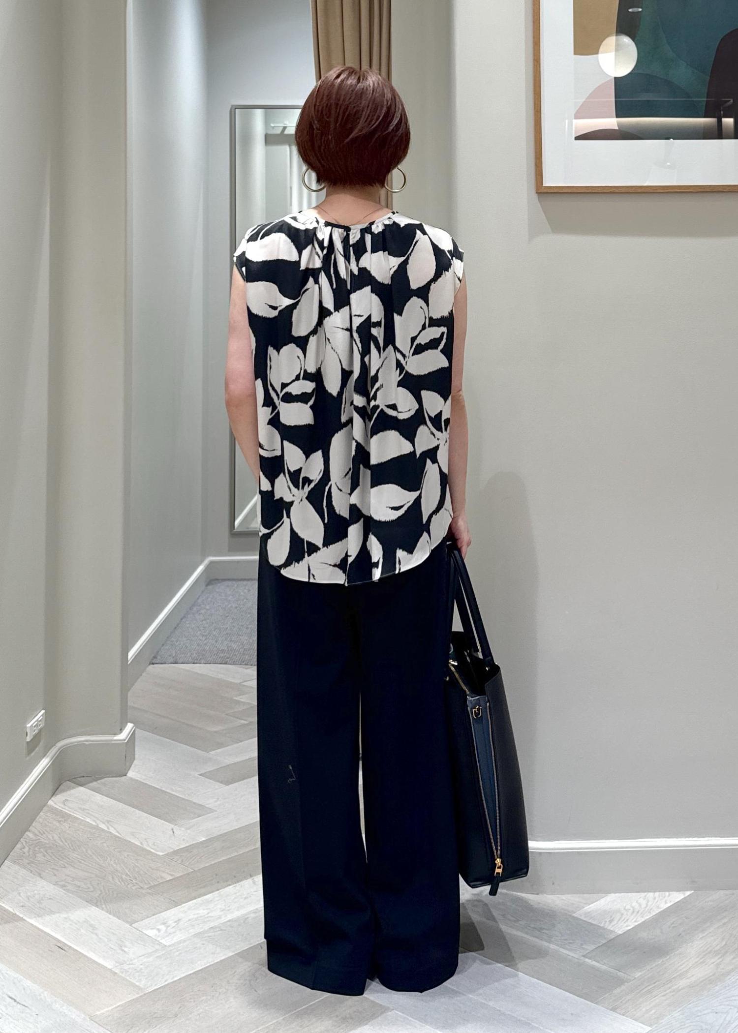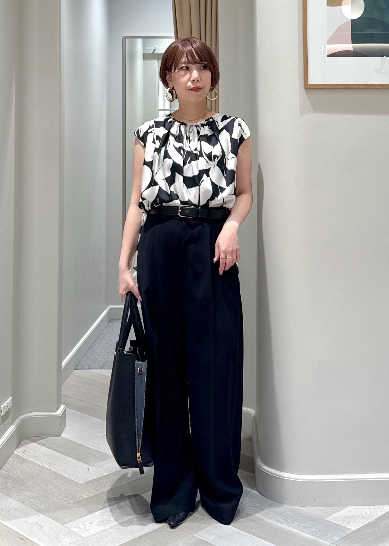DEVEAUXのブラウスをモノトーンでまとめたコーデ。