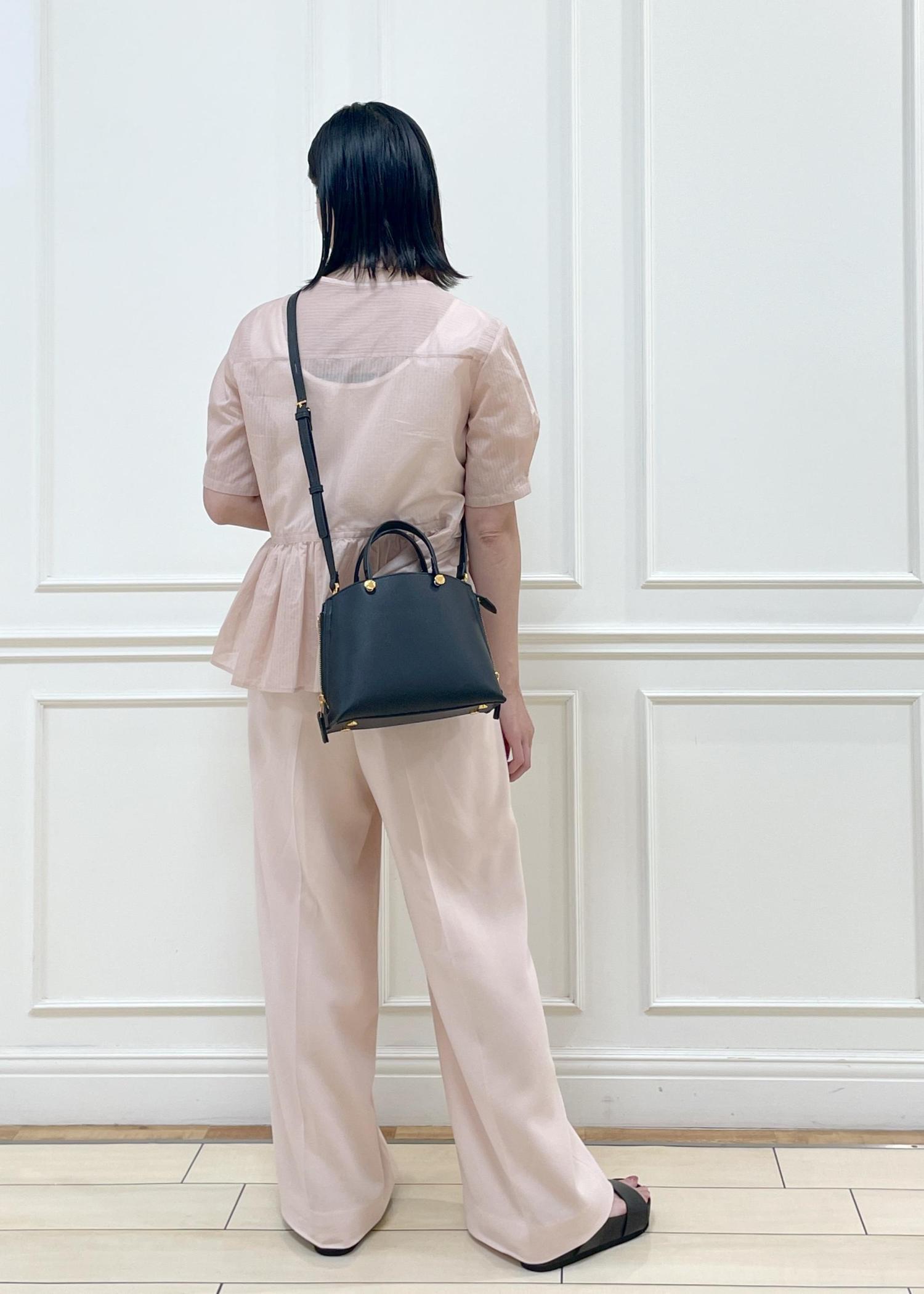 甘いピンクのスタイリングに、メリハリをつけたい時に活躍するブラックカラーの小物を合わせたコーディネートとなっております。