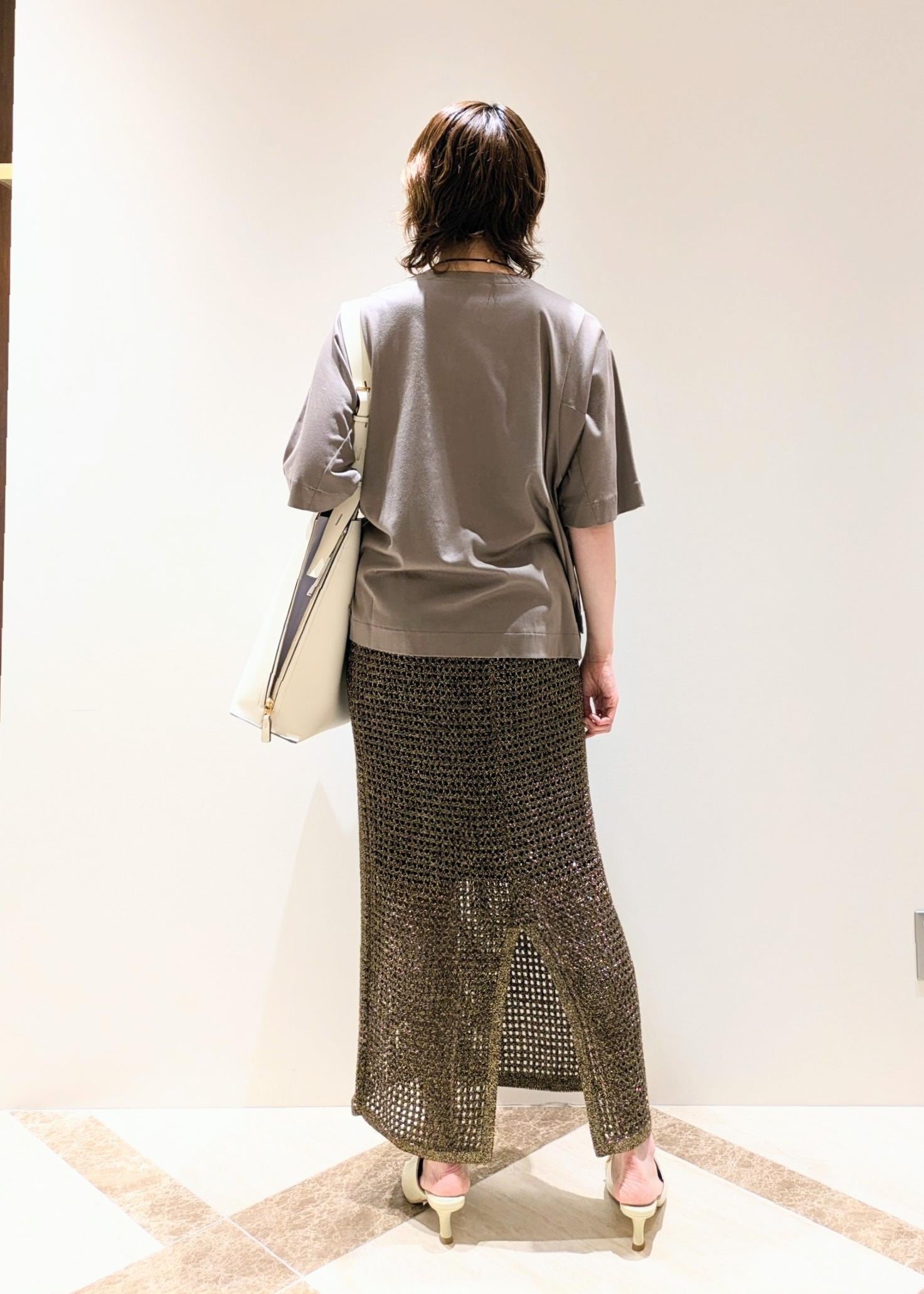 今回は、ラメが特徴的なメッシュのタイトスカートを合わせて、モードカジュアルにまとめました。