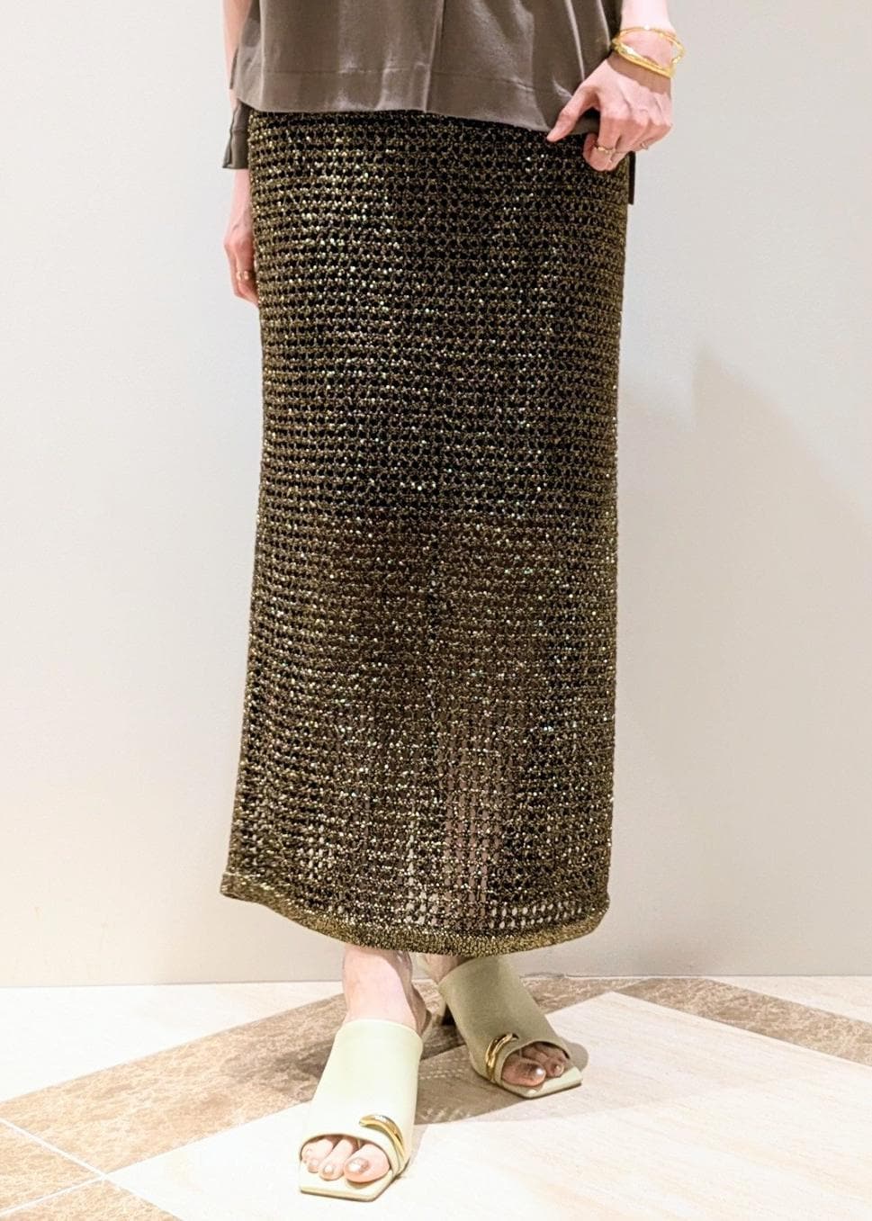 華やかなラメ糸が目を引く、Iラインのニットスカート。
