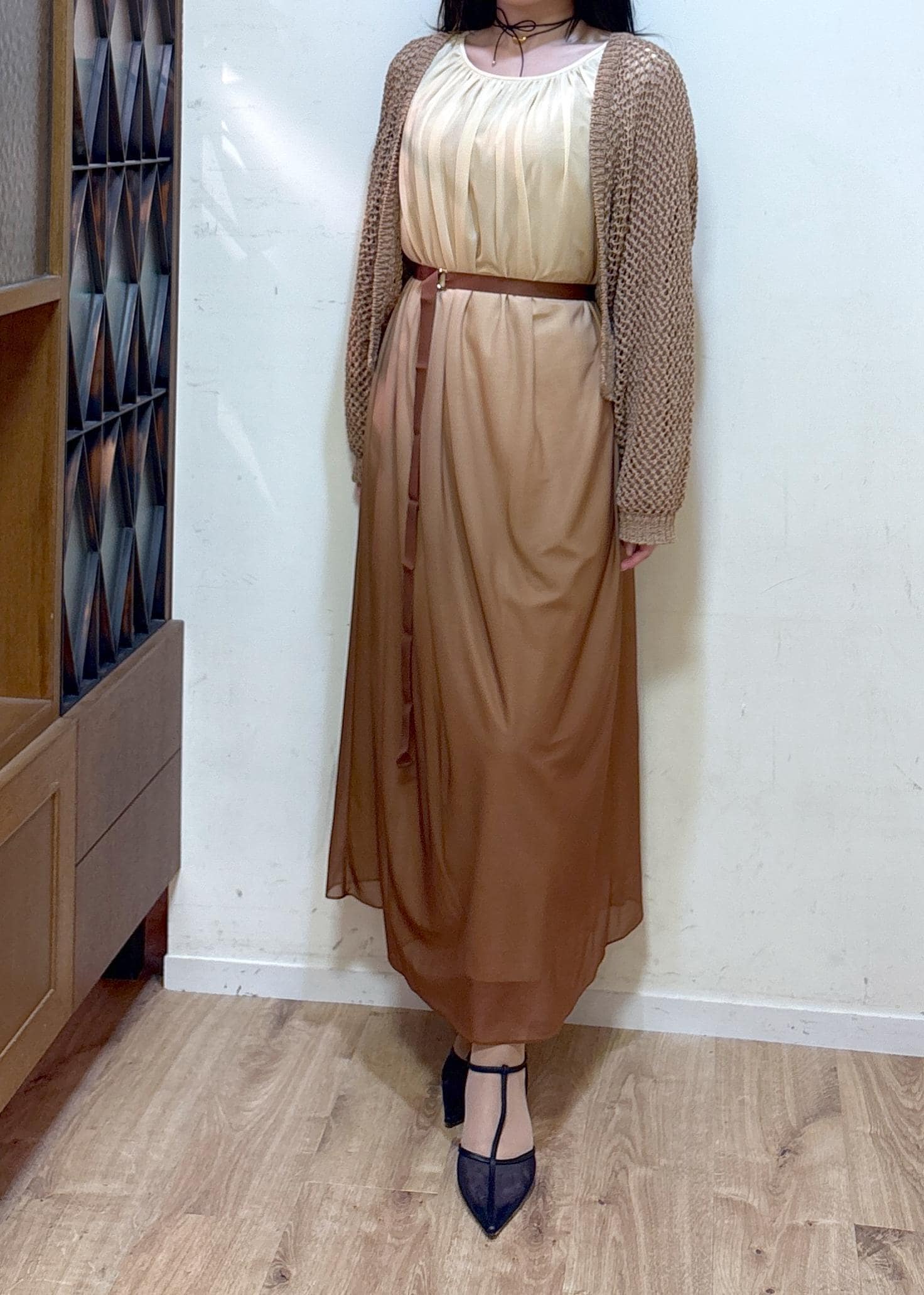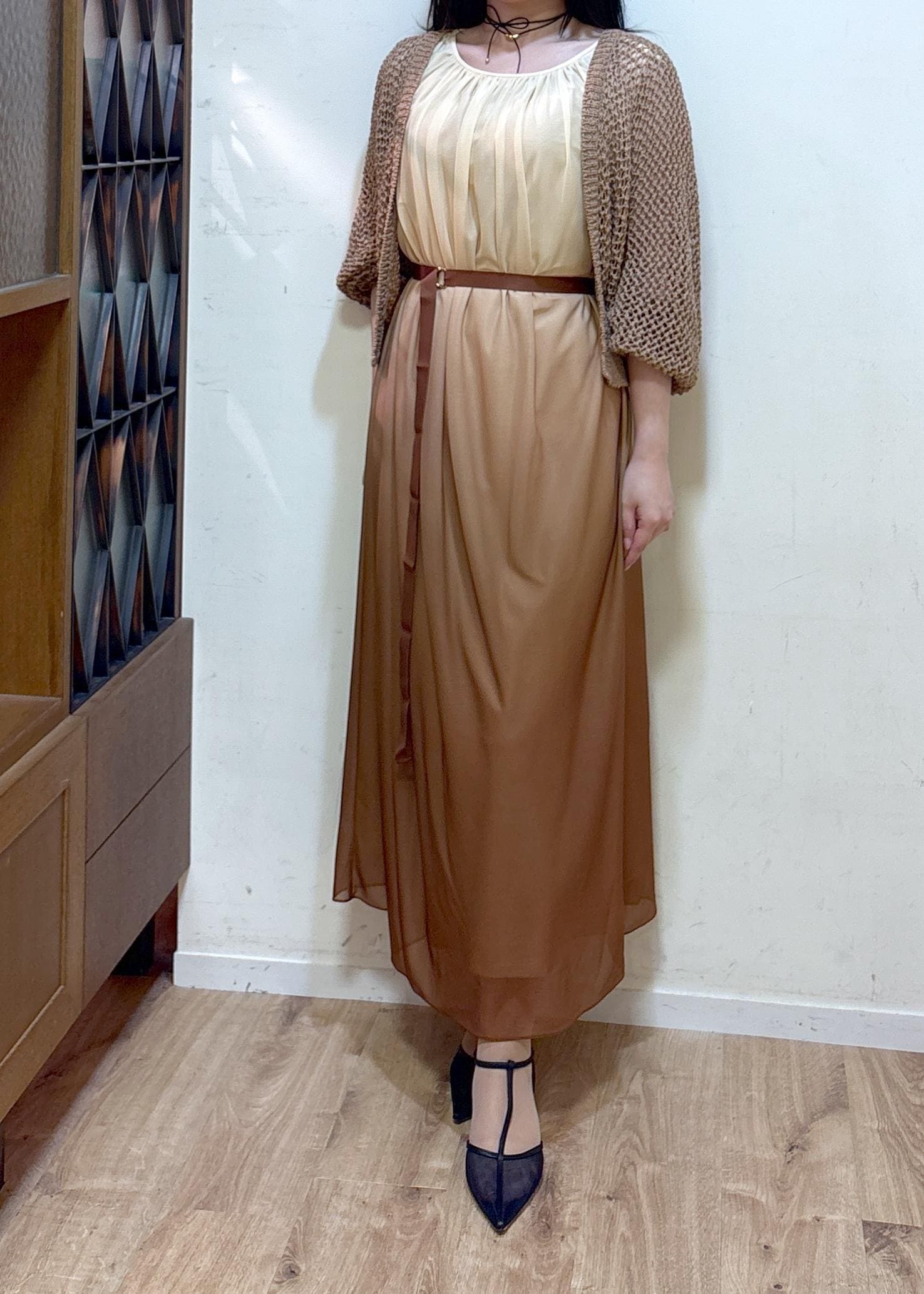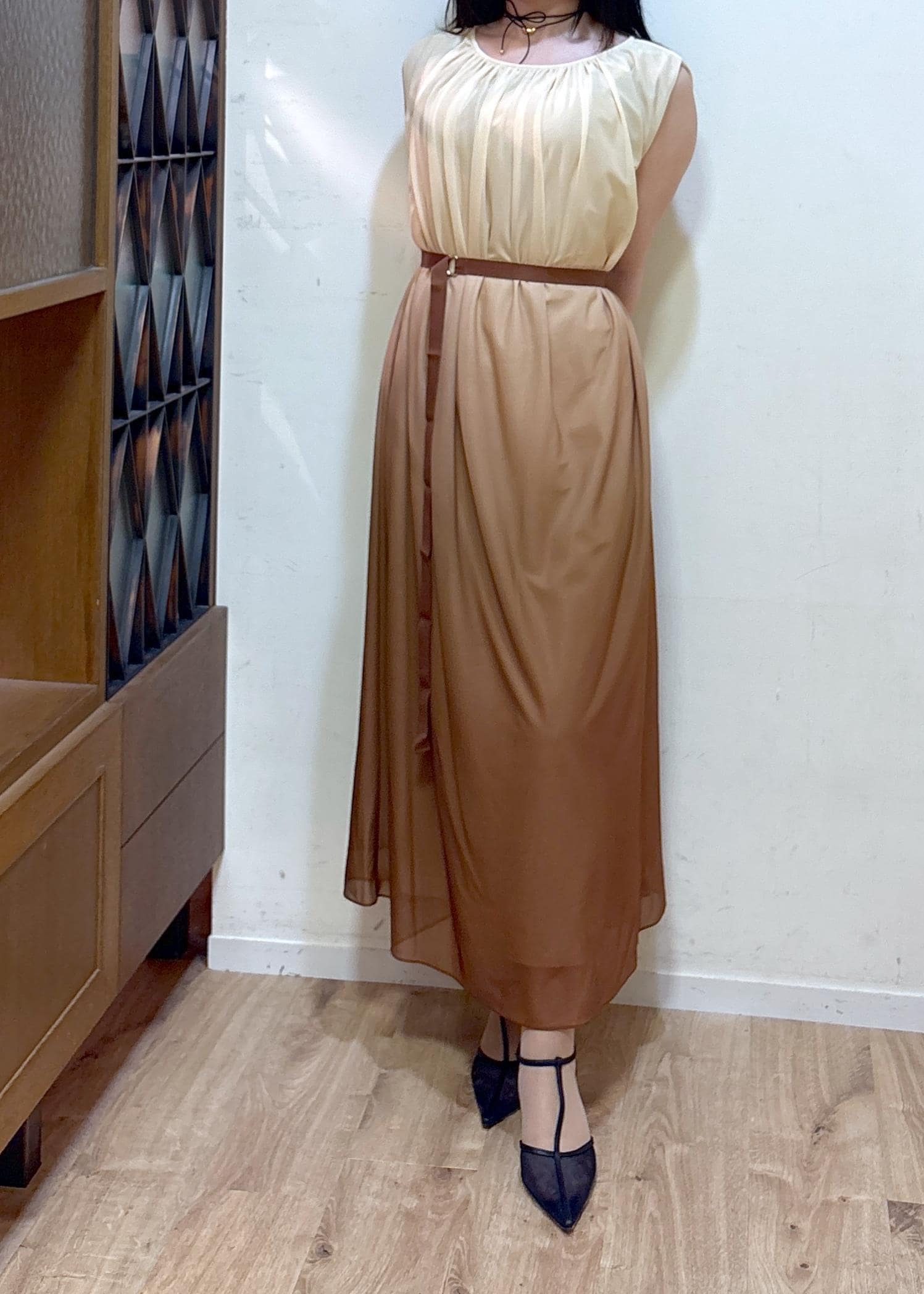 落ち着き感のある淡いイエローとブラウンのグラデーションで柔らかい印象のワンピースです。