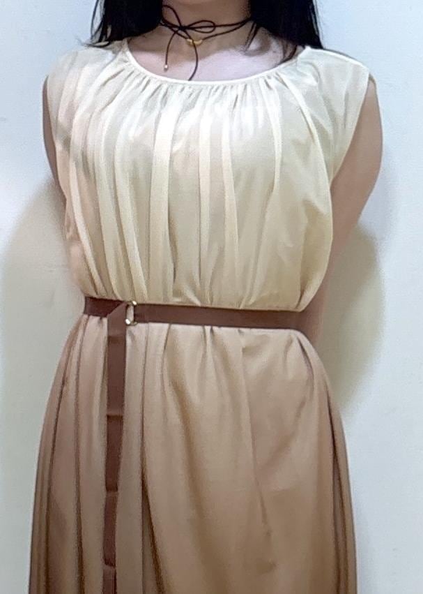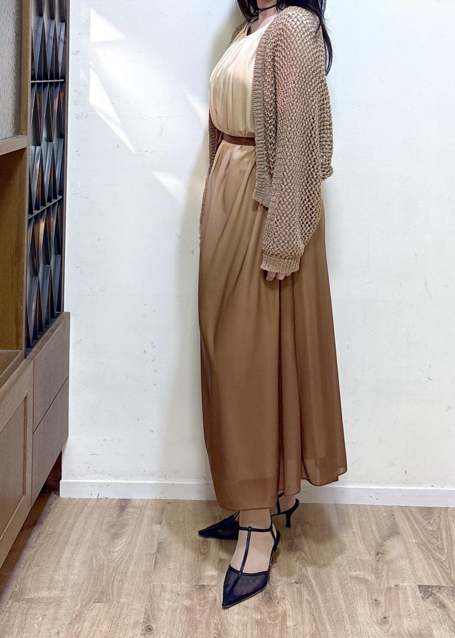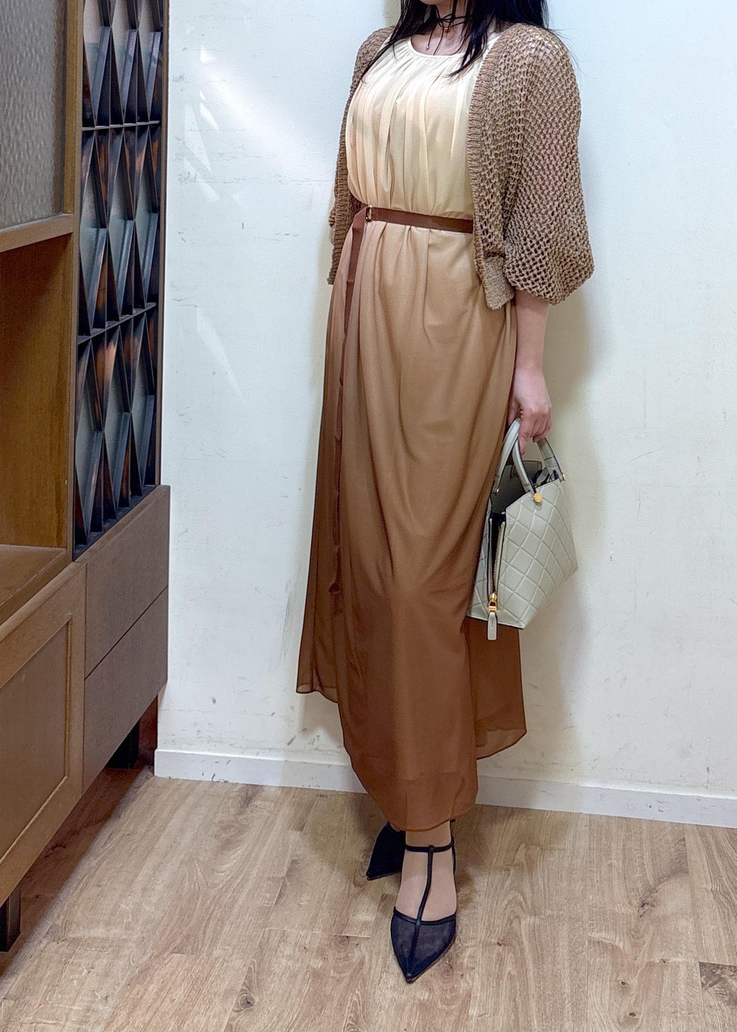 落ち着き感のある淡いイエローとブラウンのグラデーションで柔らかい印象のワンピースです。