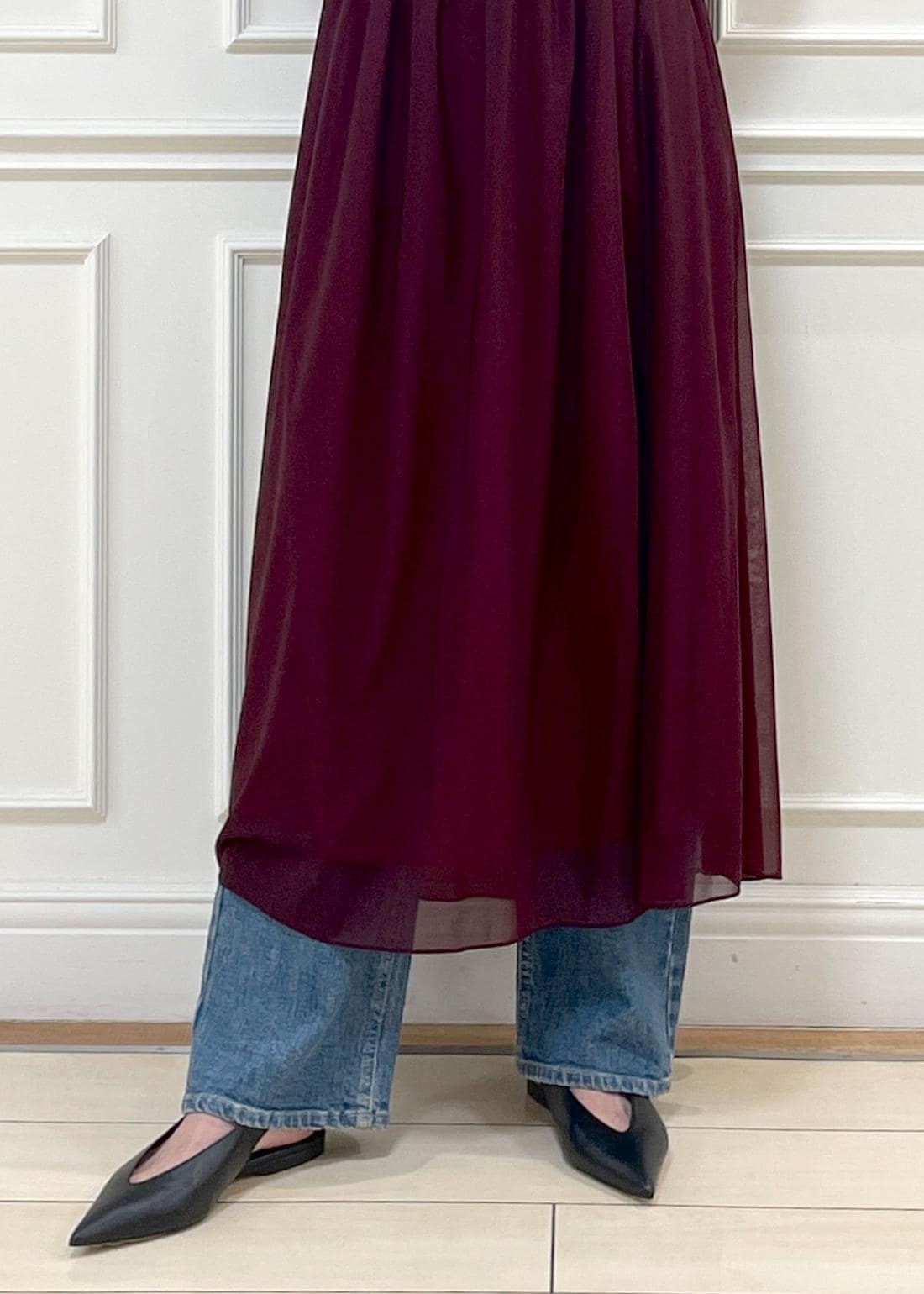 軽い着心地の上品見えのエアリーワンピースに、デニムをレイヤードすると普段使いがしやすい仕様になります。