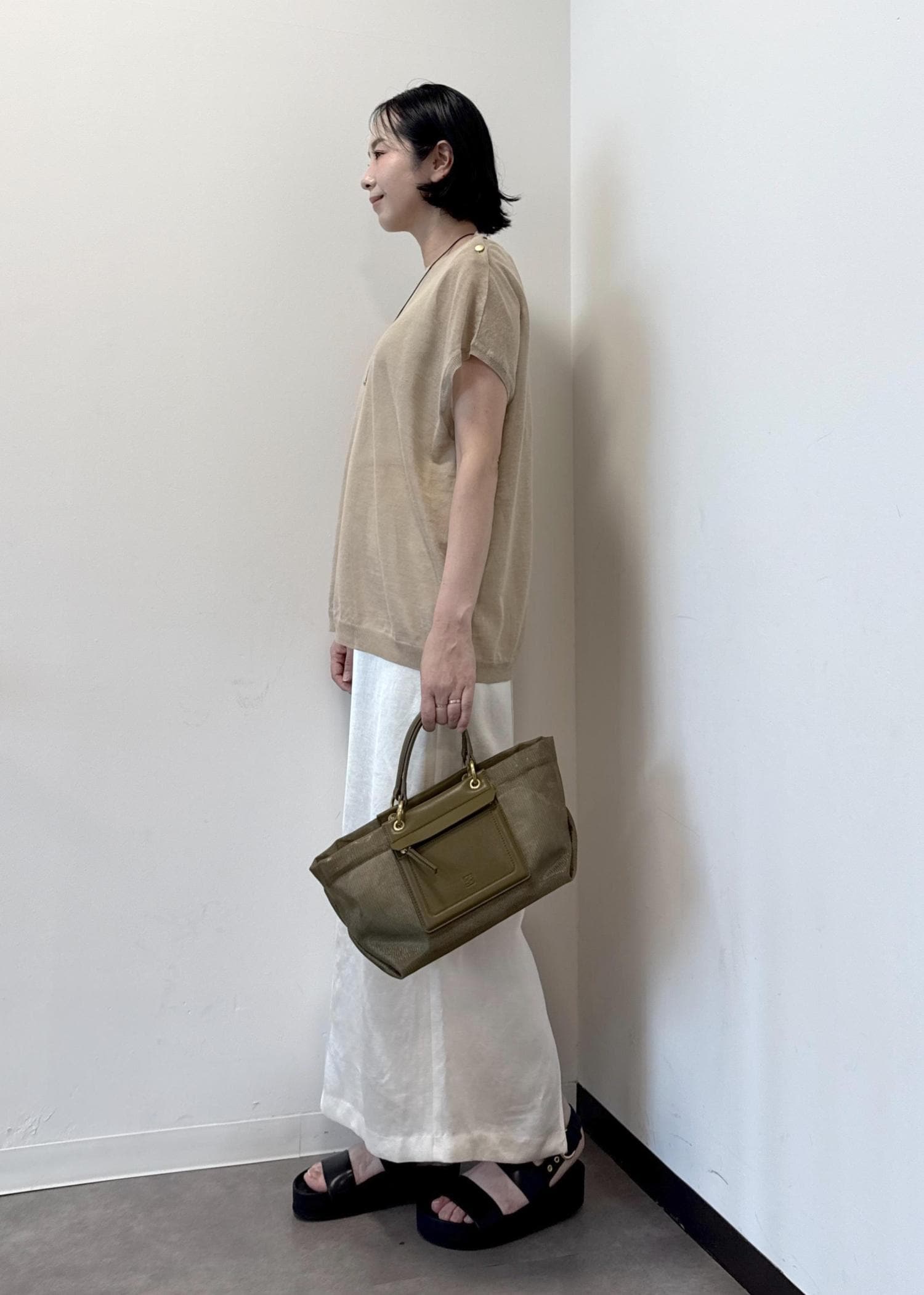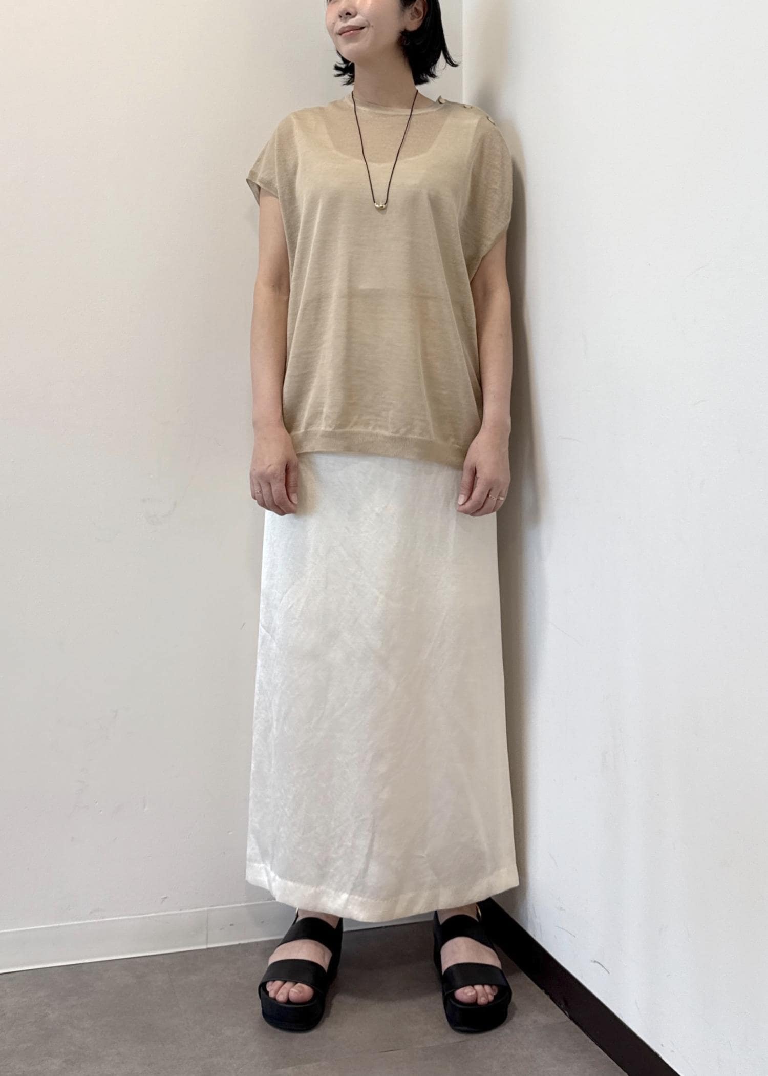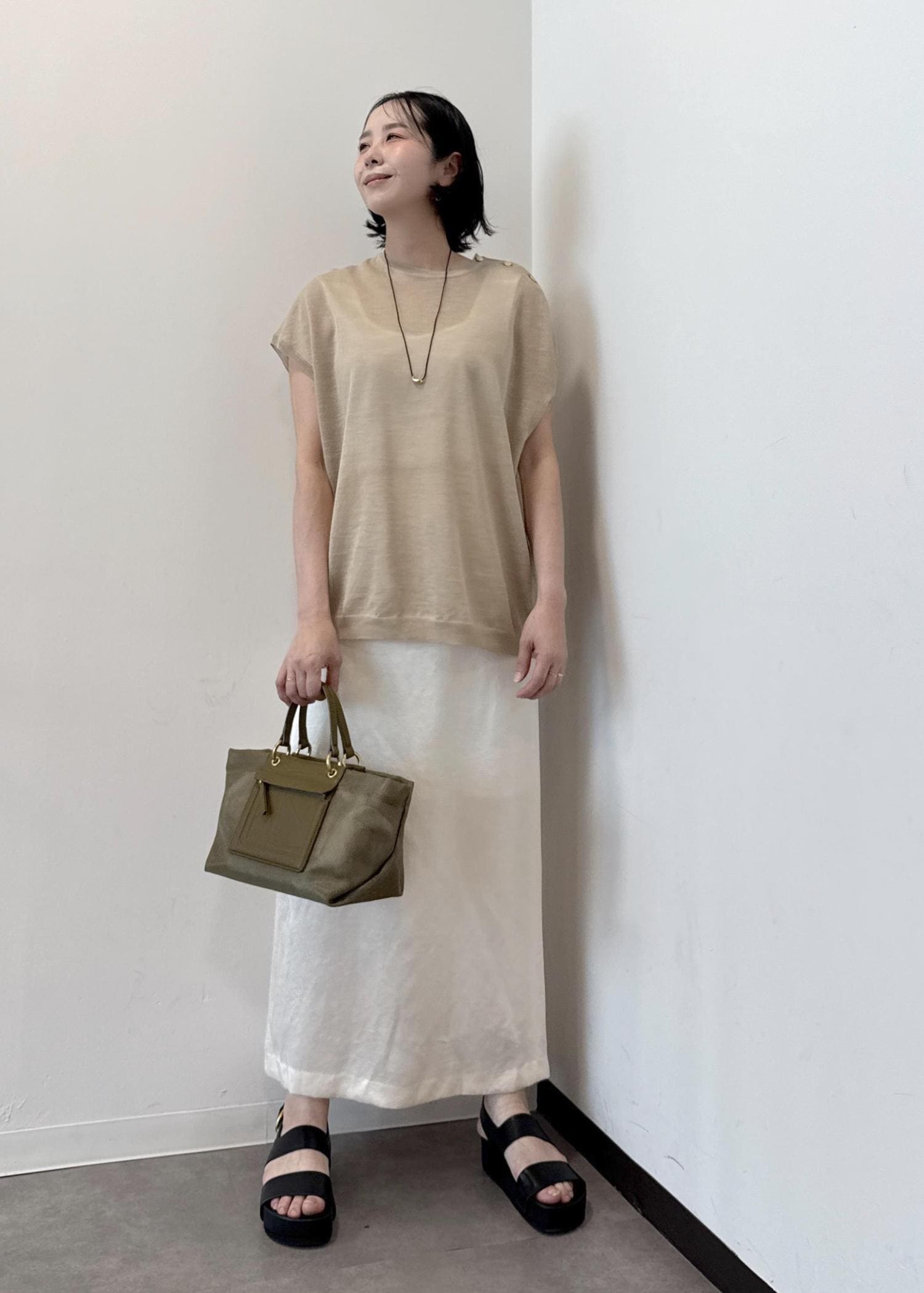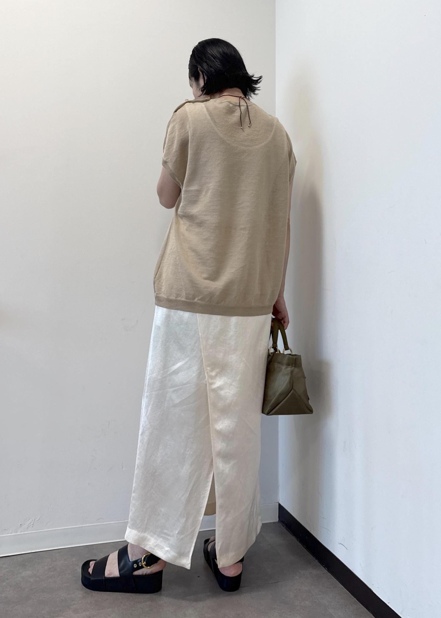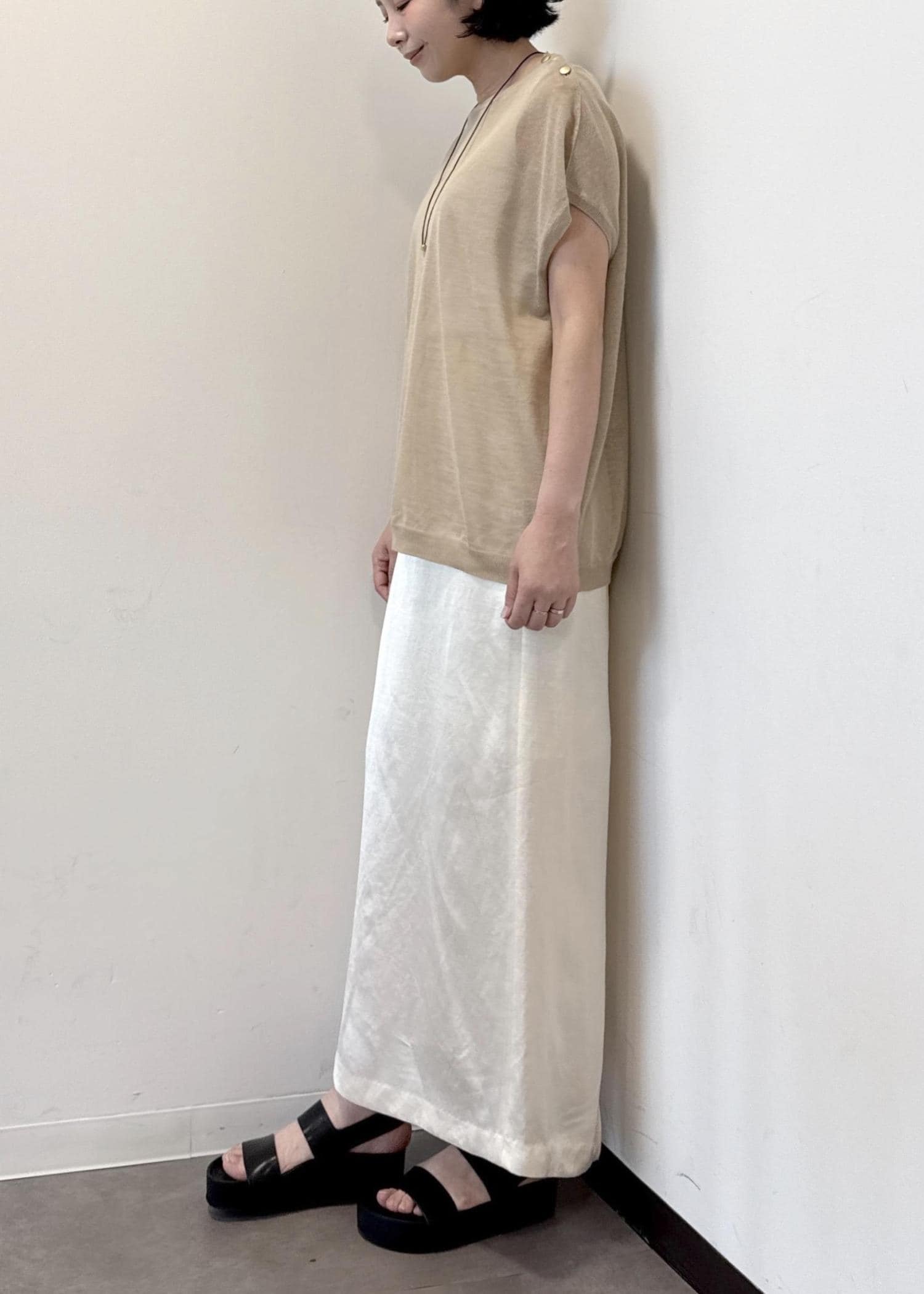 この暑い時にさらっと着用できるリネンニットはストレスフリー。体型カバーもしつつ肌離れも良いのでおすすめです!