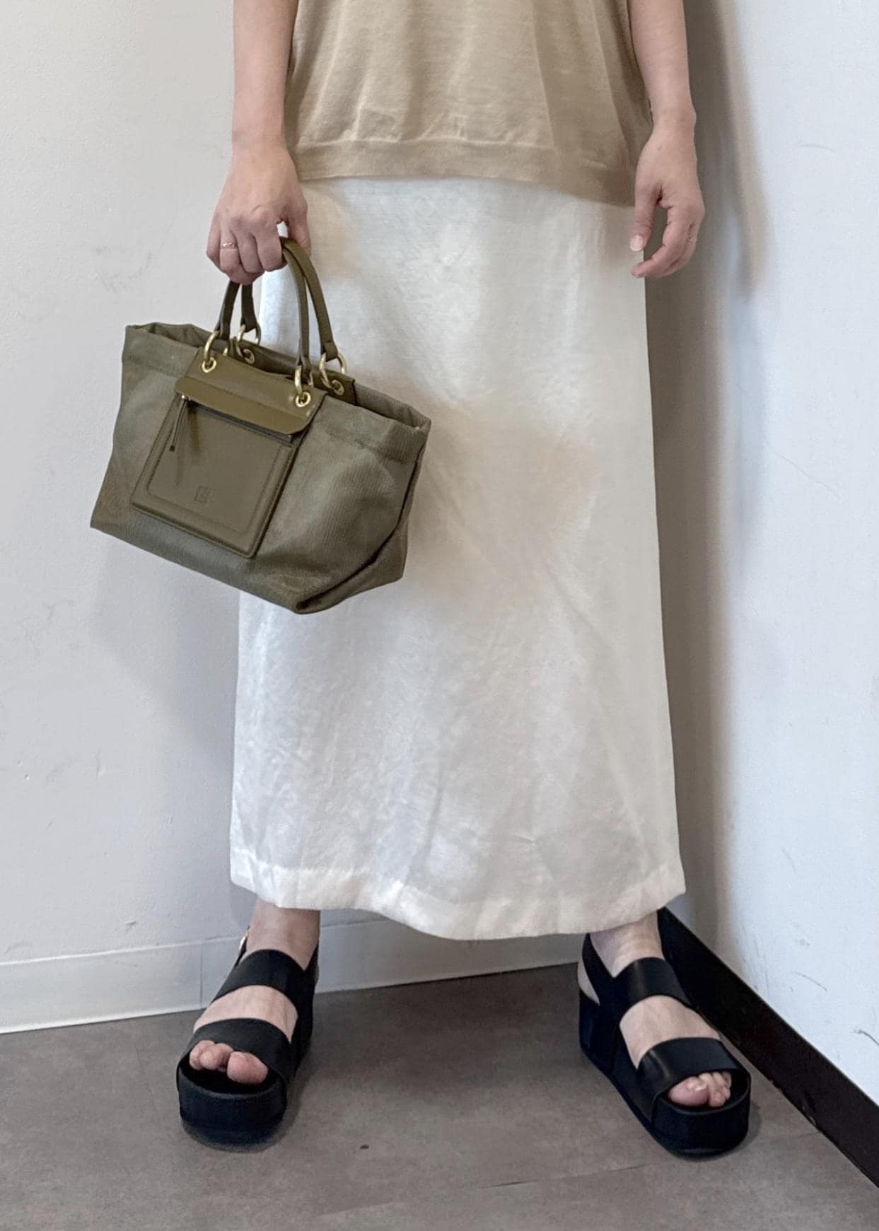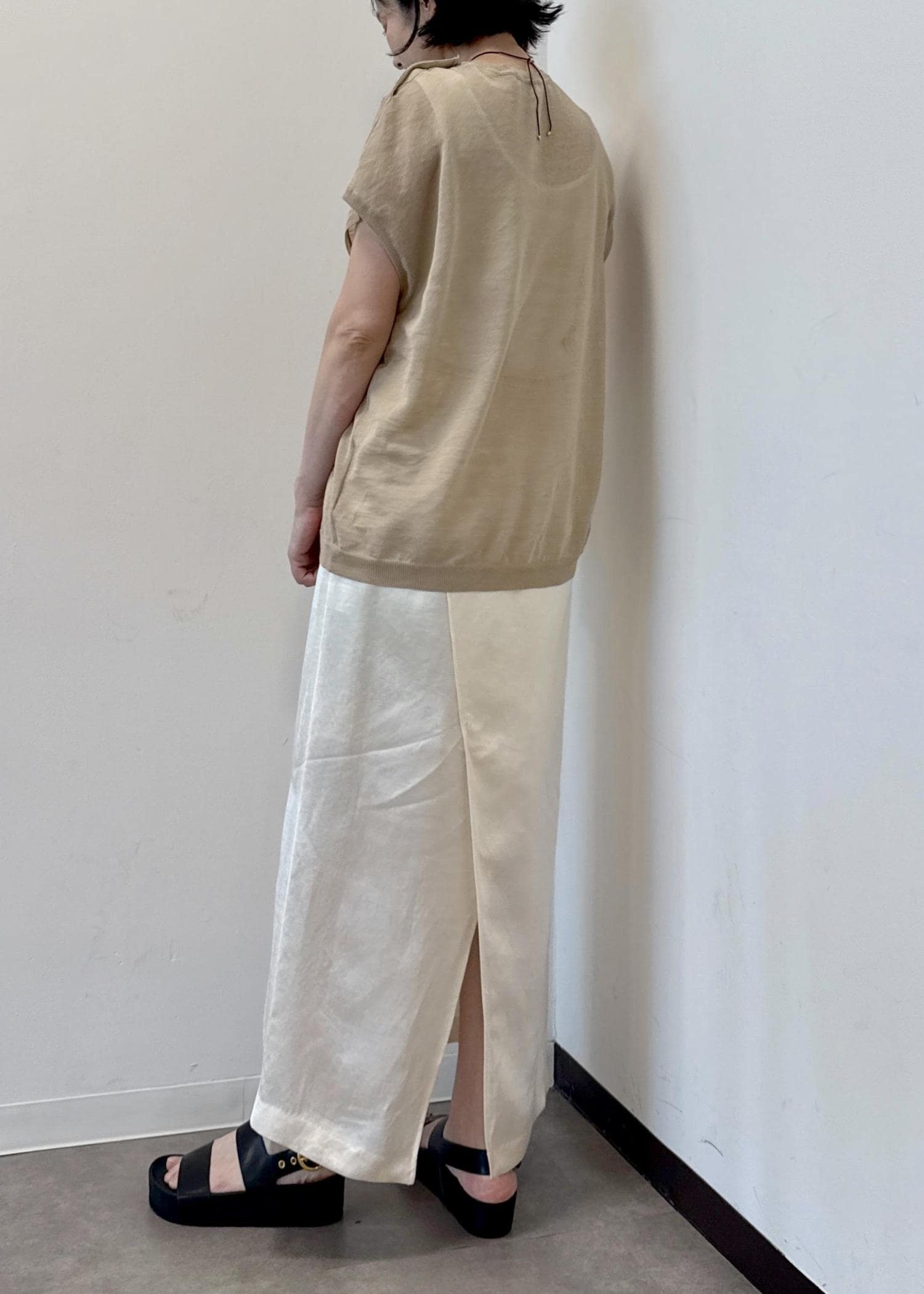リネン混のサテンIラインスカート。バッグスリットがクロスになっていて後ろ姿も素敵に見えます。