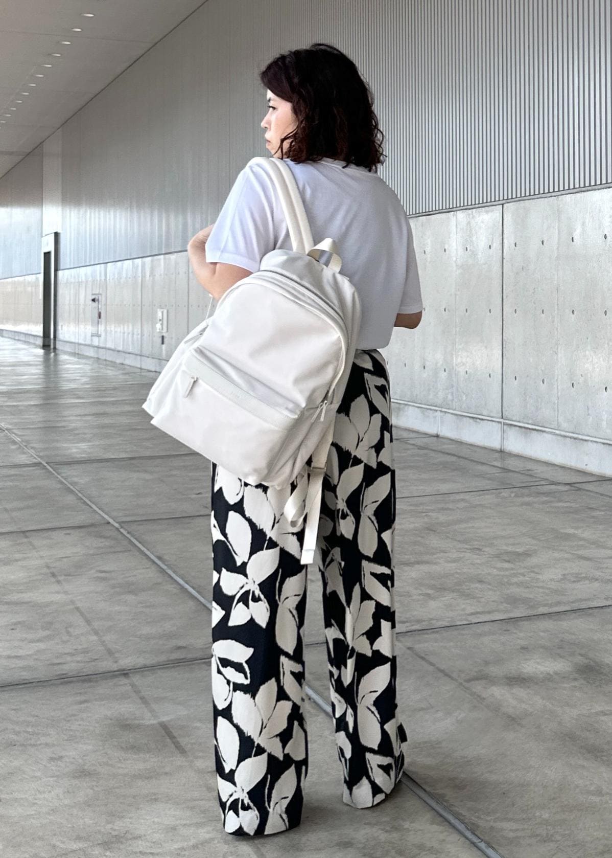 ヒール無しでもギリギリ丈詰めせずに履くことが出来ます。ウエストゴムでとても楽ちんですが、すっきり見える美シルエットのワイドパンツです。清涼感があり肌触りが良い素材感で、夏の暑い日も着やすいです。普段着でも旅行先でも色々なシーンで幅広く着ていただけます。