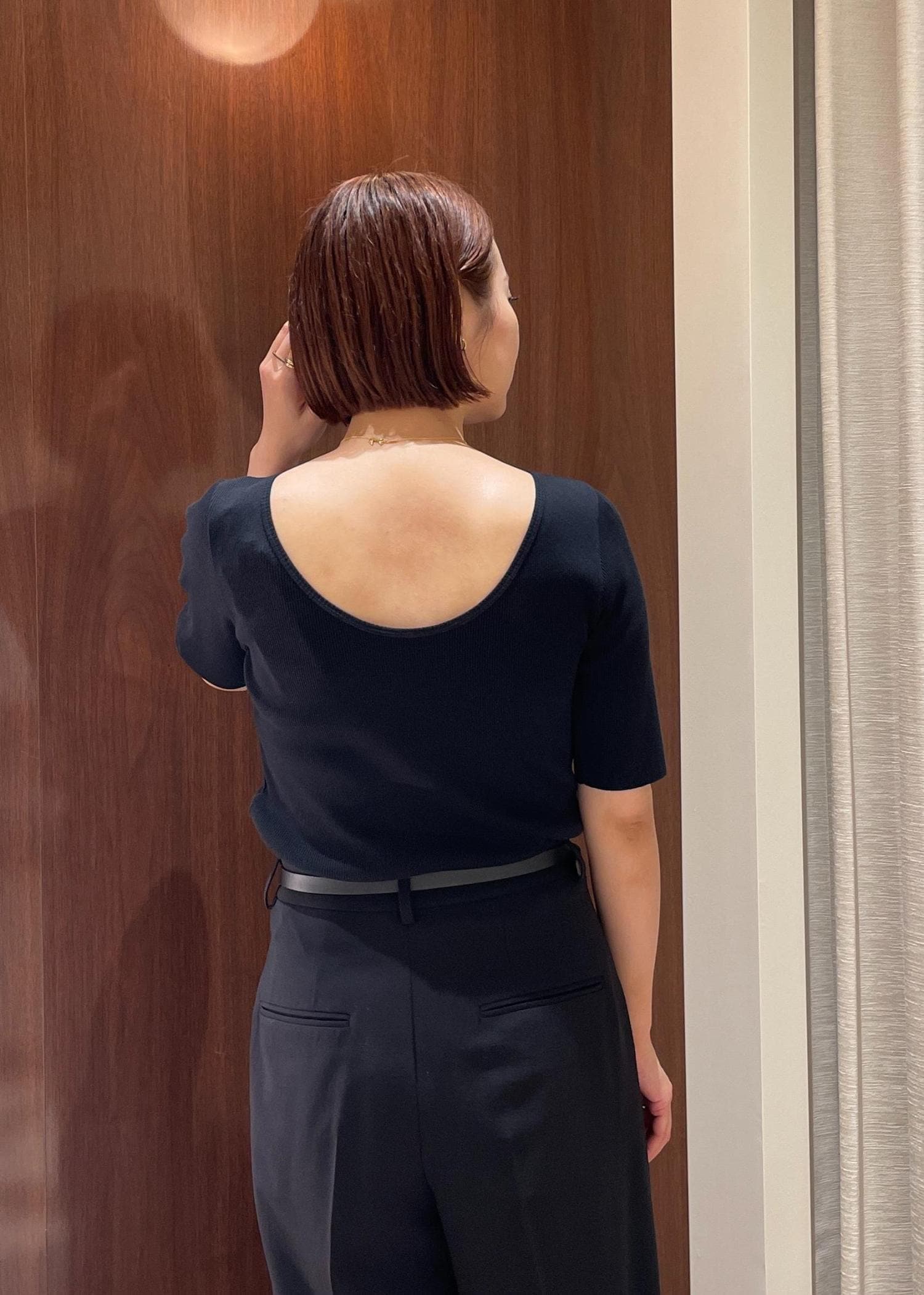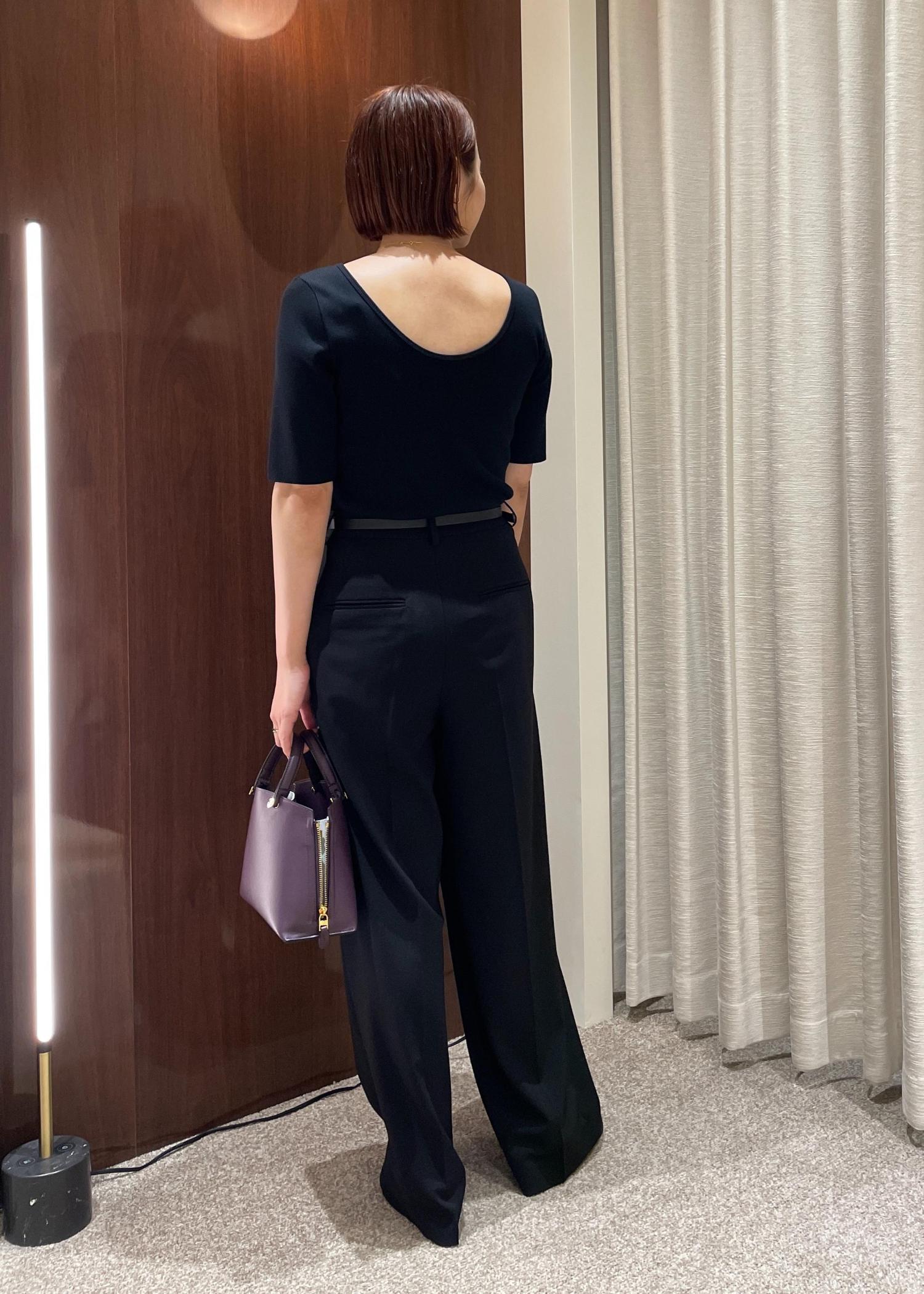 シンプルな合わせですが抜け感を出すためにトップスは背中が開いたものにして大人の程よい肌見せを。