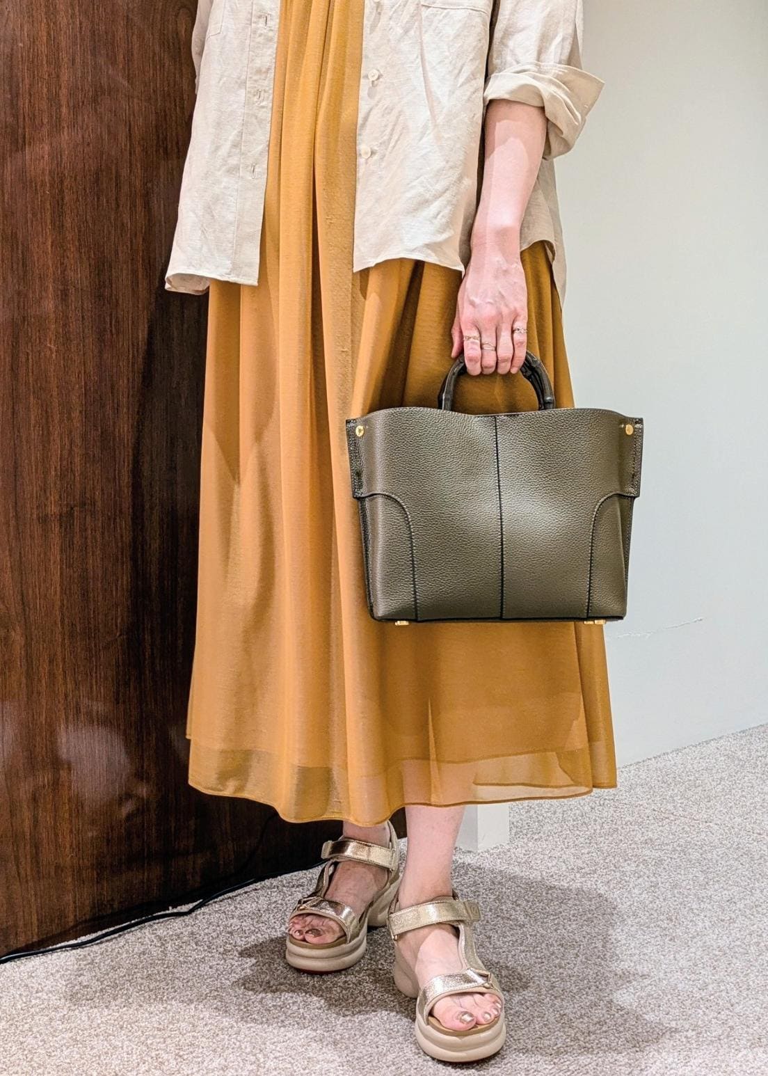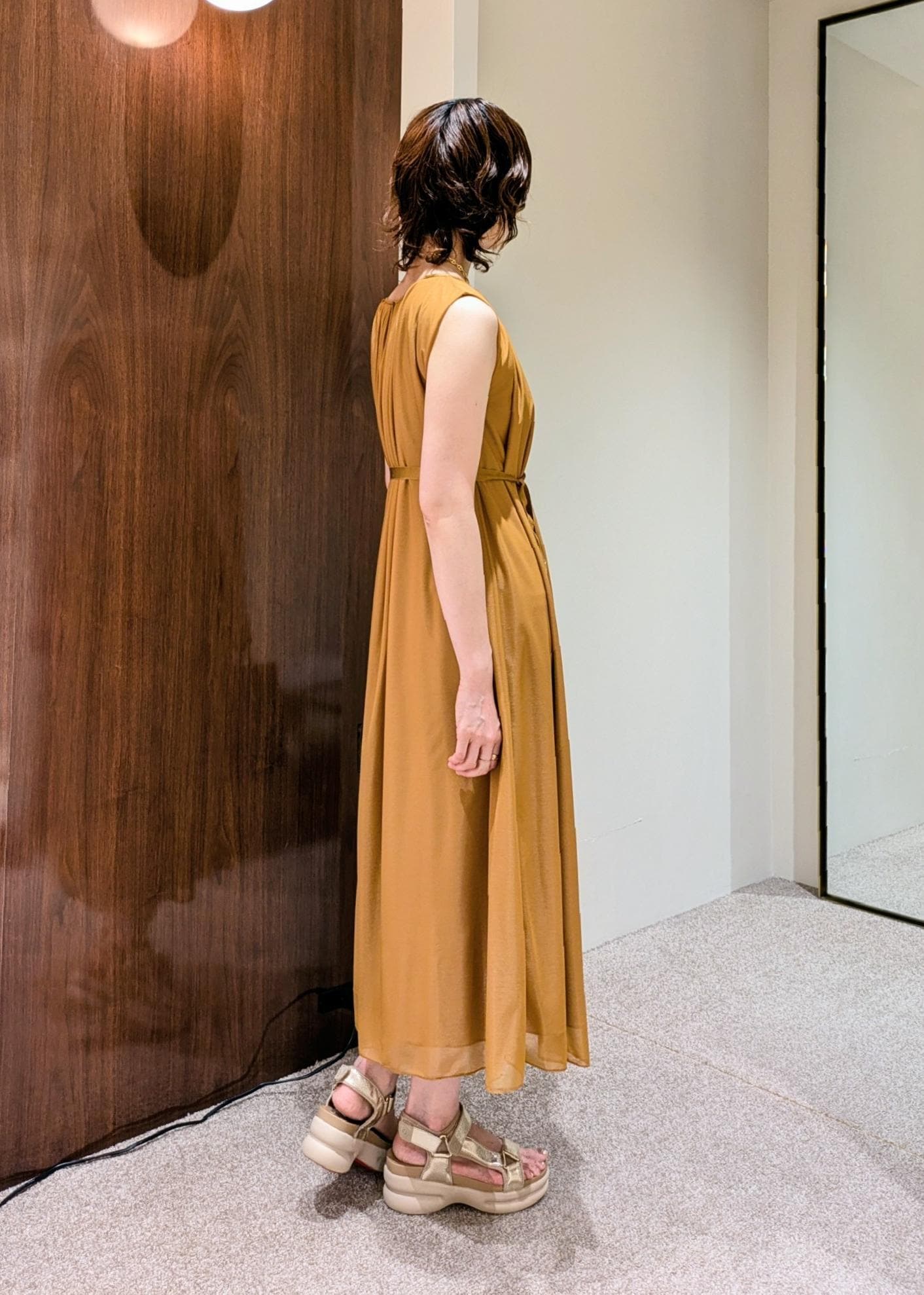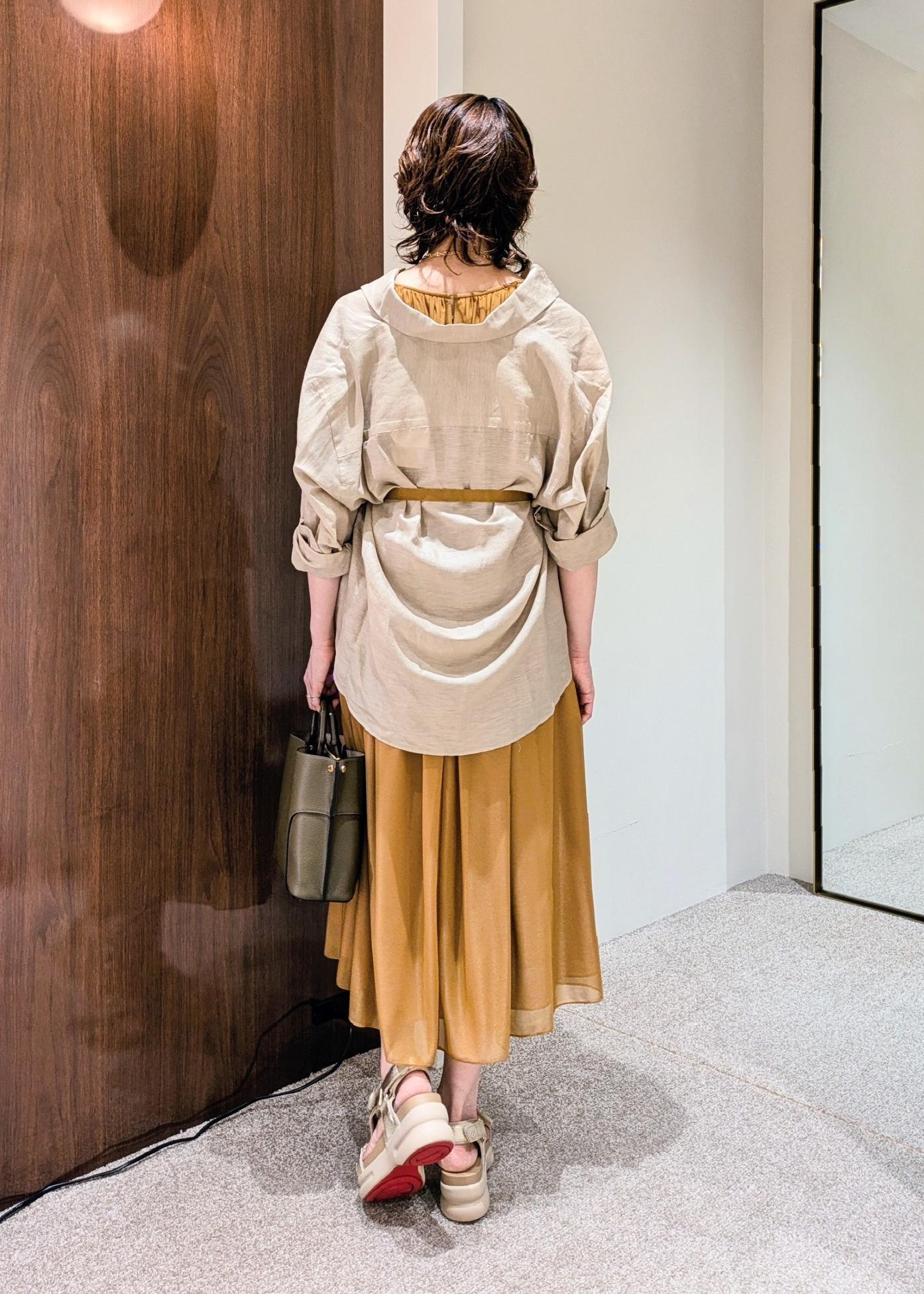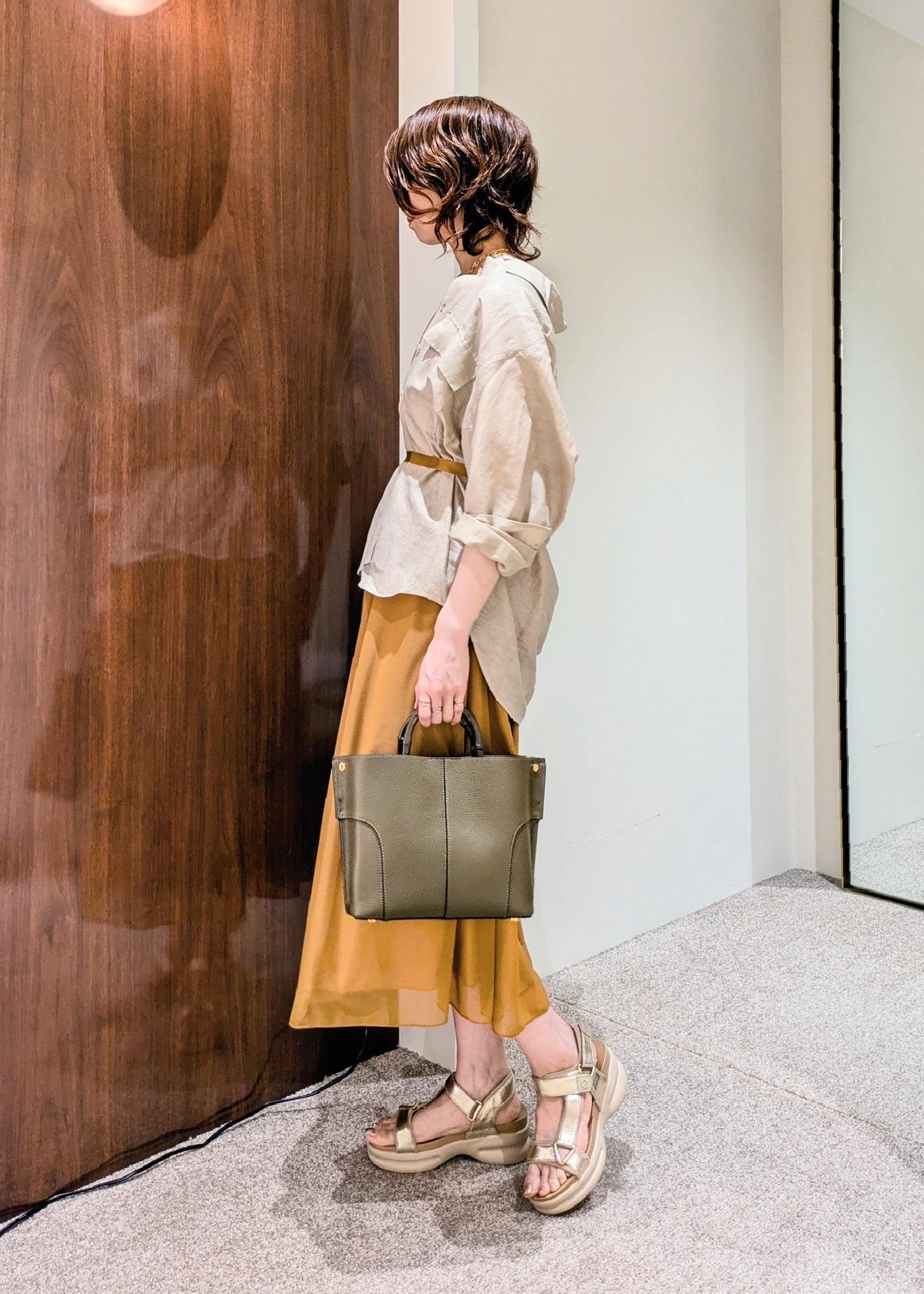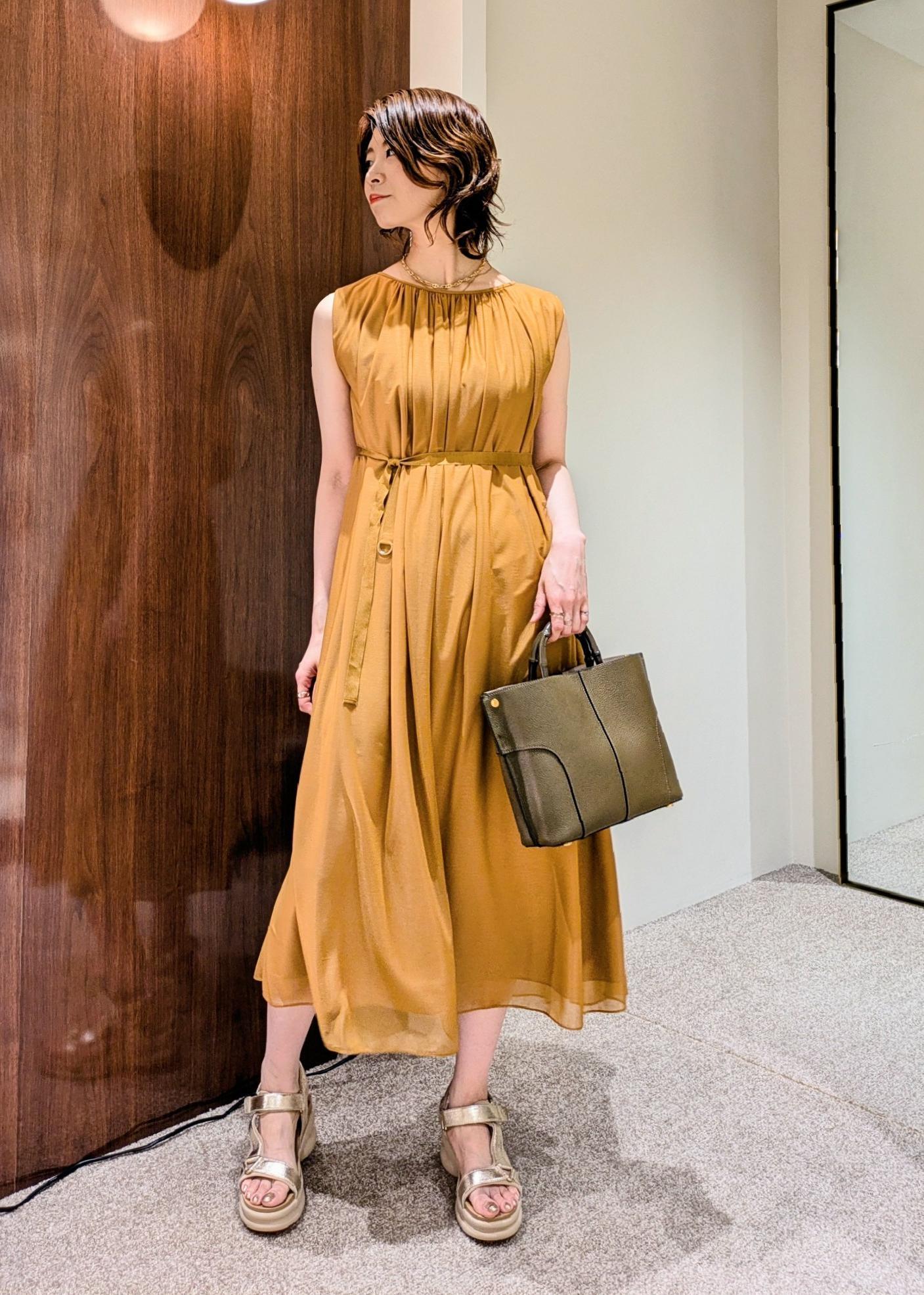 今回は、オレンジのワンピースをベースに、ベージュやカーキのニュアンスカラーでまとめて、大人カジュアルなスタイリングに仕上げました。