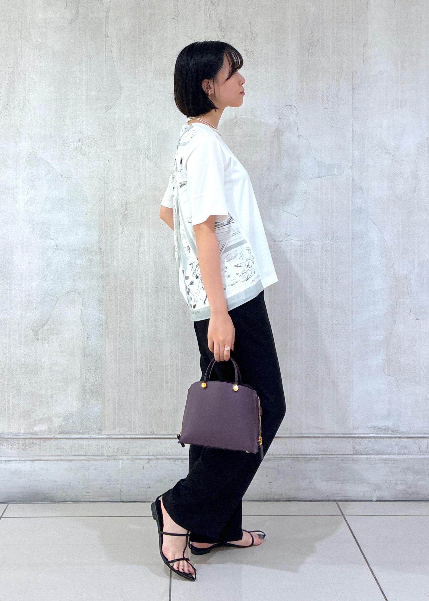 モノトーンコーデに、シックなカラーのミニバッグをポイントにしてみました♪
