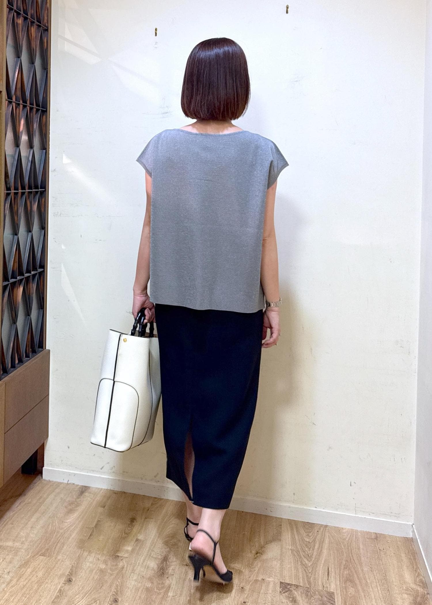 夏から晩夏に向けて涼やかなシアー感が上品見えするベーシックニットです。Tシャツ感覚で着られるのでボトムは何にでも相性抜群です。
