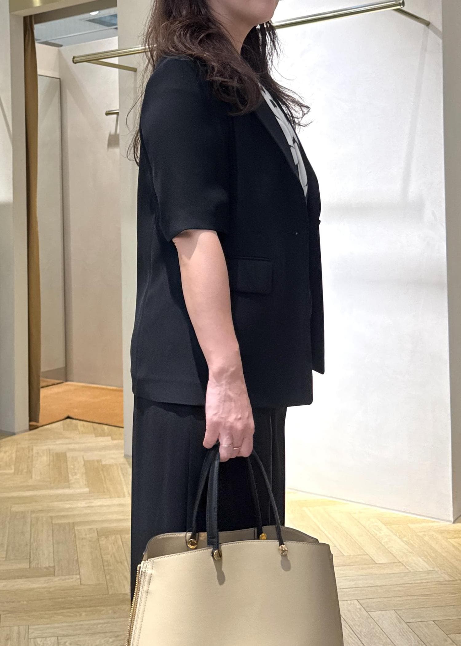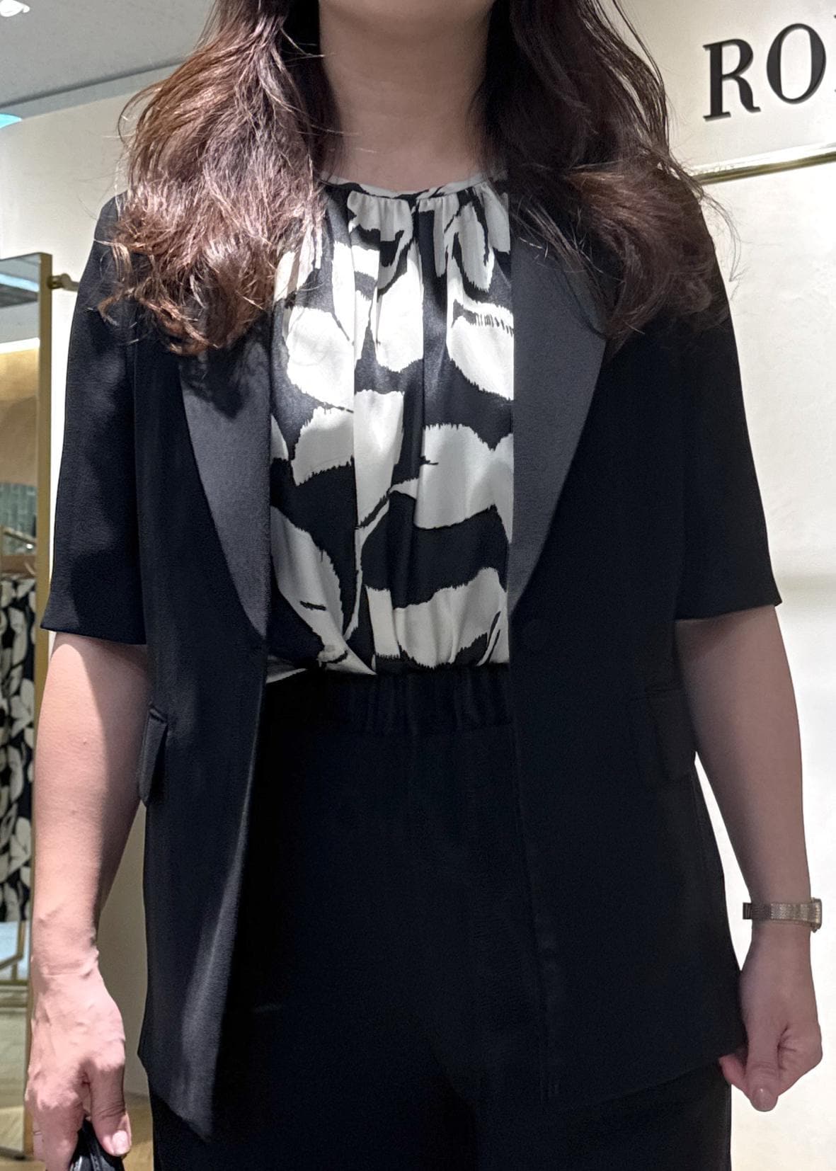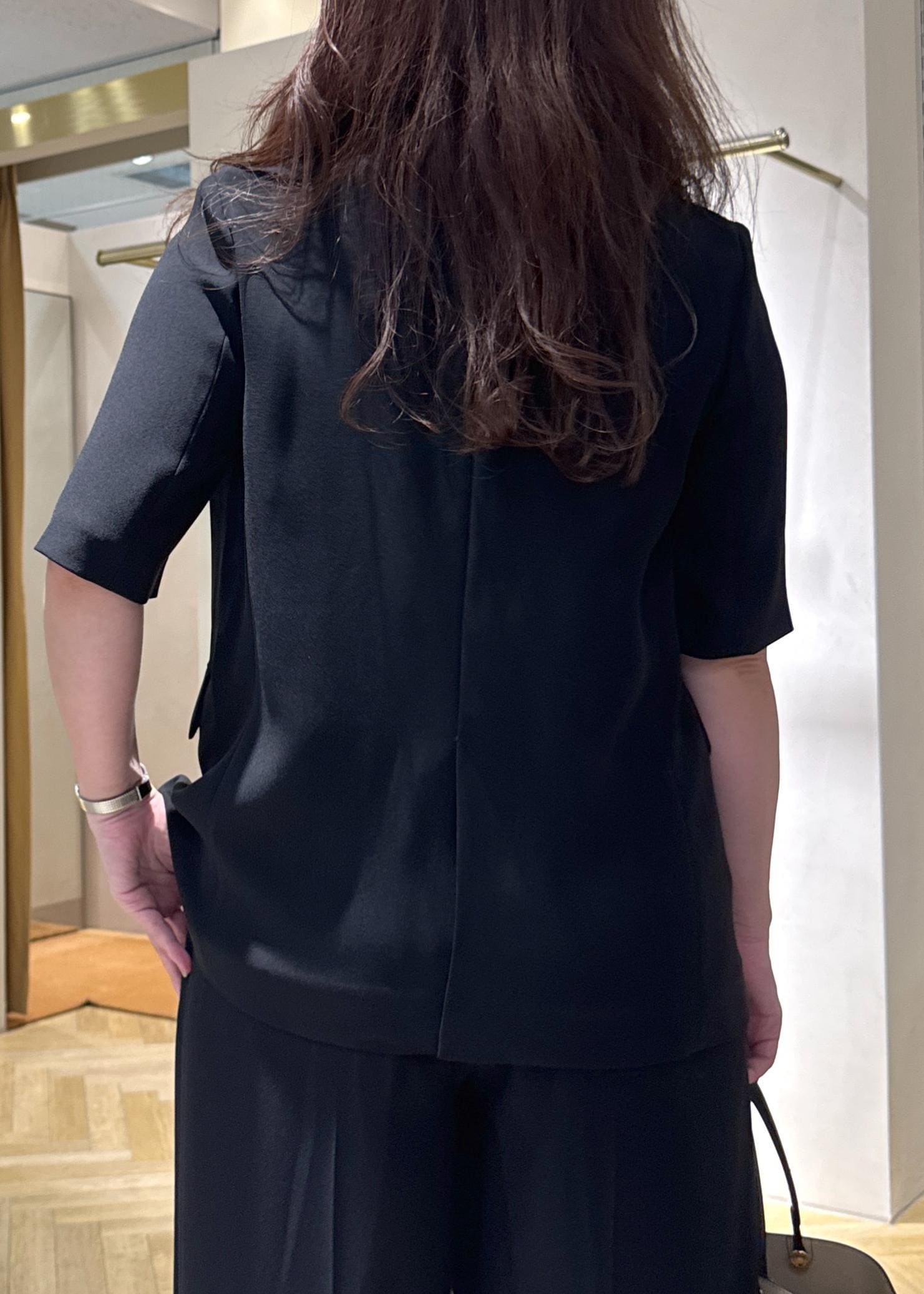ROPÉ【洗える・カセット服・新色追加】トリアセバックサテン ハーフスリーブジャケット/セットアップ対応ブラック /¥31,900レビュー38サイズを着用しています。