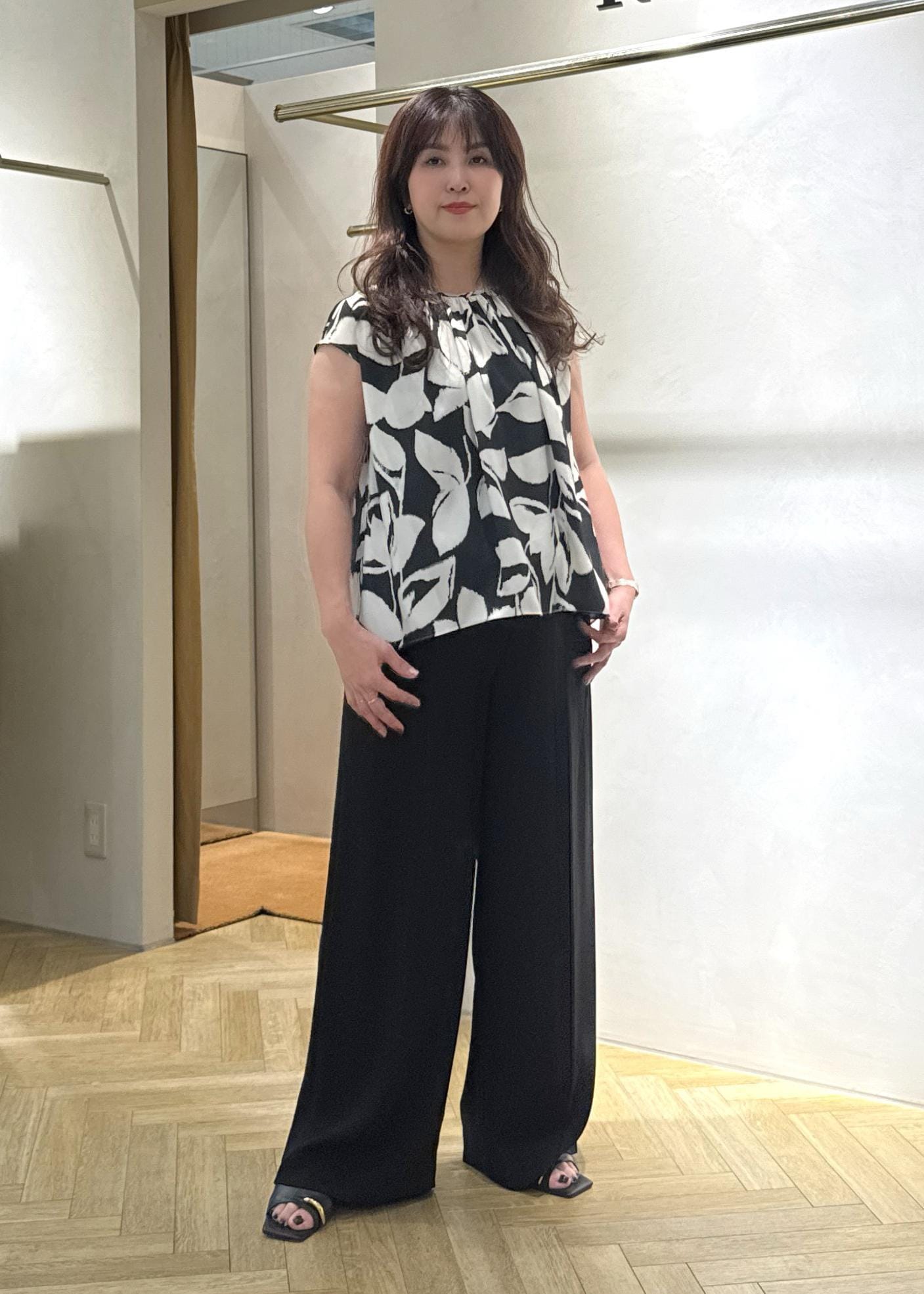 モノトーンな柄のブラウスをポイントにプラスすればこなれ感とオシャレ度アップで気分が上がります♪