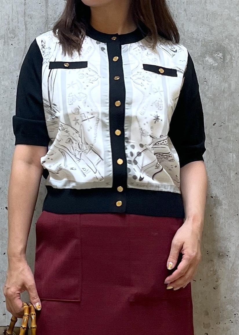 トップス代わりに使ったカーディガンは、スカーフ柄とニットがドッキングしていて着るだけで華やかに!