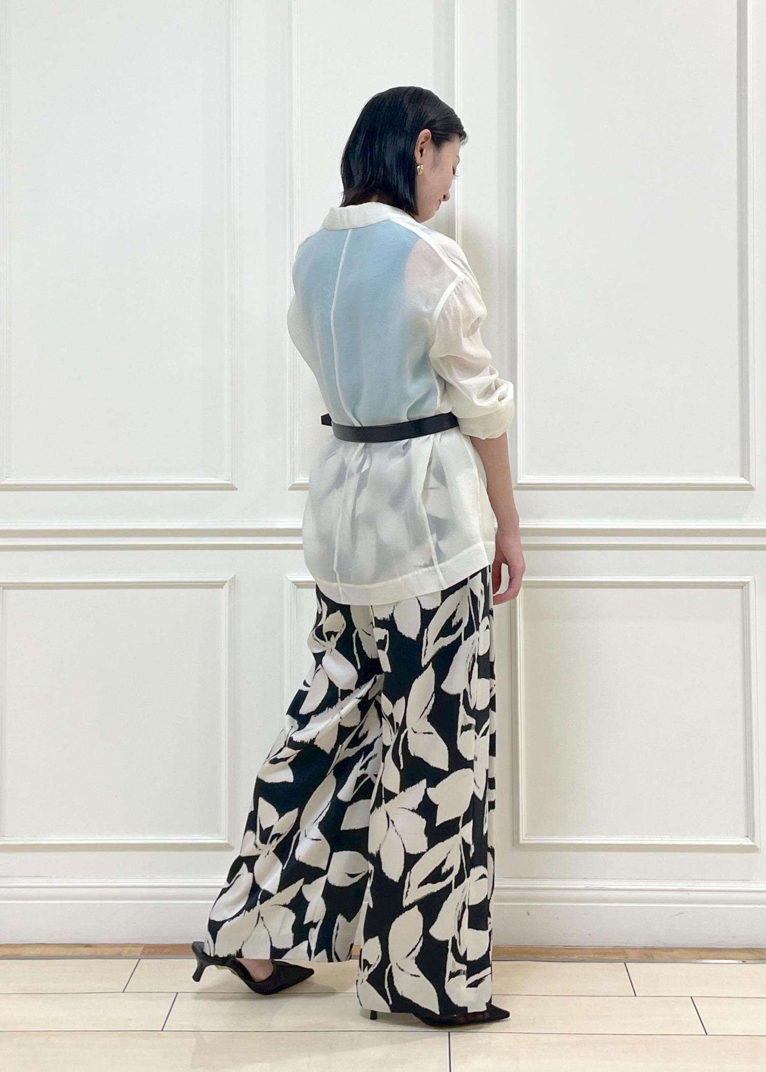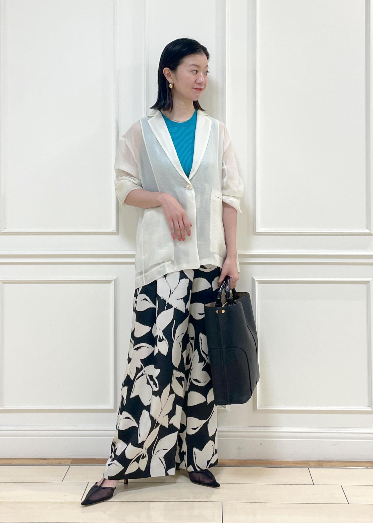 冷房、日焼け対策に最適なシアージャケットとフランスのテキスタイルメーカーDEVEAUX(デヴォー社) の別注生地、花柄パンツを組み合わせたスタイリングです。