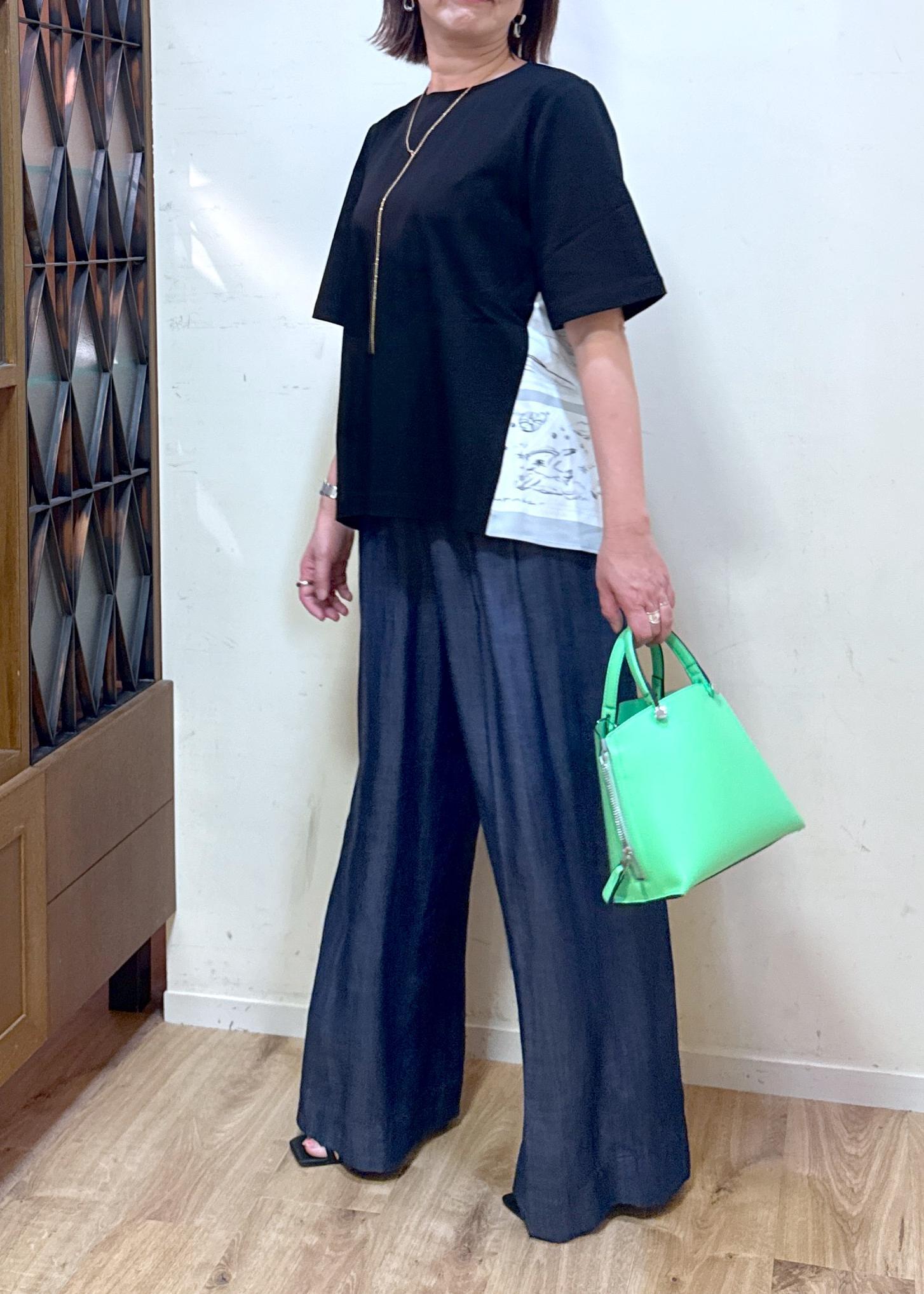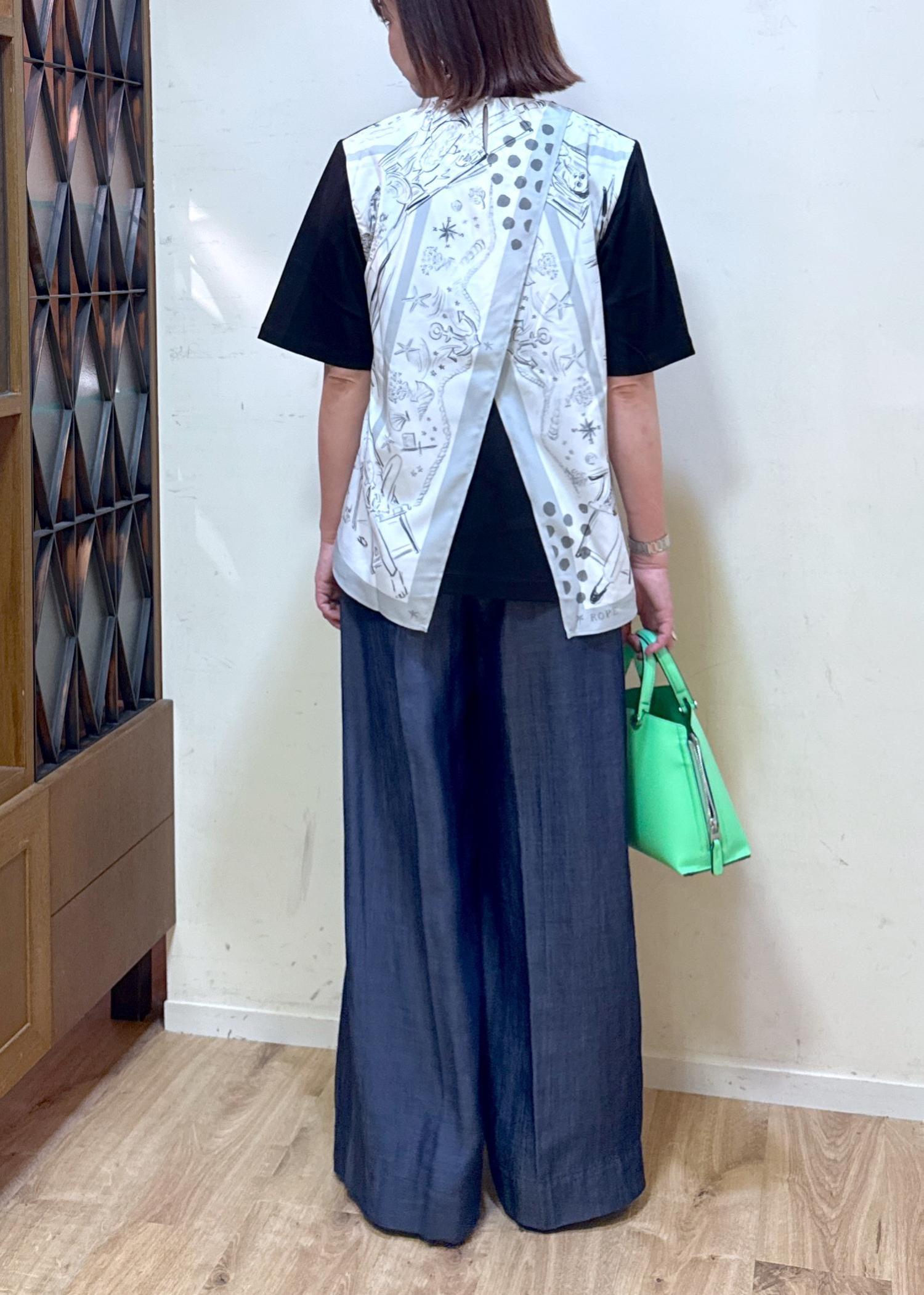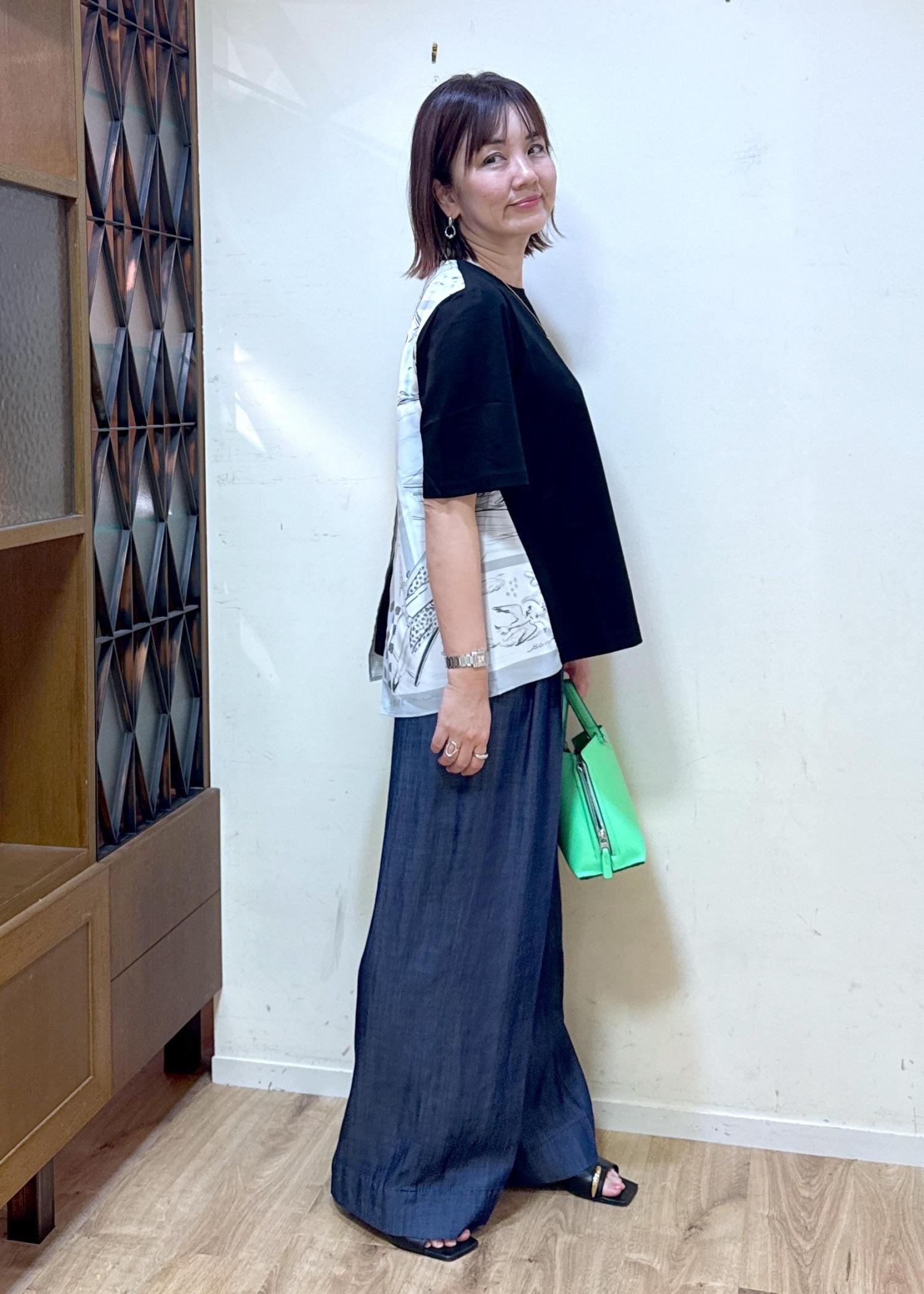 イラストレイター佐伯ゆう子さんとのコラボレーションのスカーフ柄プリントのカットソーにデニムスタイル!