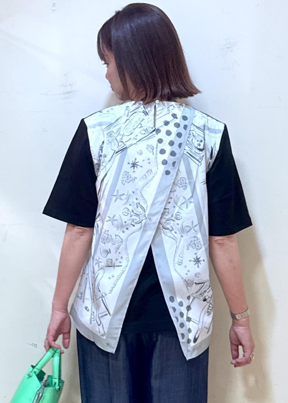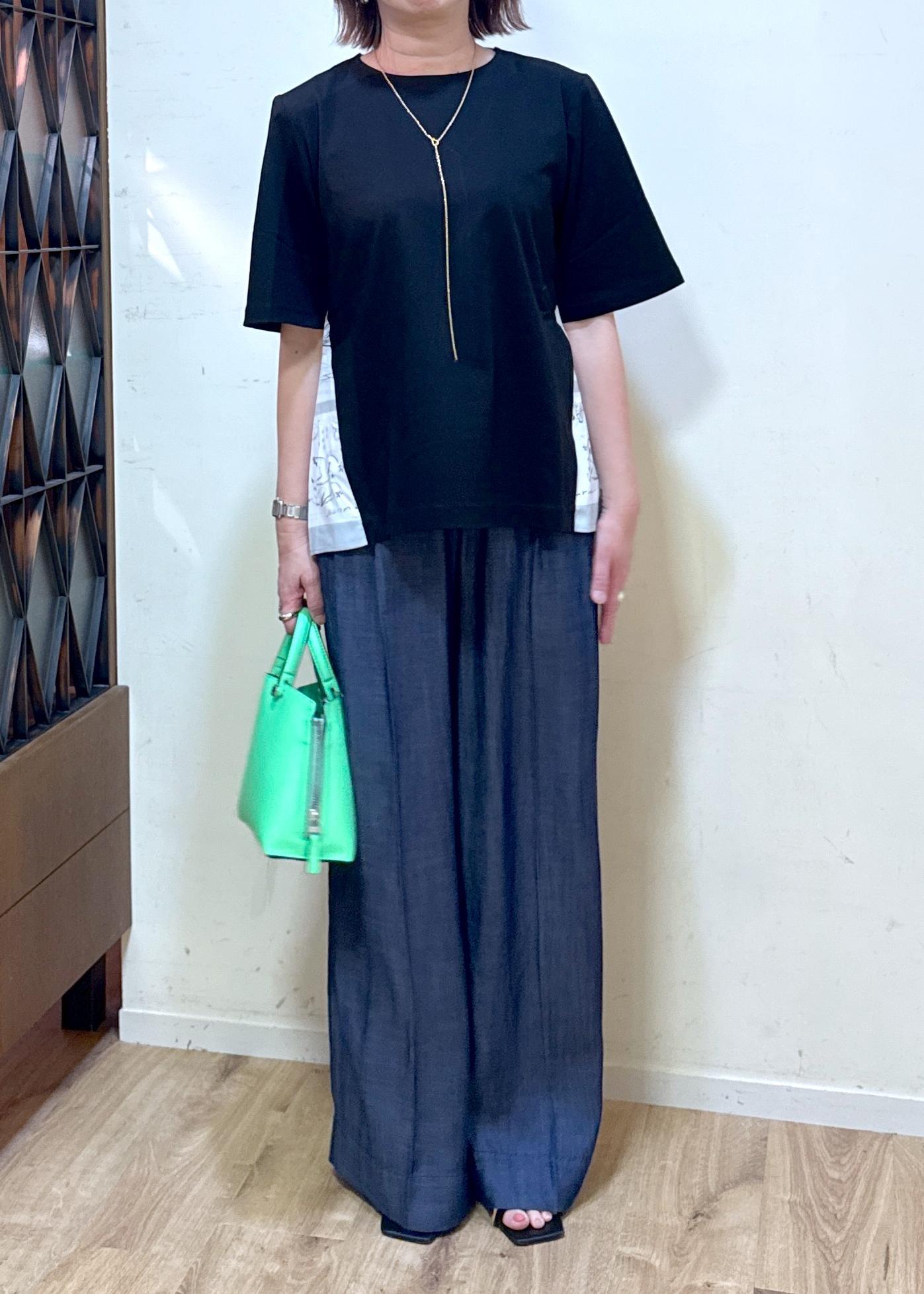 バッグスタイルのスカーフ風の切替カットソーが今までになかったデザインでポイントになります。