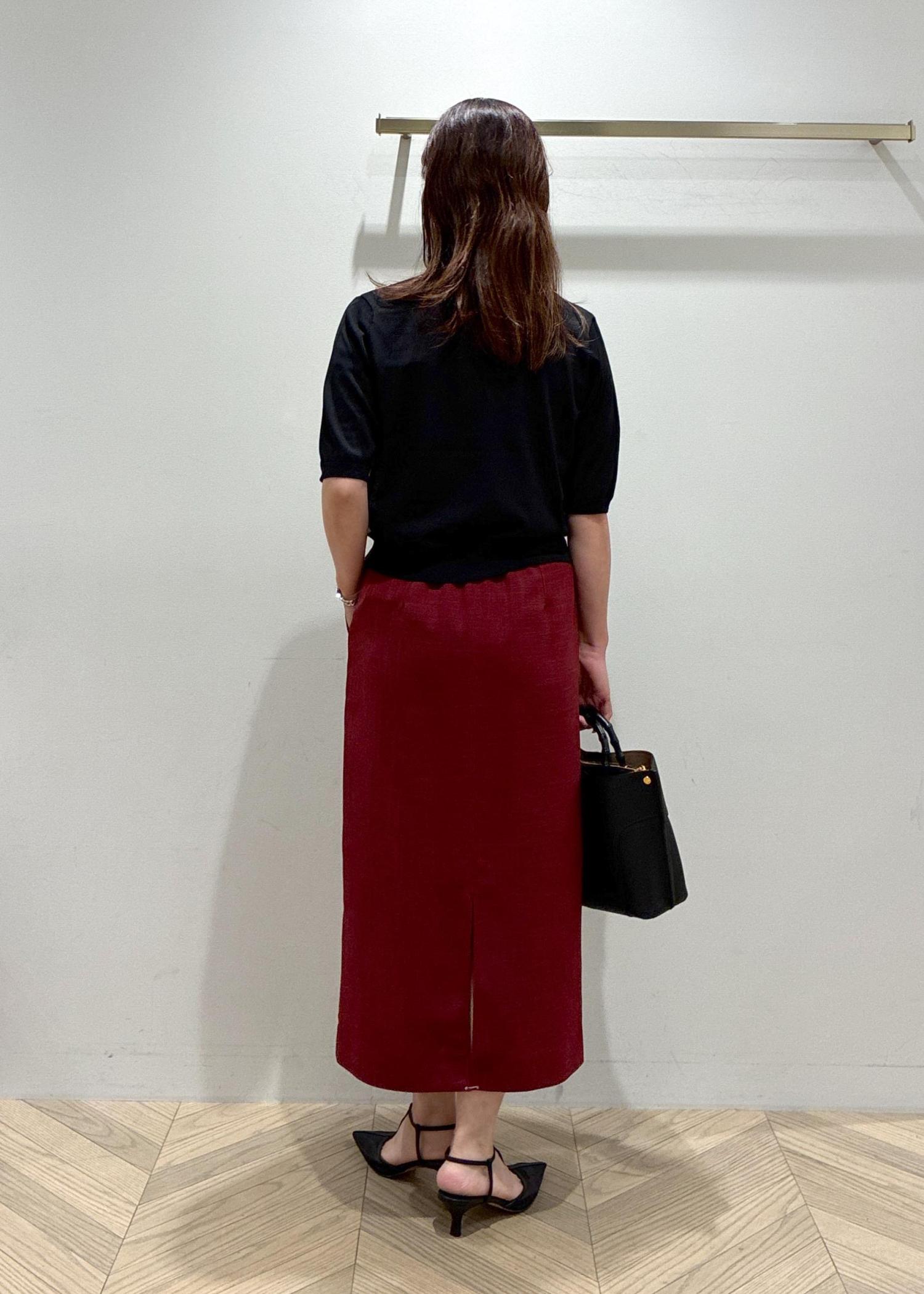 細身のシルエットですが、ウエスト後ろ部分がゴムになっているので窮屈感もなく、ハイウエストデザインでスタイルアップが叶います。