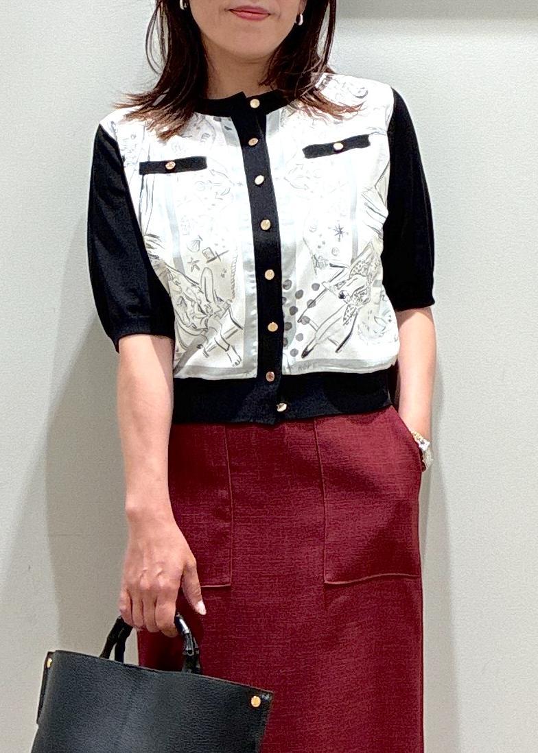 佐伯ゆうこさんがROPÉのために描き下ろしたスカーフ柄とハイゲージニットのコンビネーションカーデ♪